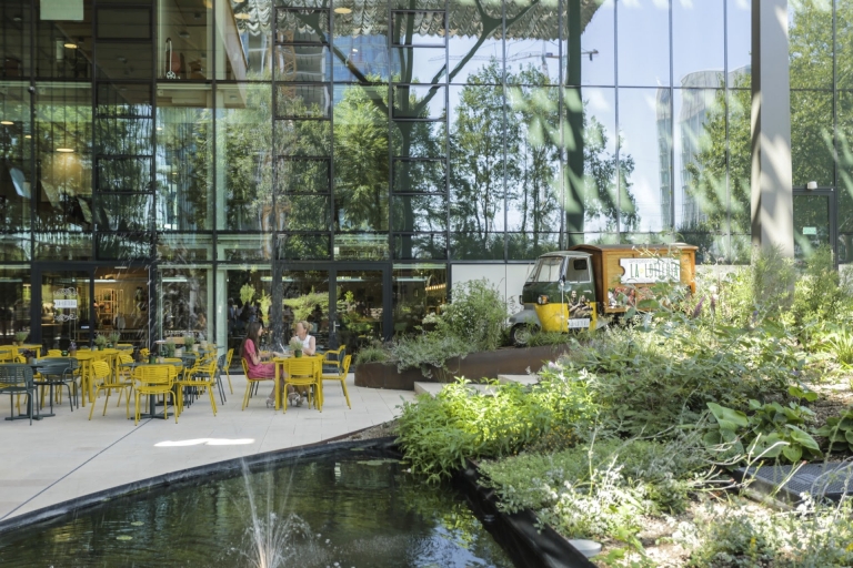 An old transformed building became The Dutch Charity Lotteries office: a highly sustainable, energy positive, mixed use building. Demolished parts of the old building have been reused, and all new materials are sustainable and recyclable and can be repurposed in the future.