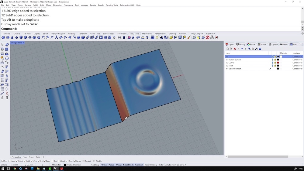 Rhino 7 is the most significant update in our history. You can create organic shapes with our new SubD tools, launch Rhino and Grasshopper as an extension to Revit® with Rhino.Inside.Revit, or use the powerful quadrilateral remeshing algorithm to create a beautiful quadrilateral mesh from NURBS geometry or meshes. This new version opens the door to all-new workflows and refines many of the core features.