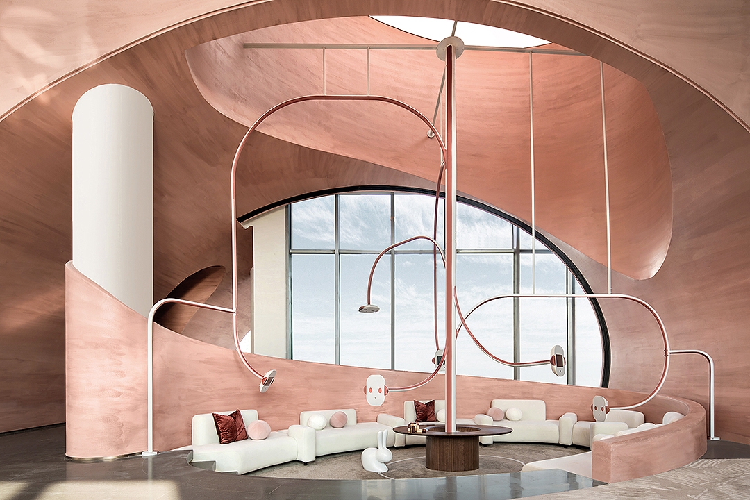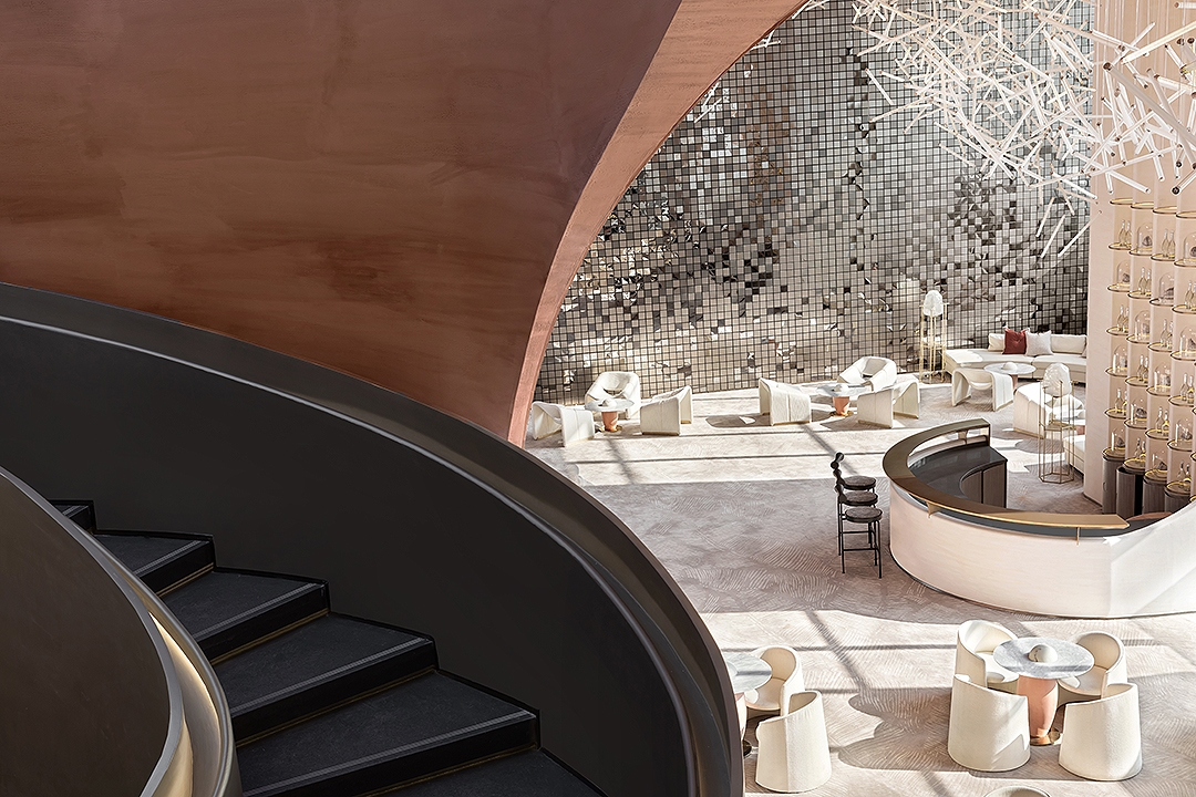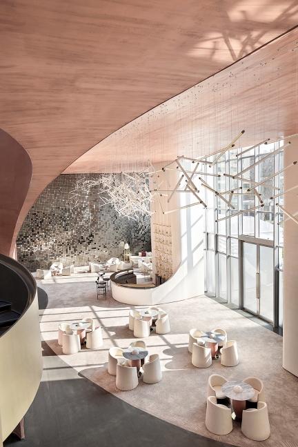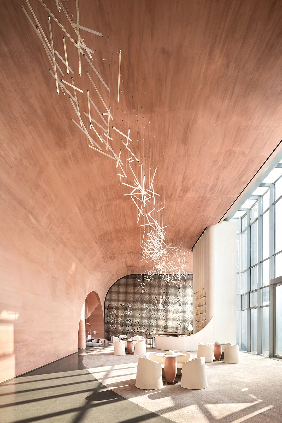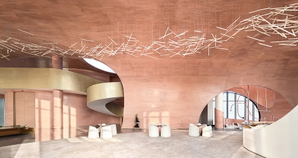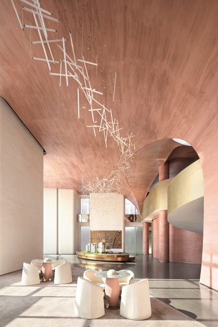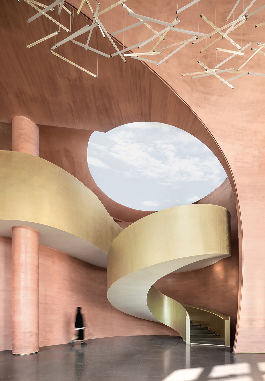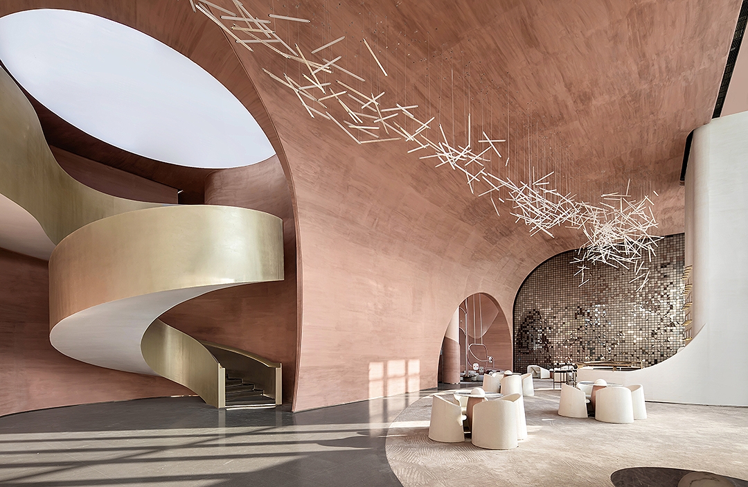 The overall space is formed by intersecting multiple intersecting caverns, allowing the spatial sense of the cave secrets to be fully implemented in the entire spatial logic. The designer hopes to create a sharp sense of scale to bring the illusion of a world away, the bright, open, and full of tension will draw people into the context of the mysterious cavern, the smooth and advanced surface of the space, and the floating art like layers of stalactite. The metal staircase spirals upwards, adding a sense of contemporary art tension to the original rough space. The design strengthens the influence of the staircase on the space. The open space makes it seem like foreign objects from the sky traverse one side of the cave hall.