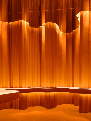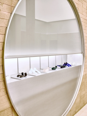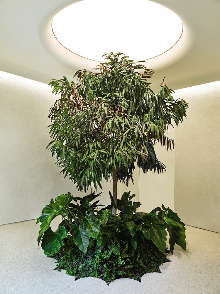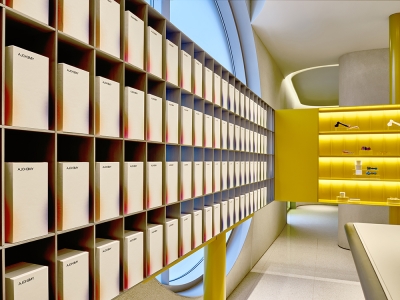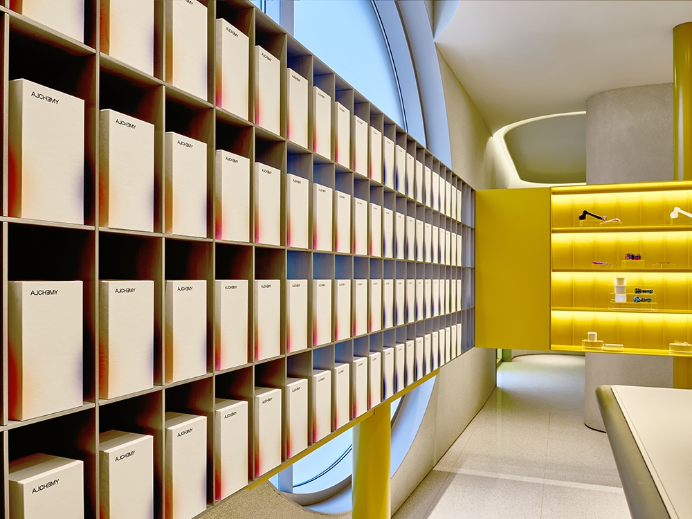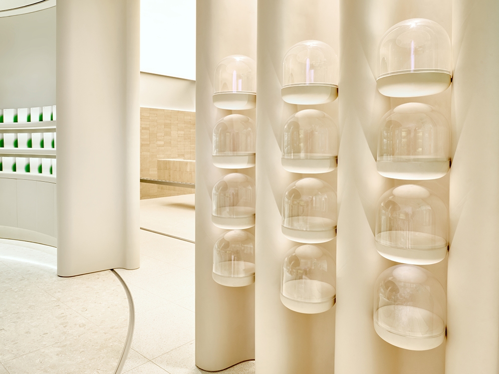 Not dissimilar to this alchemic transformation, the flagship melds high-tech ingenuity with natural materials. The apothecary-like space lands somewhere between a laboratory and a temple. It is a serene environment with energetic bursts. The store was designed around how customers move through and shop the space. Customers who know what they want in advance can pre-purchase online and take an expedited checkout route inside, but for those interested in browsing, a delight for the senses awaits in a sequence of unique zones.