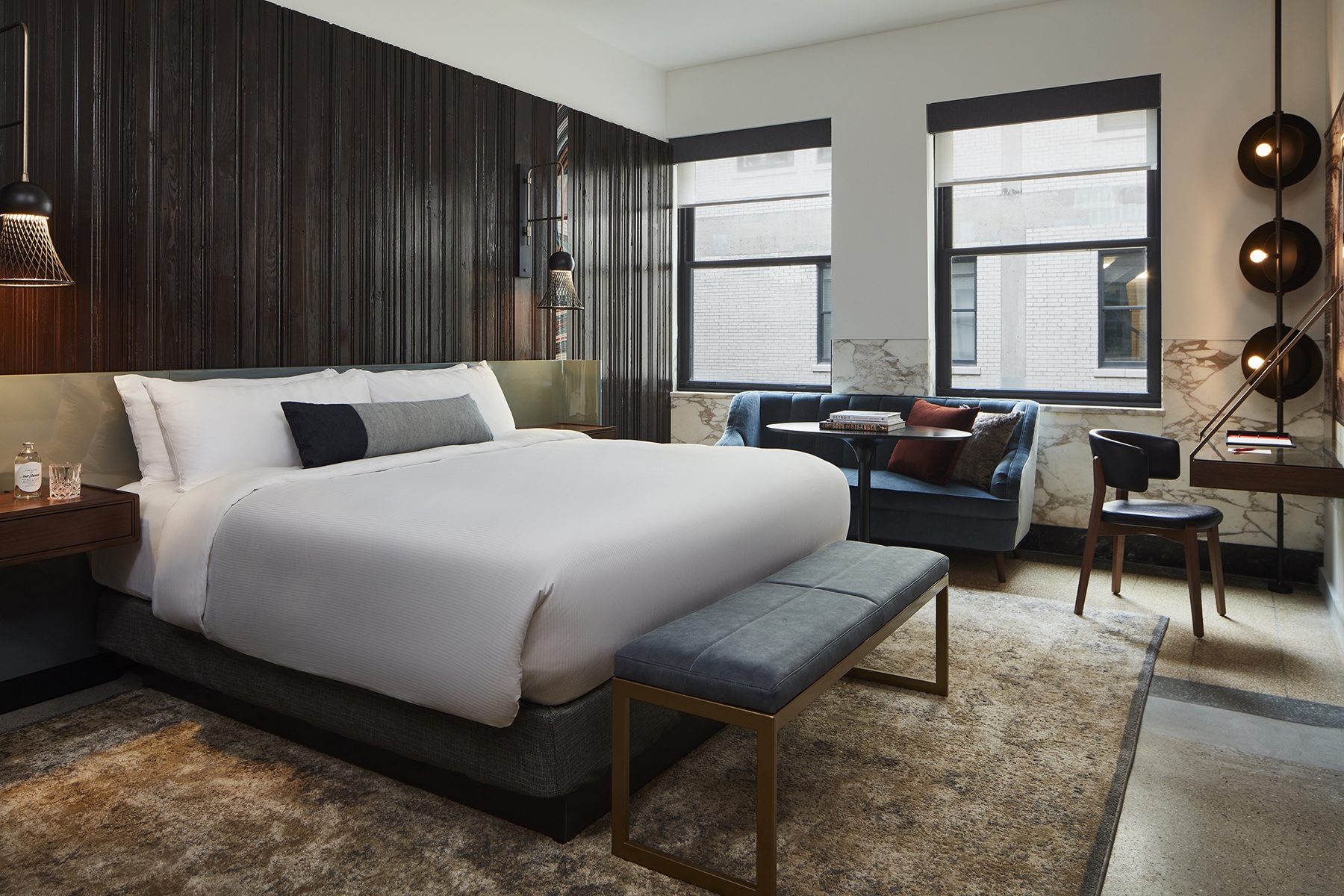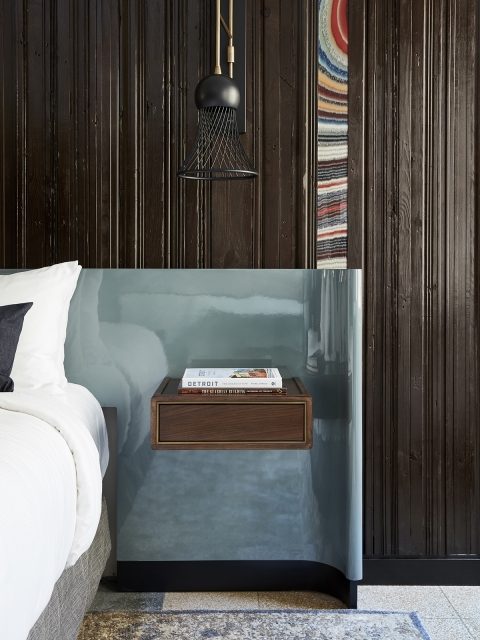 Guestrooms feature salvaged trim, molding, and an artistic interpretation of Fordite as a headboard inlay, while photographs of local landmarks grace the room in the form of custom wallcoverings. Hues reminiscent of 1960s automobiles punctuate the clean, modern guestroom color palette of chocolates and metallic pastels.