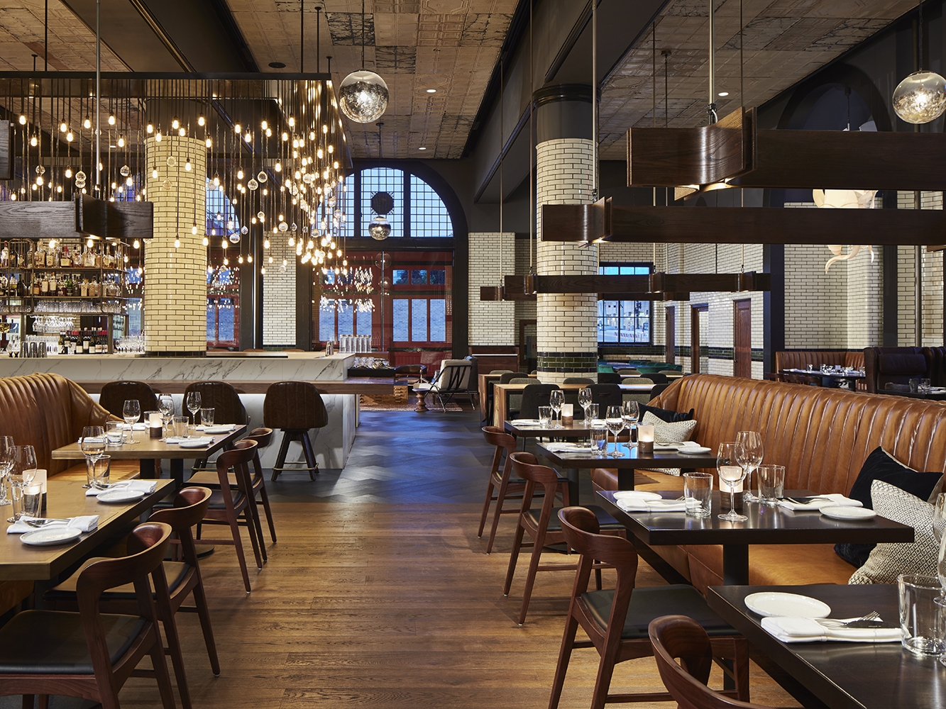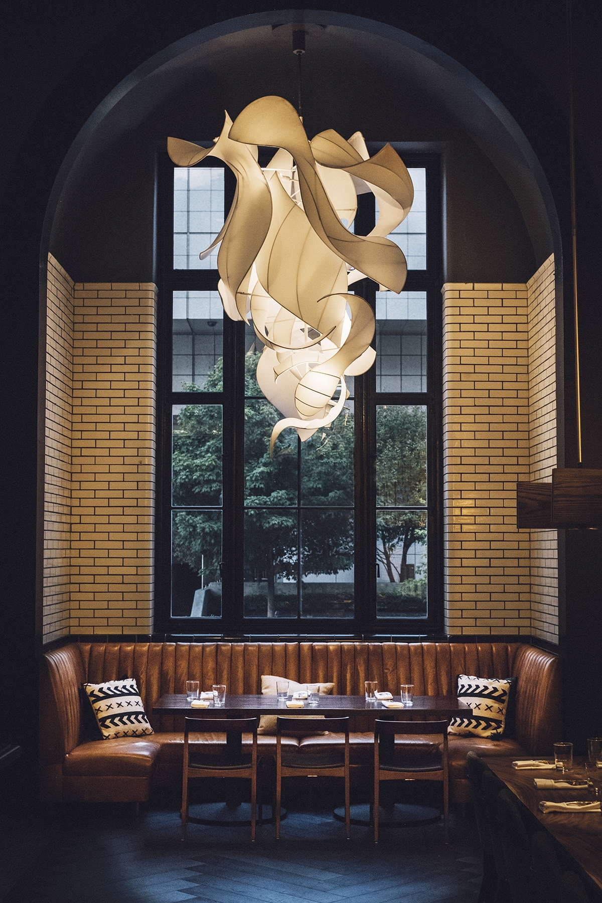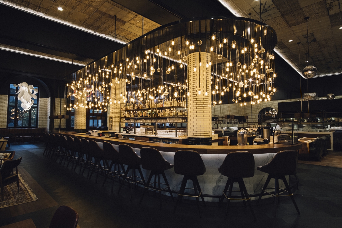 A monumental custom chandelier containing hundreds of exposed-element LED lamps and hand-blown glass encircles the bar and serves as both a lighting source and an art installation. Intentionally positioned in the direct sightline of guests is a second chandelier – this one resembling an abstract smoke-inspired structure.