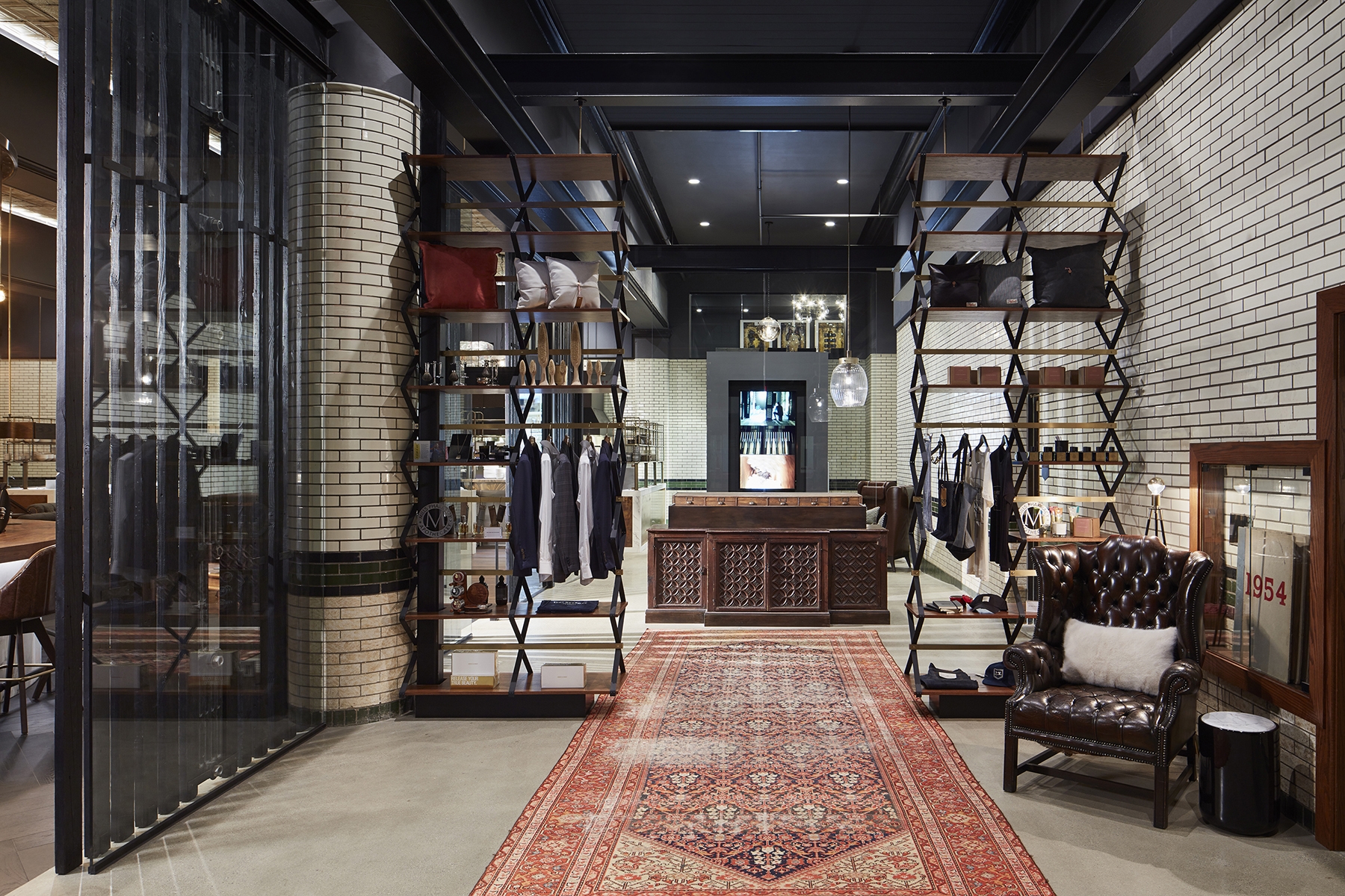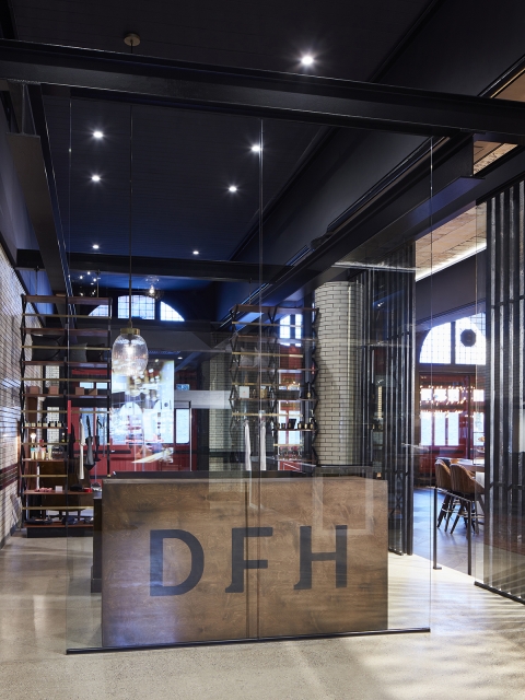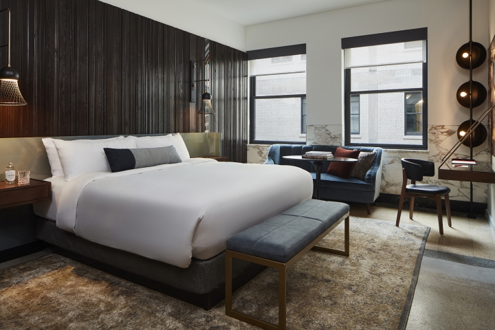 Entering the five-story Neoclassical building through a massive, arched portal, guests are transported into a story-and-a-half space that once housed fire engines. Existing glazed-brick tiles celebrate the building’s history while new finishes and lighting add modernity. A brass metal rail system reminiscent of a fireman’s pole highlights the strong architecture of the space.
