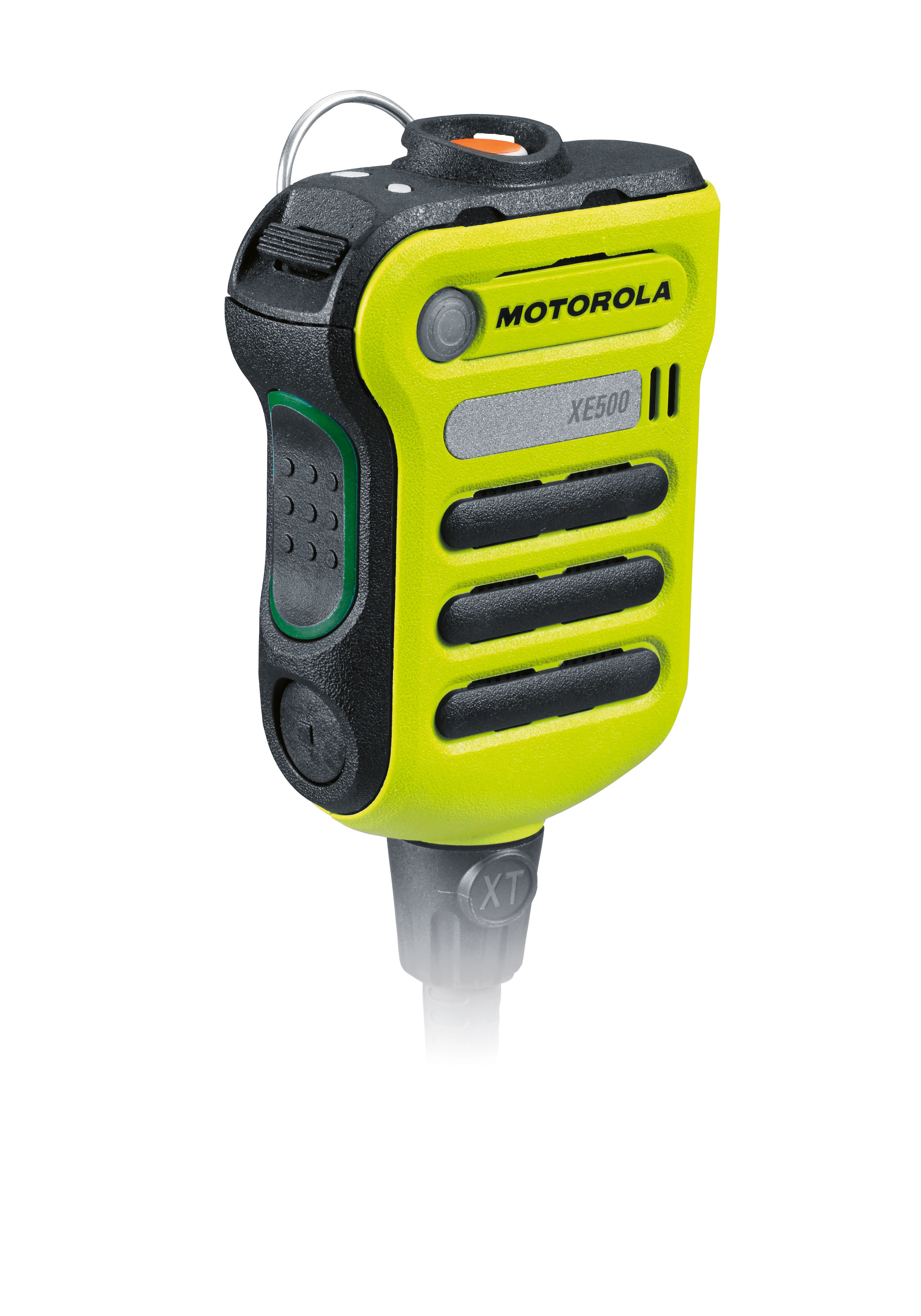 APX™ XE500 Remote Speaker Microphones (RSMs) are designed with the user’s extreme environment in mind. These RSMs feature an asymmetrical shape to help you find the controls without looking, even while wearing bulky gloves. The large push-to-talk button and an extra-large emergency button, which illuminates orange when activated, are easy to locate, but shielded so they're not accidentally activated.