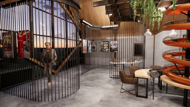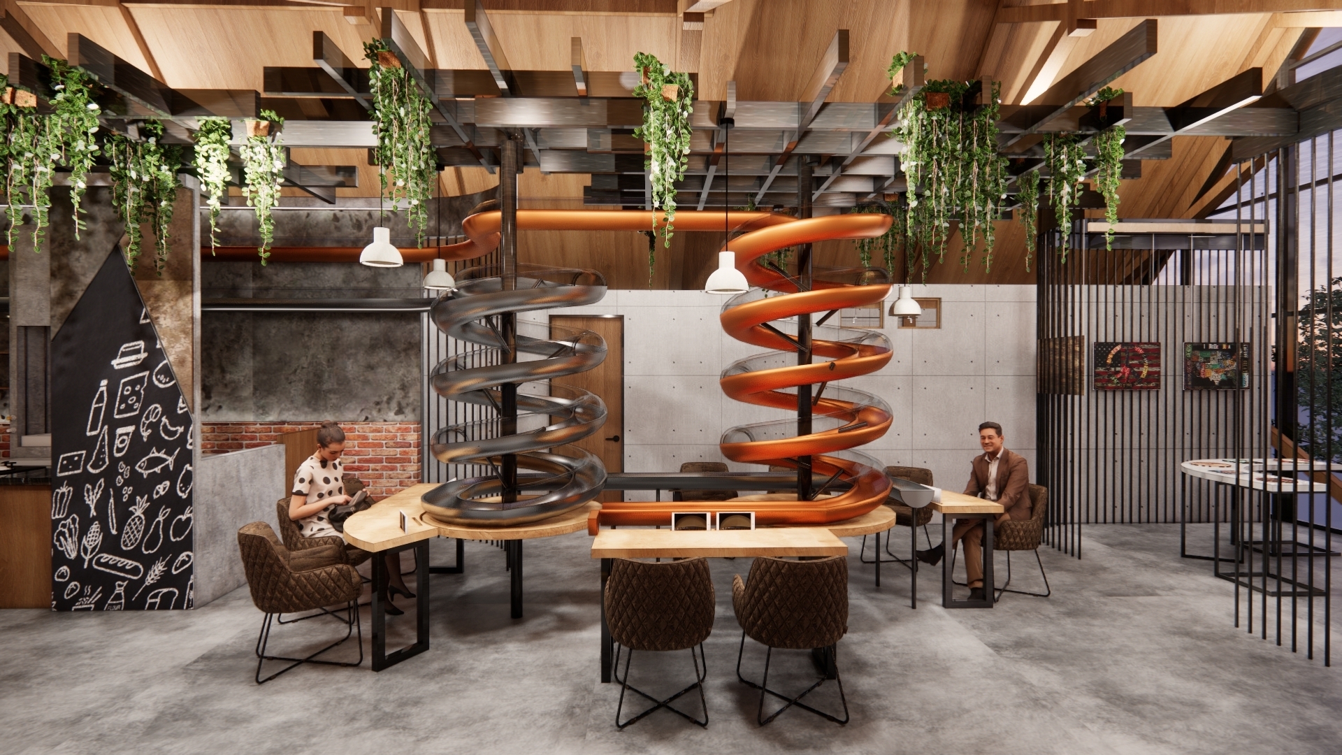 The delivery pipe is the way to deliver the meal using the track slide, the lower half is made of metal, to give the surface a unique metallic sheen, the upper part is made of clear glass, let the customer see for himself the process of delivering the food. pleasant meal, after the outbreak, it can also be one of the city's most specialty restaurants.