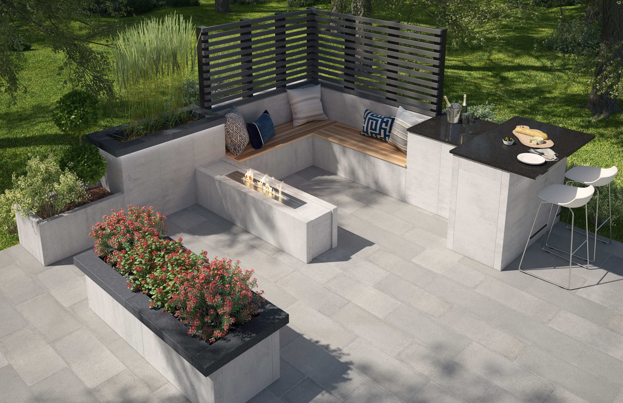 Artforms (Artex) is the hardscapes industry’s first completely finished modular concrete panel system. Artforms offers clean lines, smooth texture and an aesthetic that is unmatched in the outdoor living category, offering a modern yet timeless look at a reasonable price. The innovative system allows the pre-formed concrete panels to be configured and affixed with simple, stainless steel hardware that is adjustable, allowing for personalized configurations.