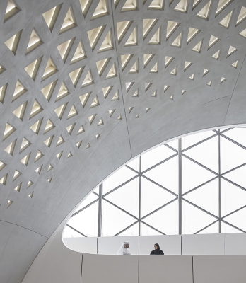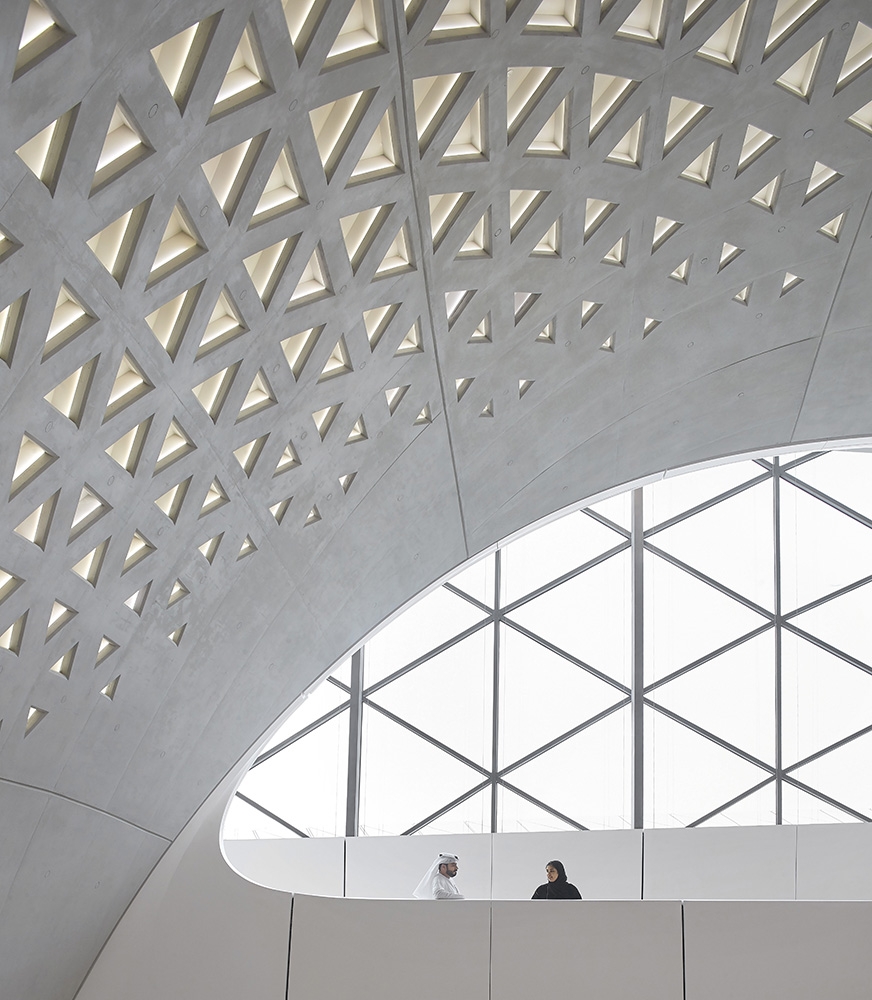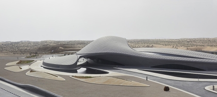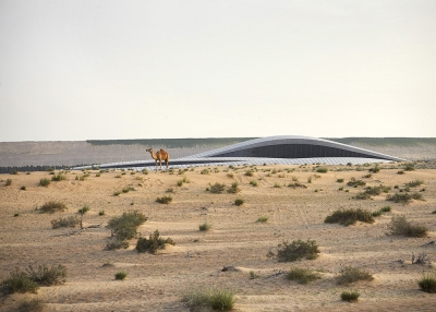 Its design responds to its environment as a series of interconnecting ‘dunes’ orientated and shaped to optimize local climatic conditions. Embedded within its context of Sharjah’s Al Sajaa desert, the design echoes the surrounding landscape shaped by prevailing winds into concave sand dunes and ridges that become convex when they intersect.