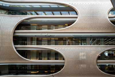 Located adjacent to Feixiang Park metro station, Infinitus Plaza straddles the metro’s sub-surface tunnel, dividing the headquarters into two interconnected buildings designed around central atria and courtyards as a series of infinite rings that enhance interaction and communication between all departments.