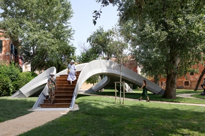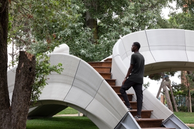 Striatus, an arched masonry footbridge composed of 3D-printed concrete blocks assembled without mortar or reinforcement. The first of its kind, it combines traditional techniques of master builders with advanced computational design, engineering and robotic manufacturing technologies.