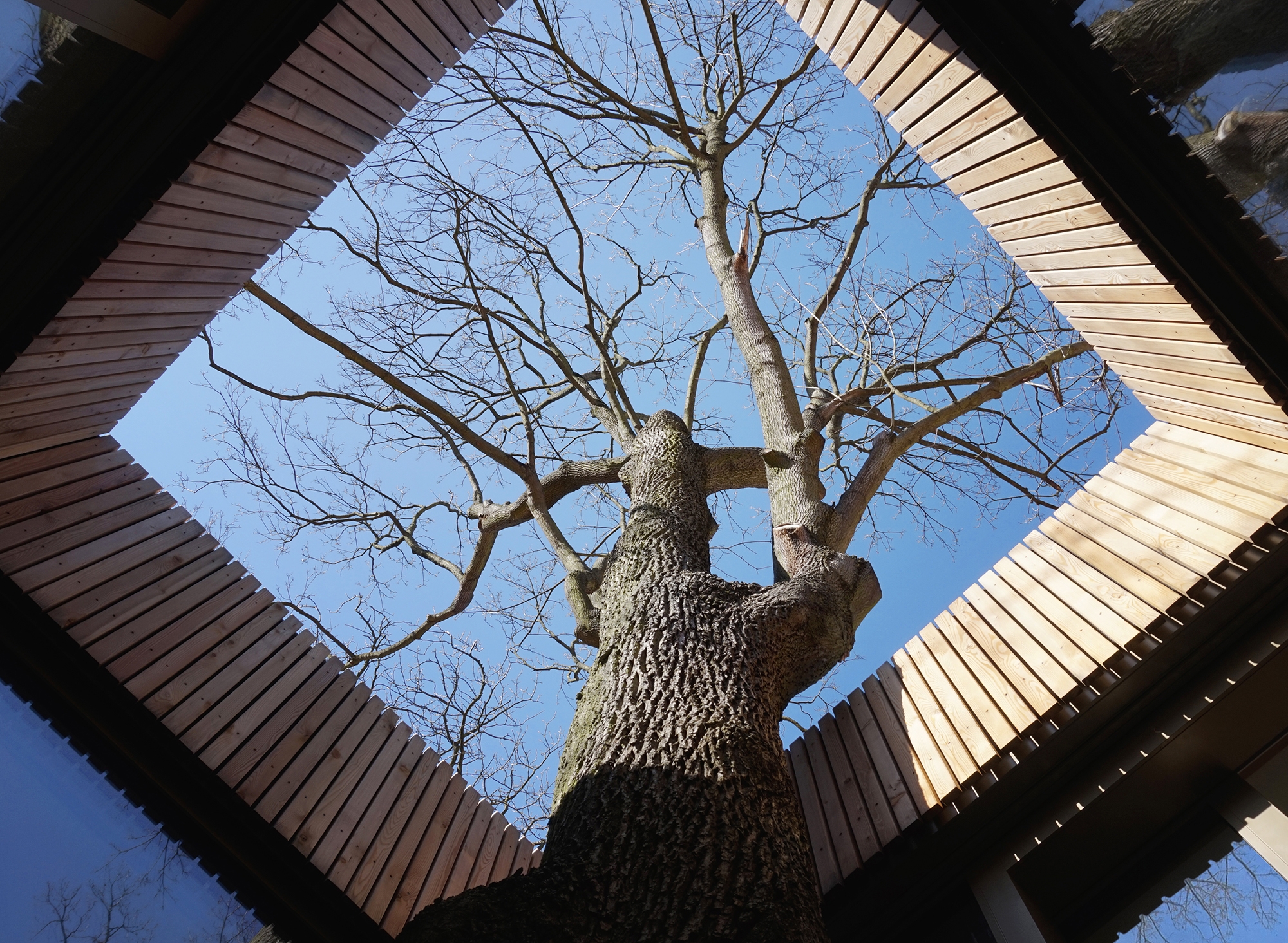 25 years after the fall of the Berlin Wall, a modern tree house on stilts was built on the historic lake property in Potsdam. Ancient trees, the water and nature preserved terraces determined the concept. Today the wooden house stands on 40 diagonal steel posts, with 10 individual foundations touching the imperial terraces in a respectful way.