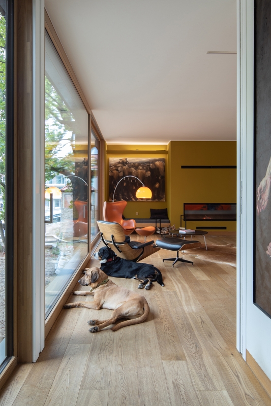 The house integrates unobtrusively into the crowns of the age-old trees. Even the large maple that stood in the way of the house was left untouched and is now growing tall, right in the middle of the living room.