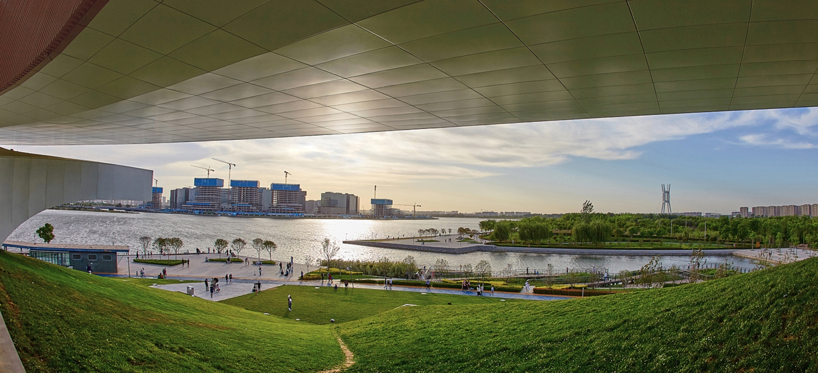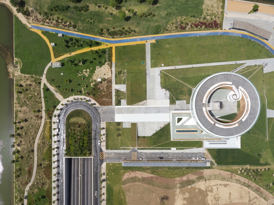 Located in the waterfront public park along the lake shore, the Center requires two major art exhibition spaces. One is with minimum daylighting for multimedia display; another with the possibility of sight-seeing. In order to limit its impact on the surroundings, we positioned the former on the ground floor and buried into a green mound. The major volume visible from city is the latter, in a form of a big ‘ring’, hovering above the land. The floating ‘ring’ expresses its truss work, celebrating the city’s achievement.