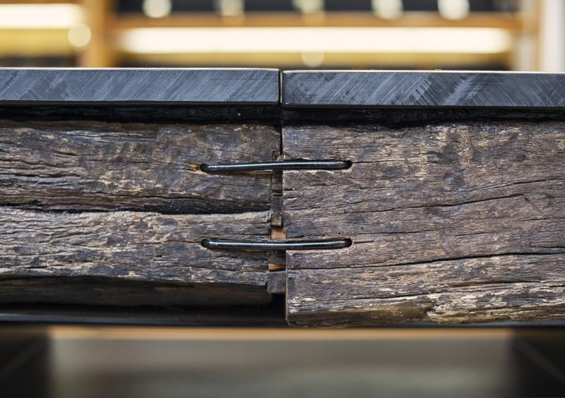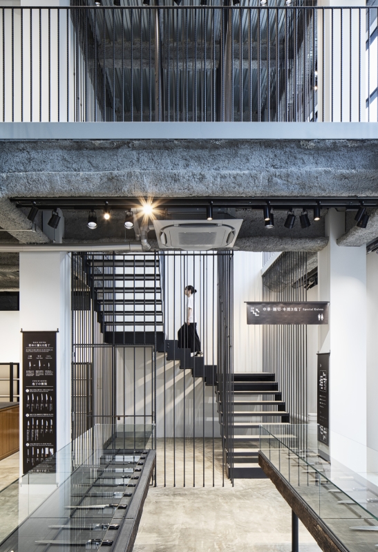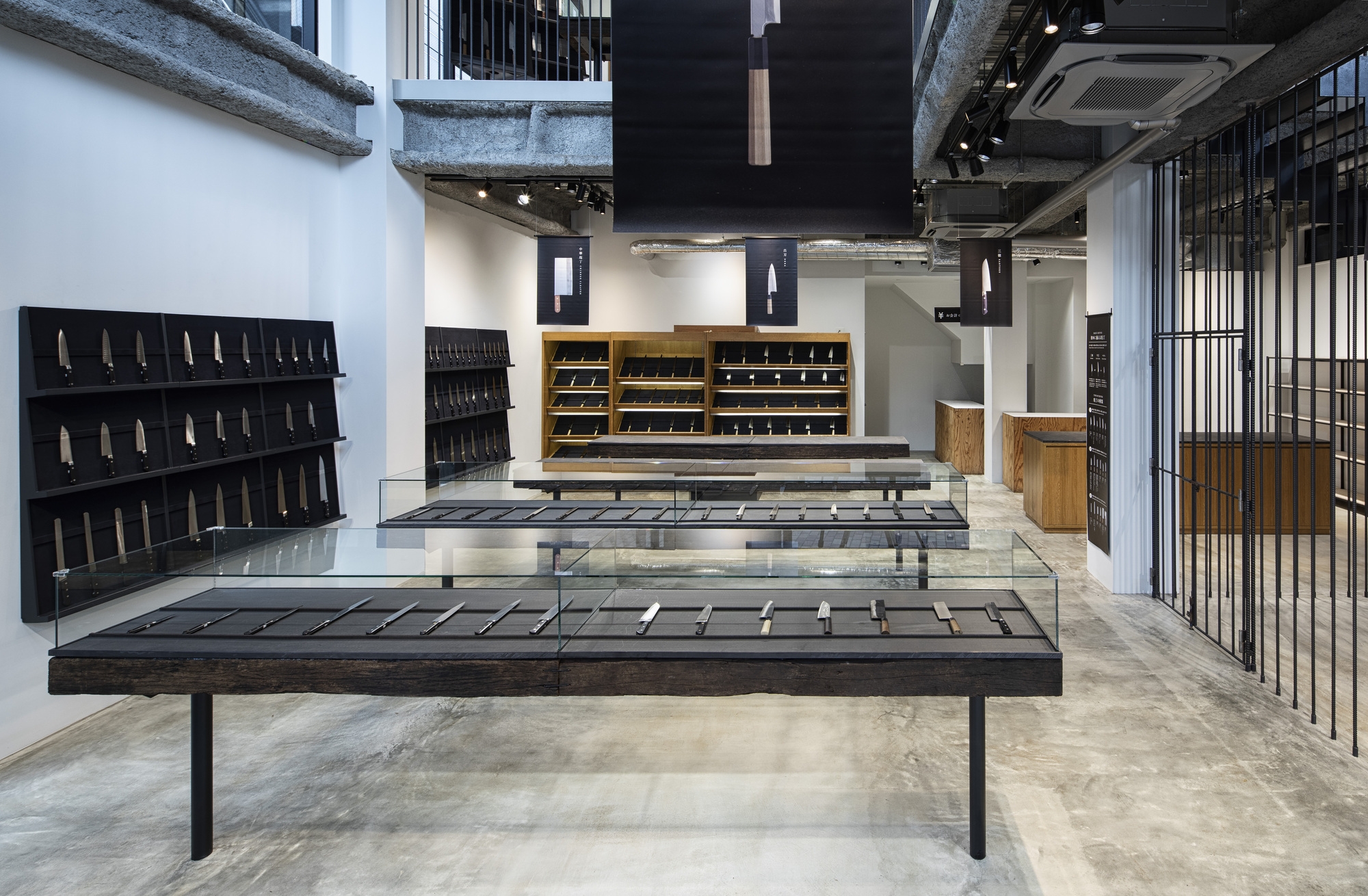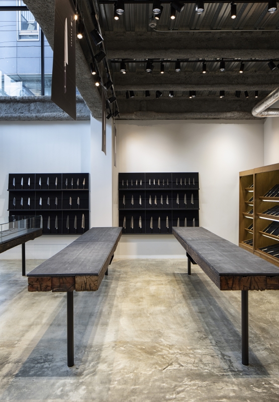 The knives’ shelves are made from railroad ties. They express the long history of knives that can be used for many years.
