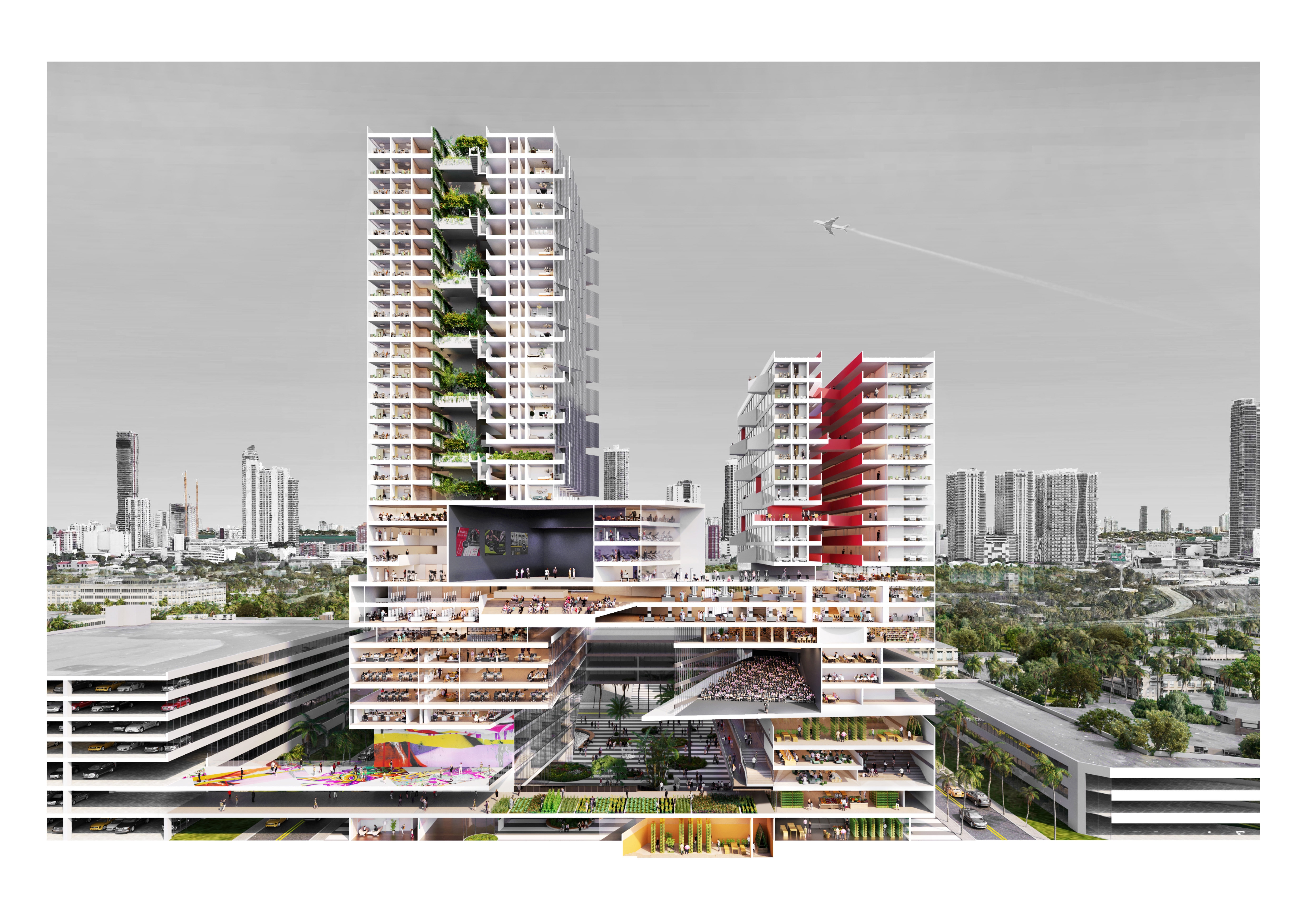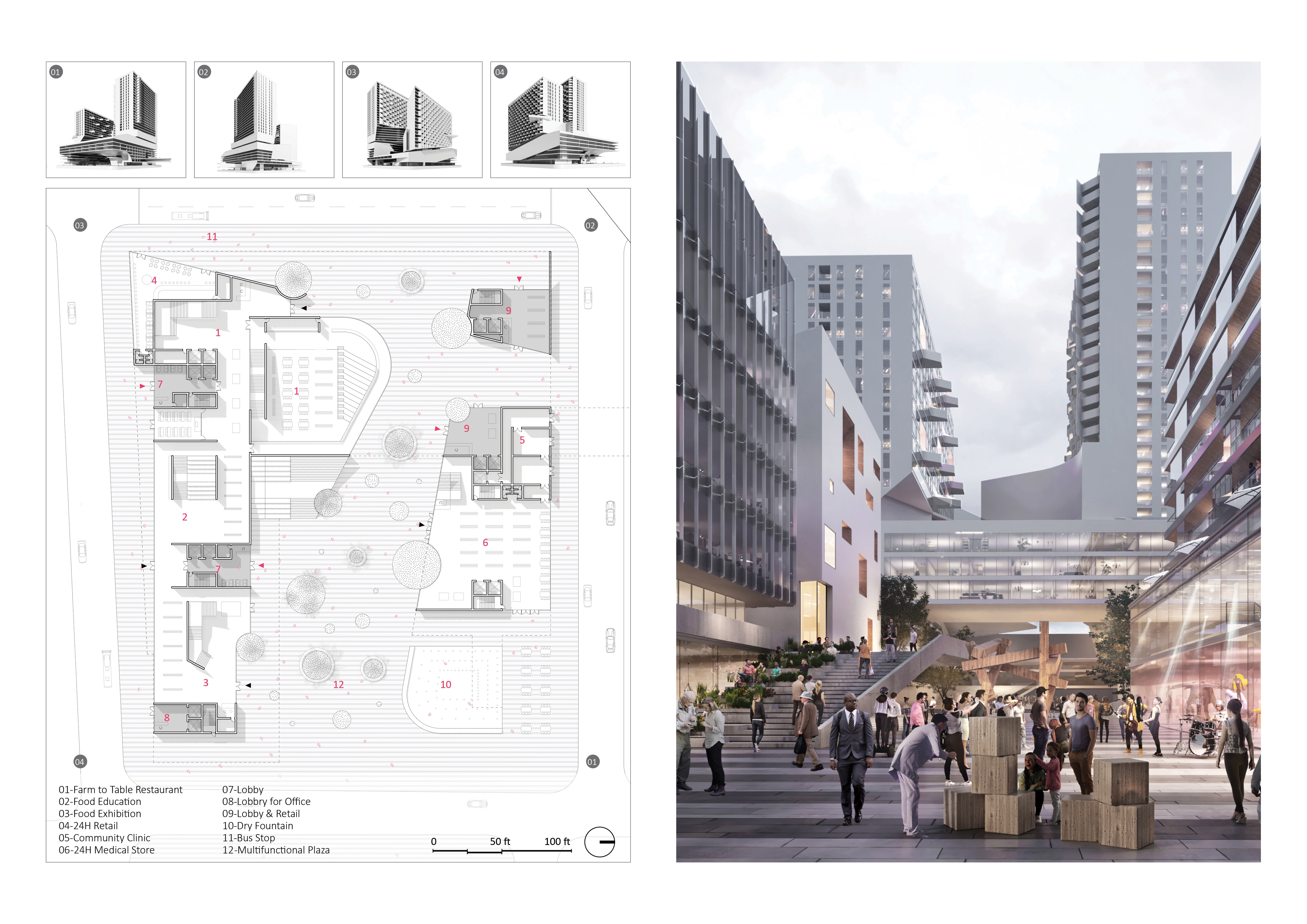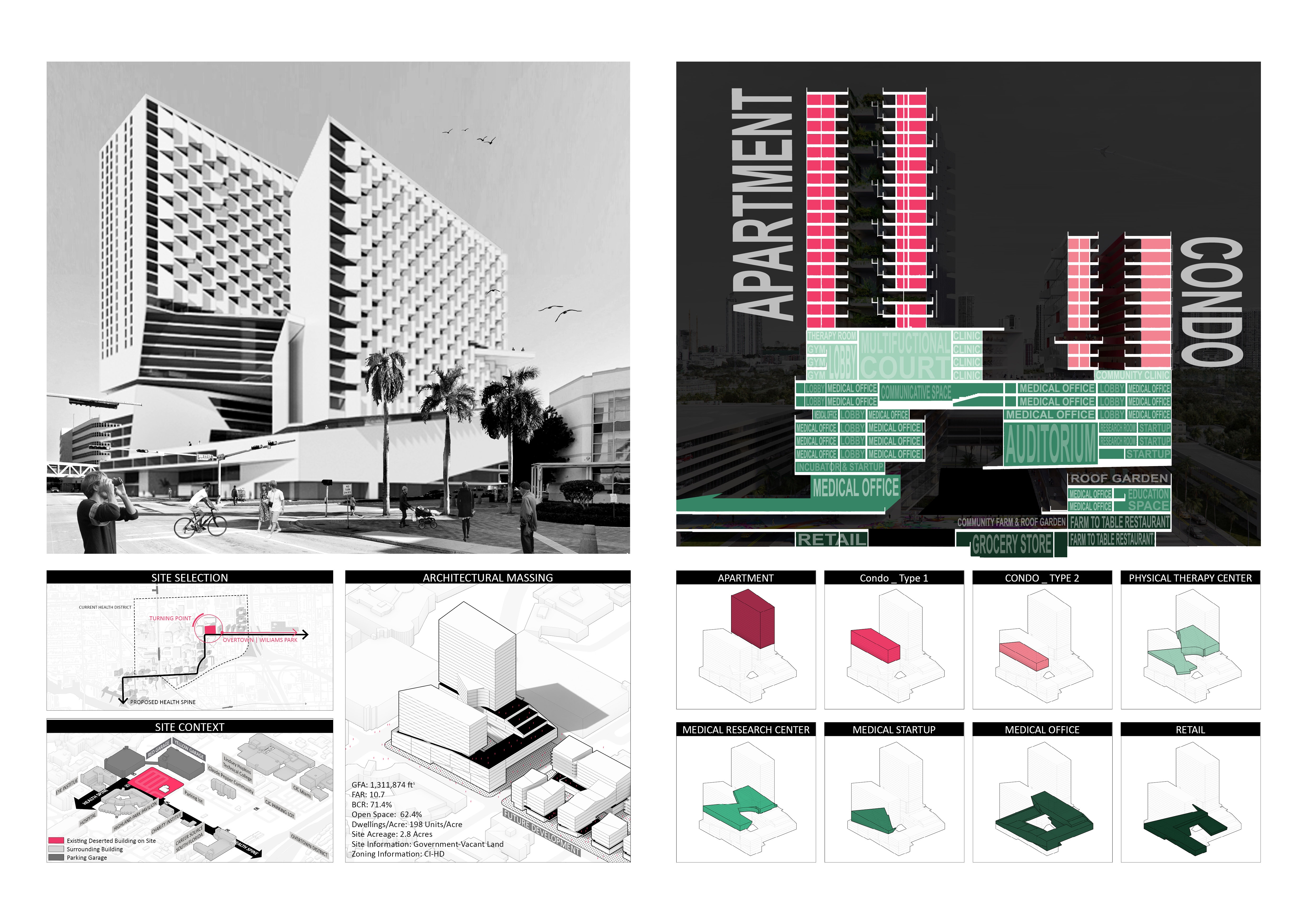For the architectural scale, by bringing 448 units of mixed-income housing, medical office, medical community–oriented facilities, and retail into a single complex vertically, the design meets market needs to provide a quality, healthy environment for locals and future tenants.