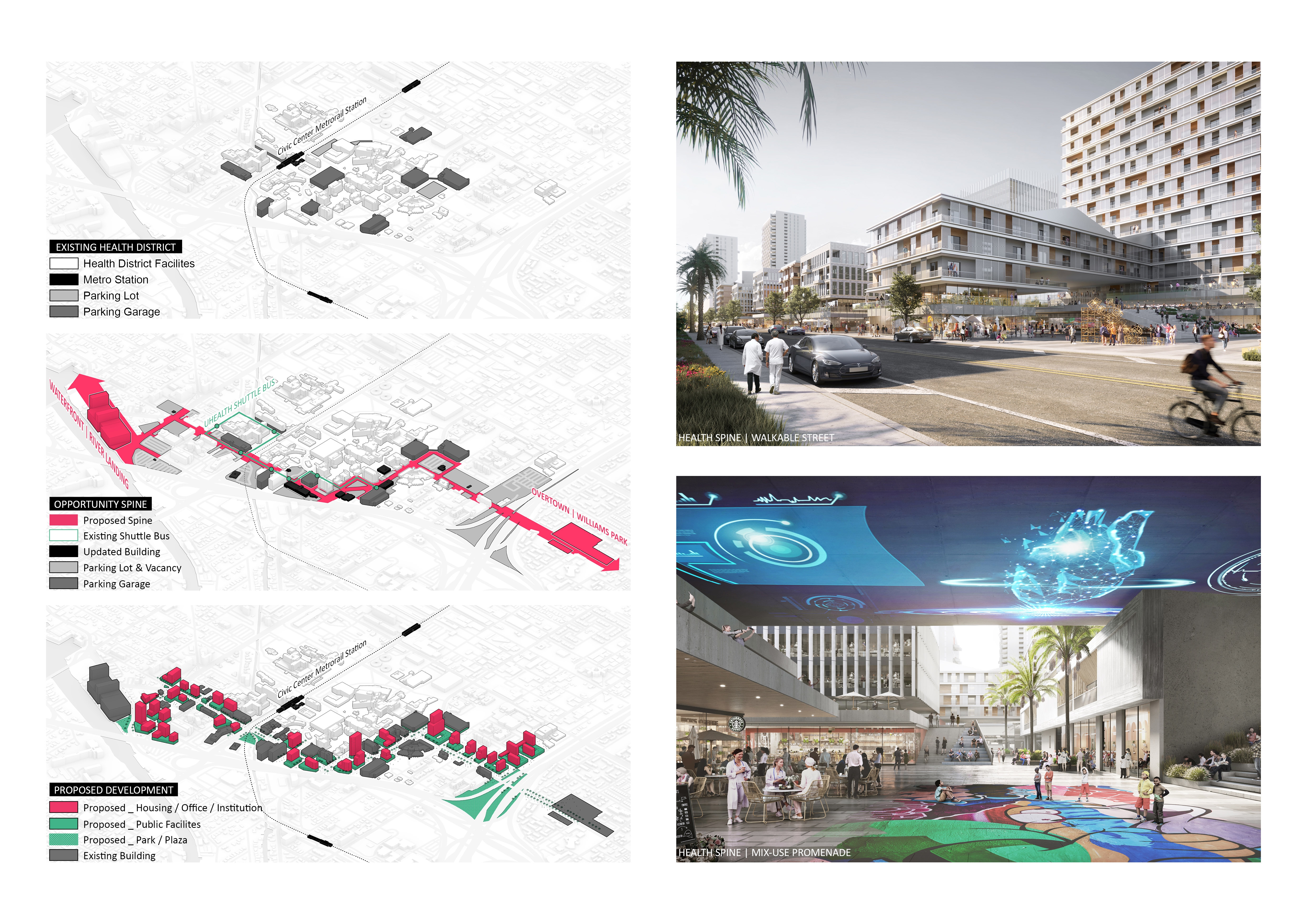The Health District is home to the second-largest concentration of medical and scientific facilities in the US. Due to its singular purpose, the area—which bustles with activity during the daytime—becomes a ghost town at night, leaving only patients, night shift employees, and merciless machines. URBAN HEALTH CATALYST strives to provide an accessible living environment for healthcare employees by introducing mixed-income housing and health-themed programming to the institutional Health District. We also plan to utilize the healthcare resources to stimulate the surrounding distressed neighborhoods.