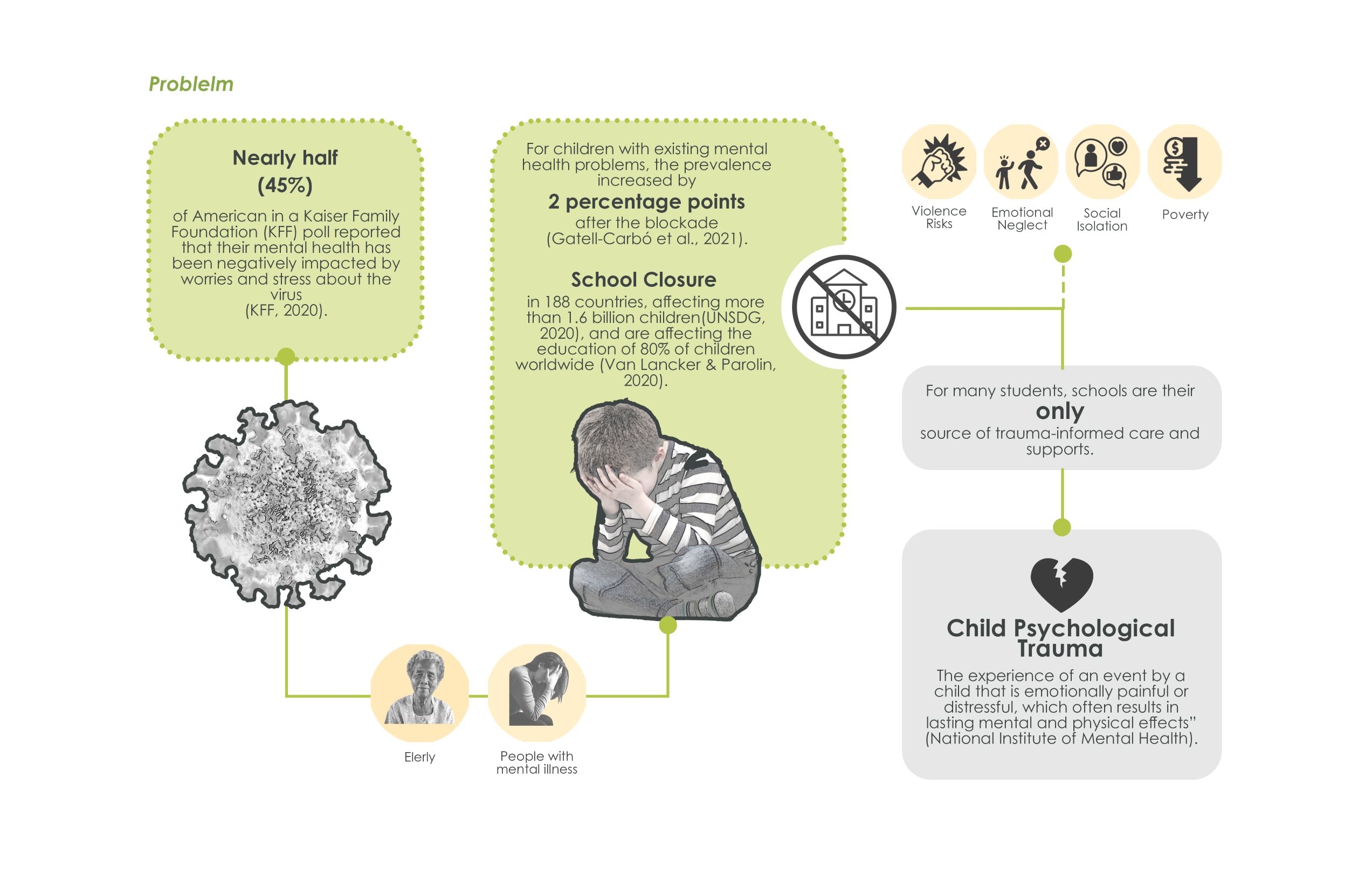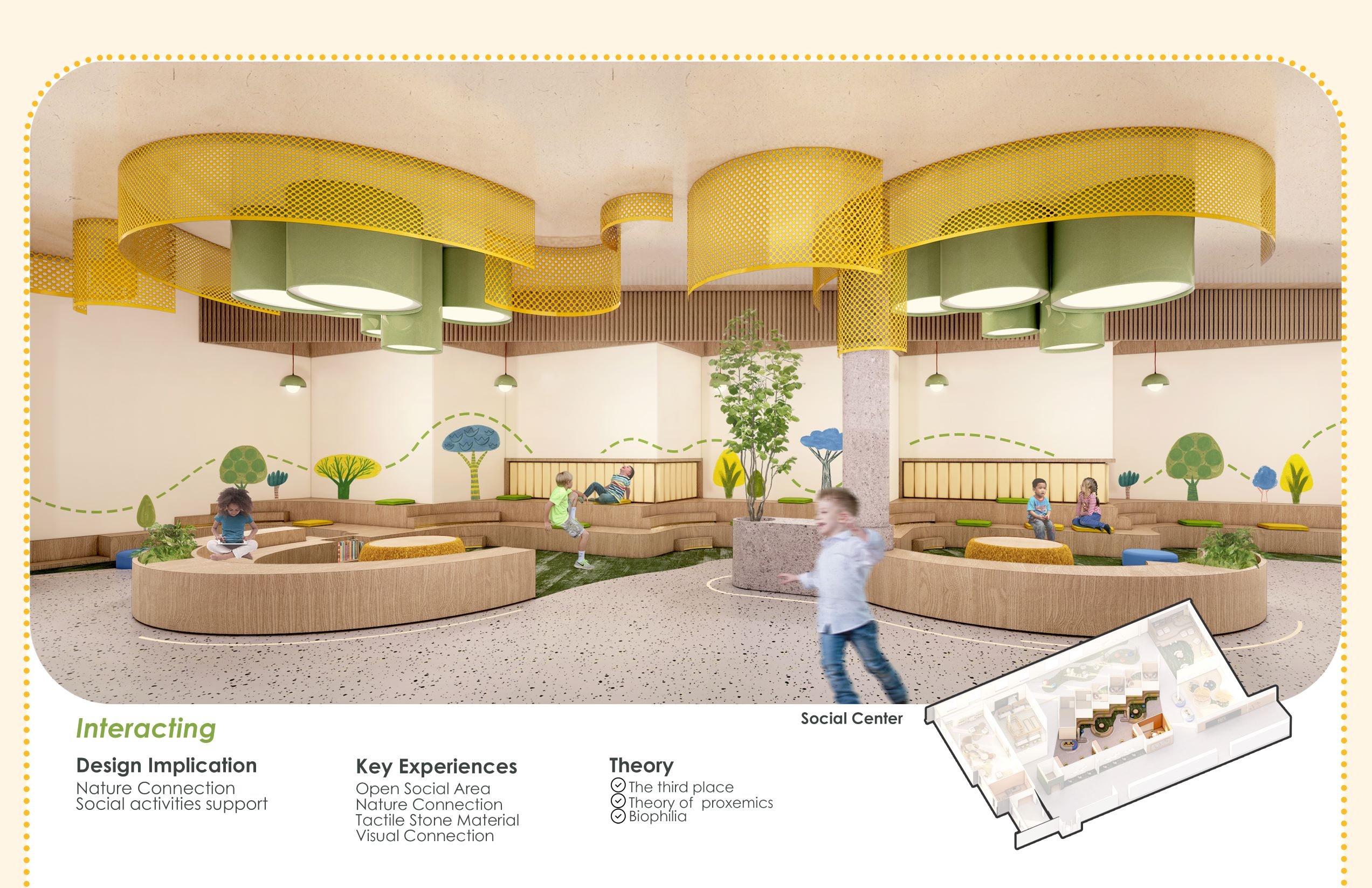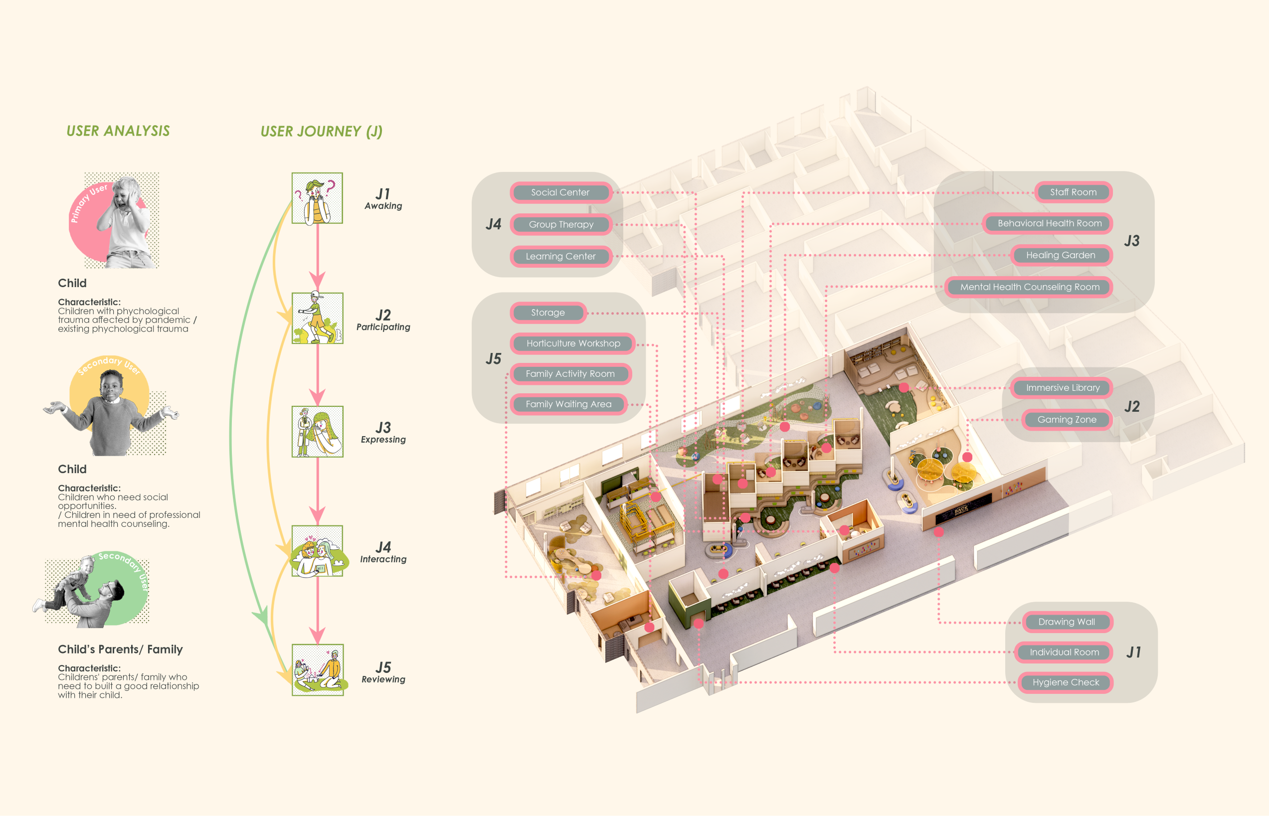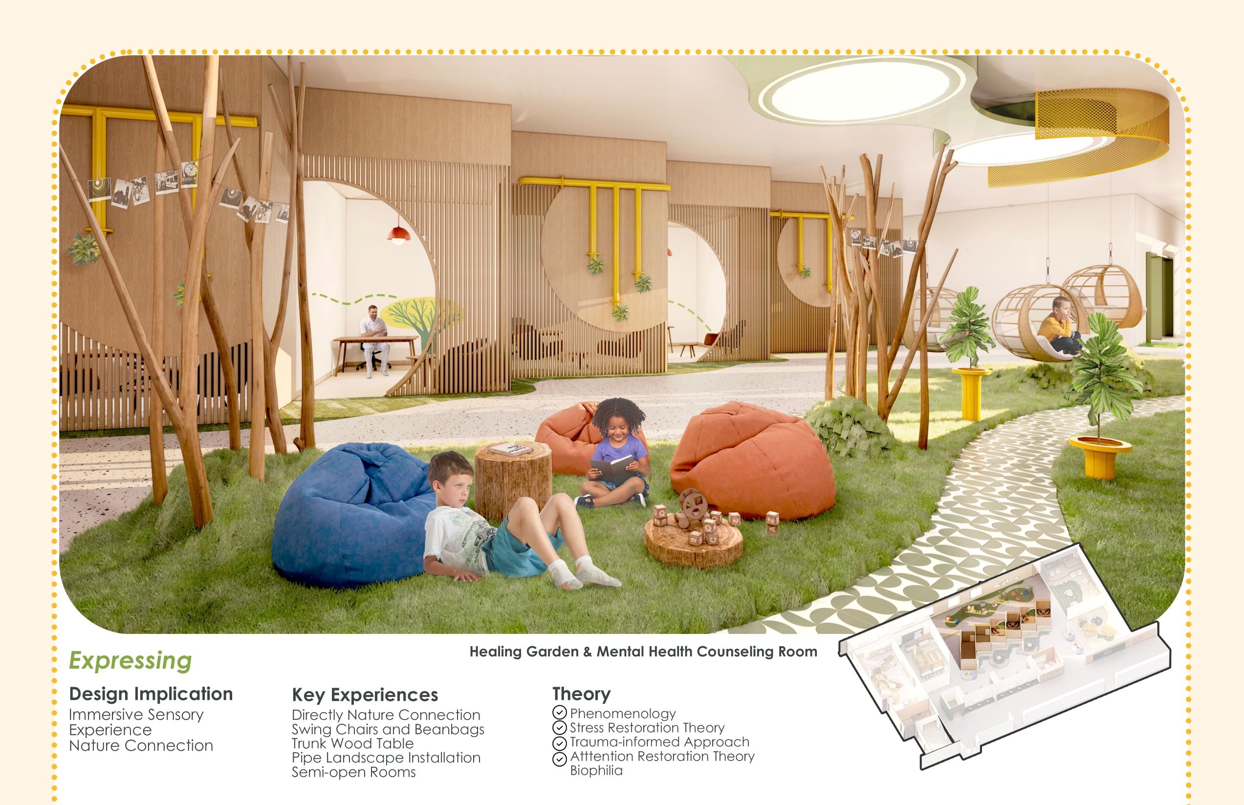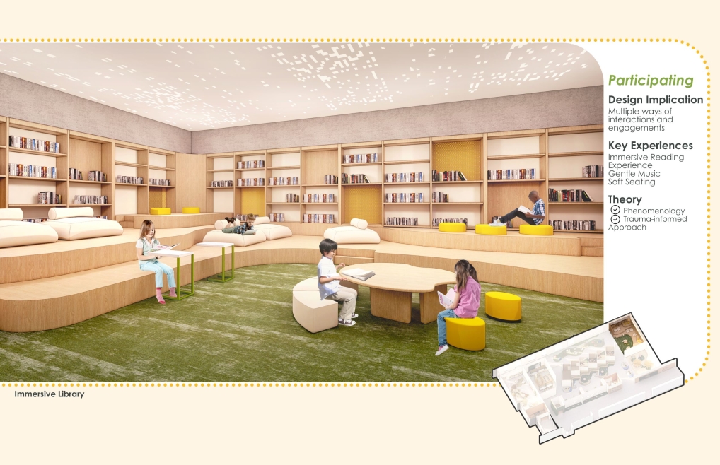 The design focuses on the increasing possibility of psychological trauma of children affected by the pandemic, due to restrictive policy on closure of school, which is students’ only source of trauma-informed care and support. The purpose of the design is to try to find how the interior design helps traumatized children recover, in order to address the lack of design with healing function integrated with school. The design implications are dedicated to motivating users to engage in social activity and immersive experience, therefore improving the recovery efficiency of psychological trauma.