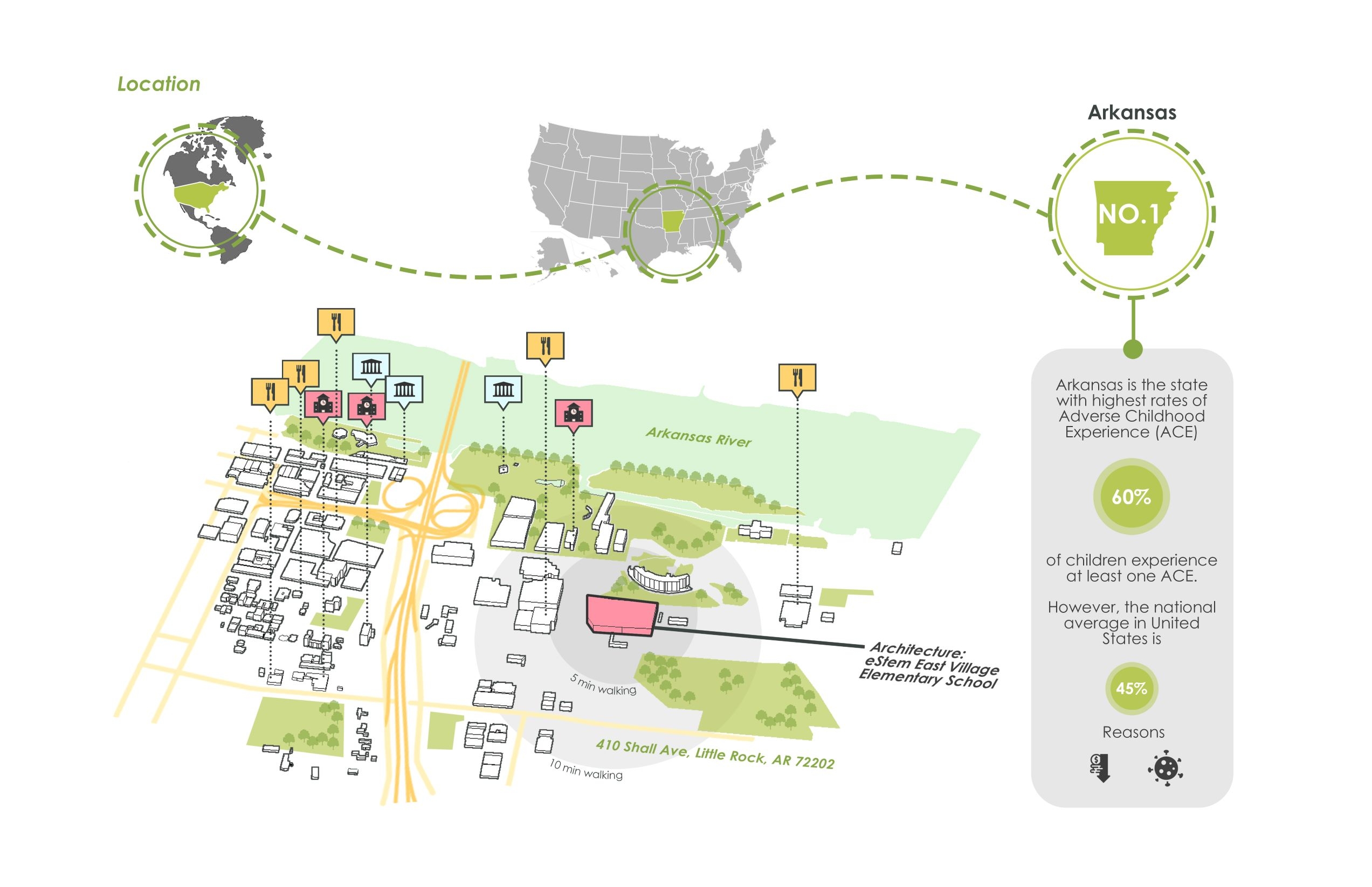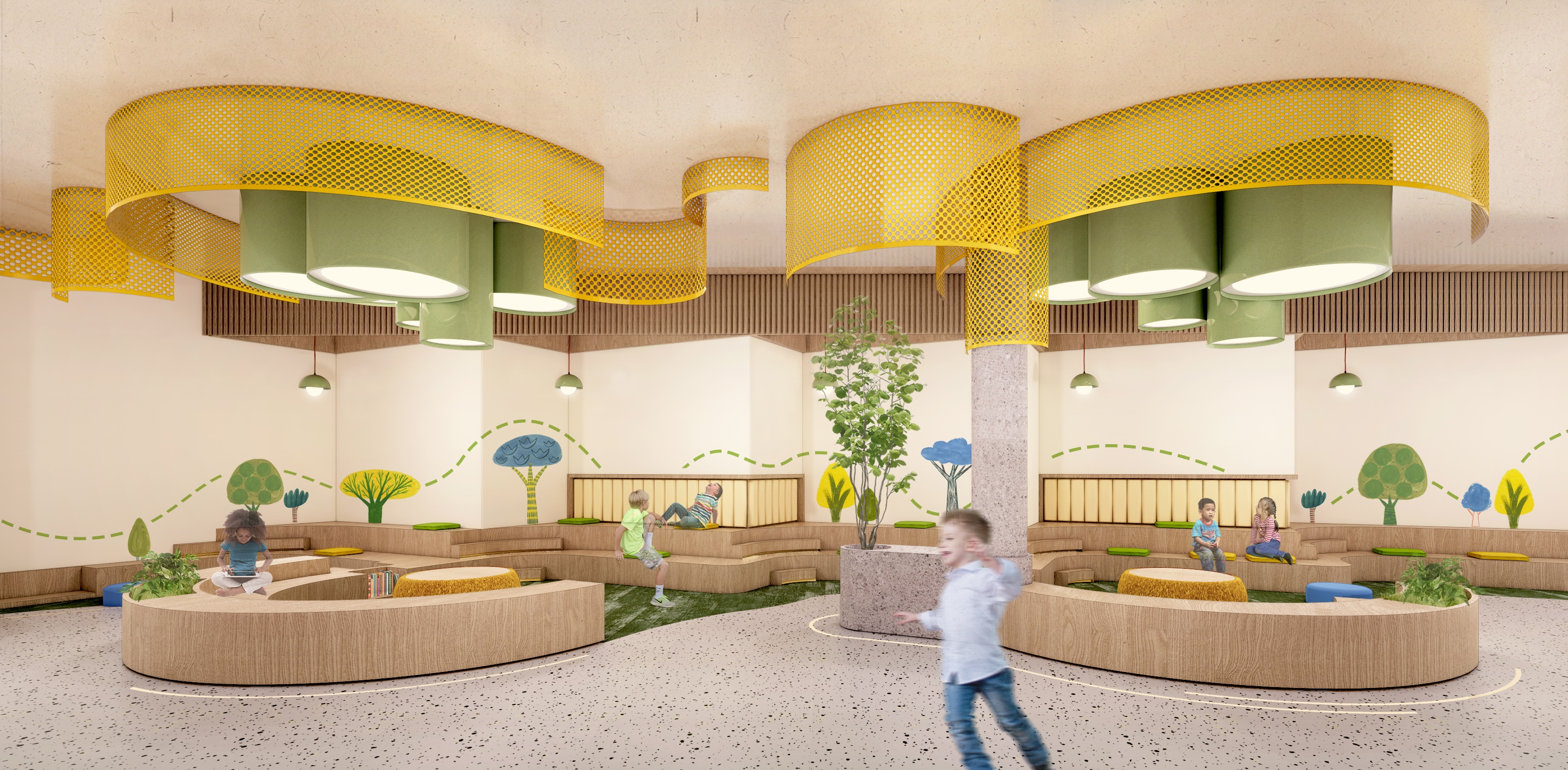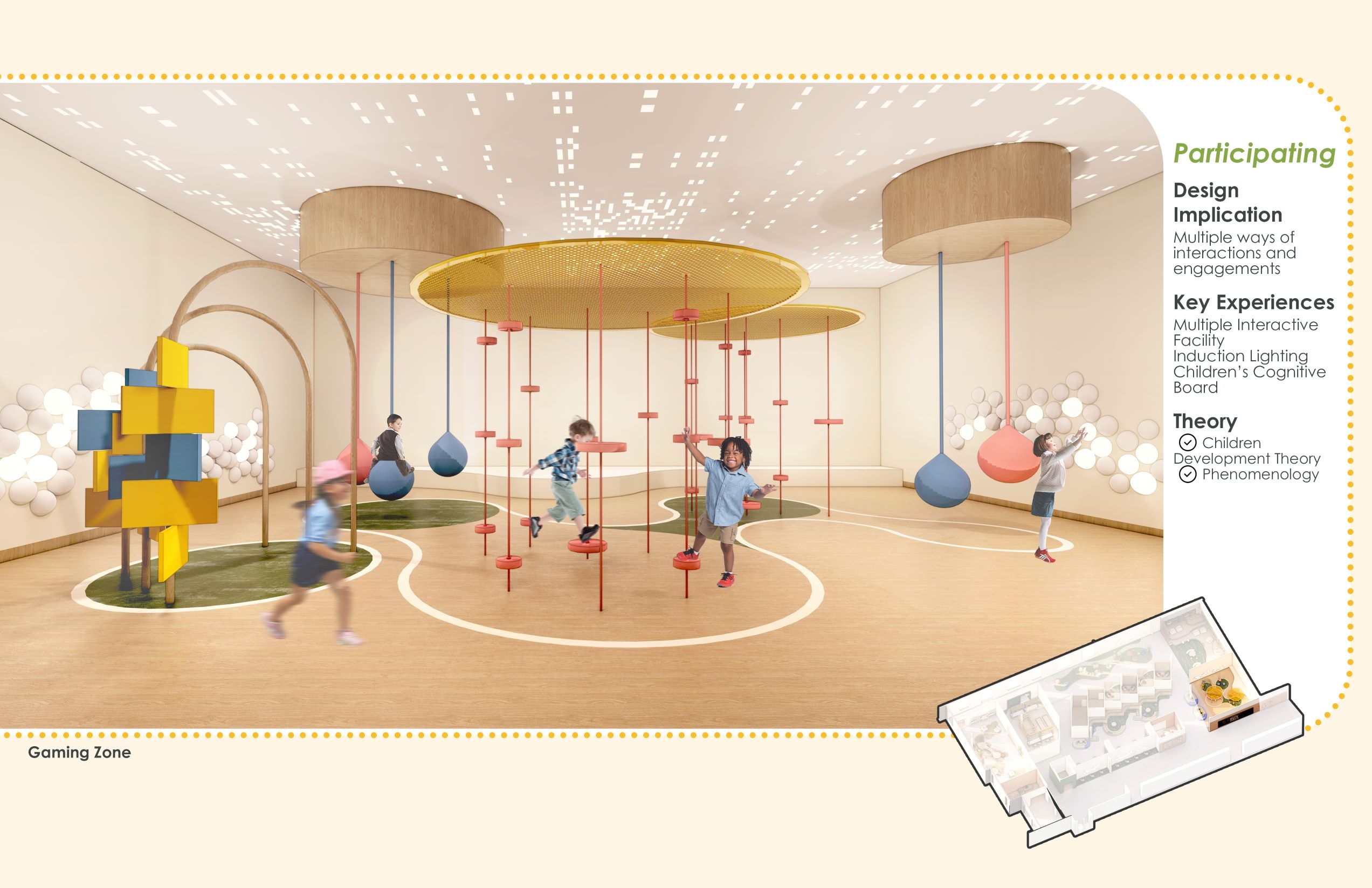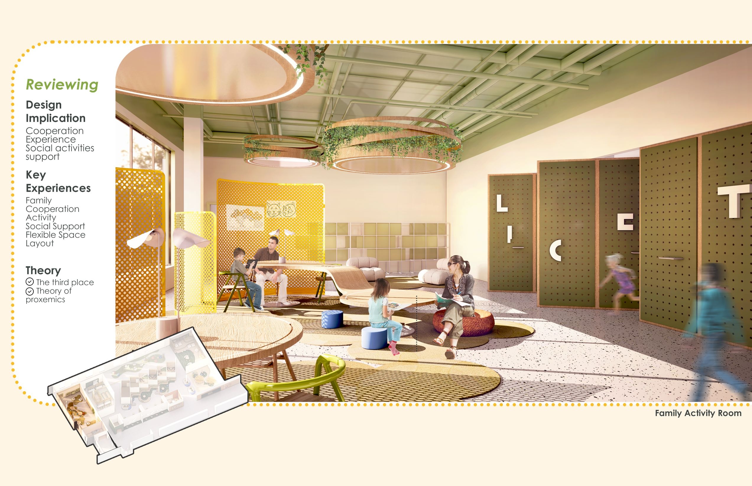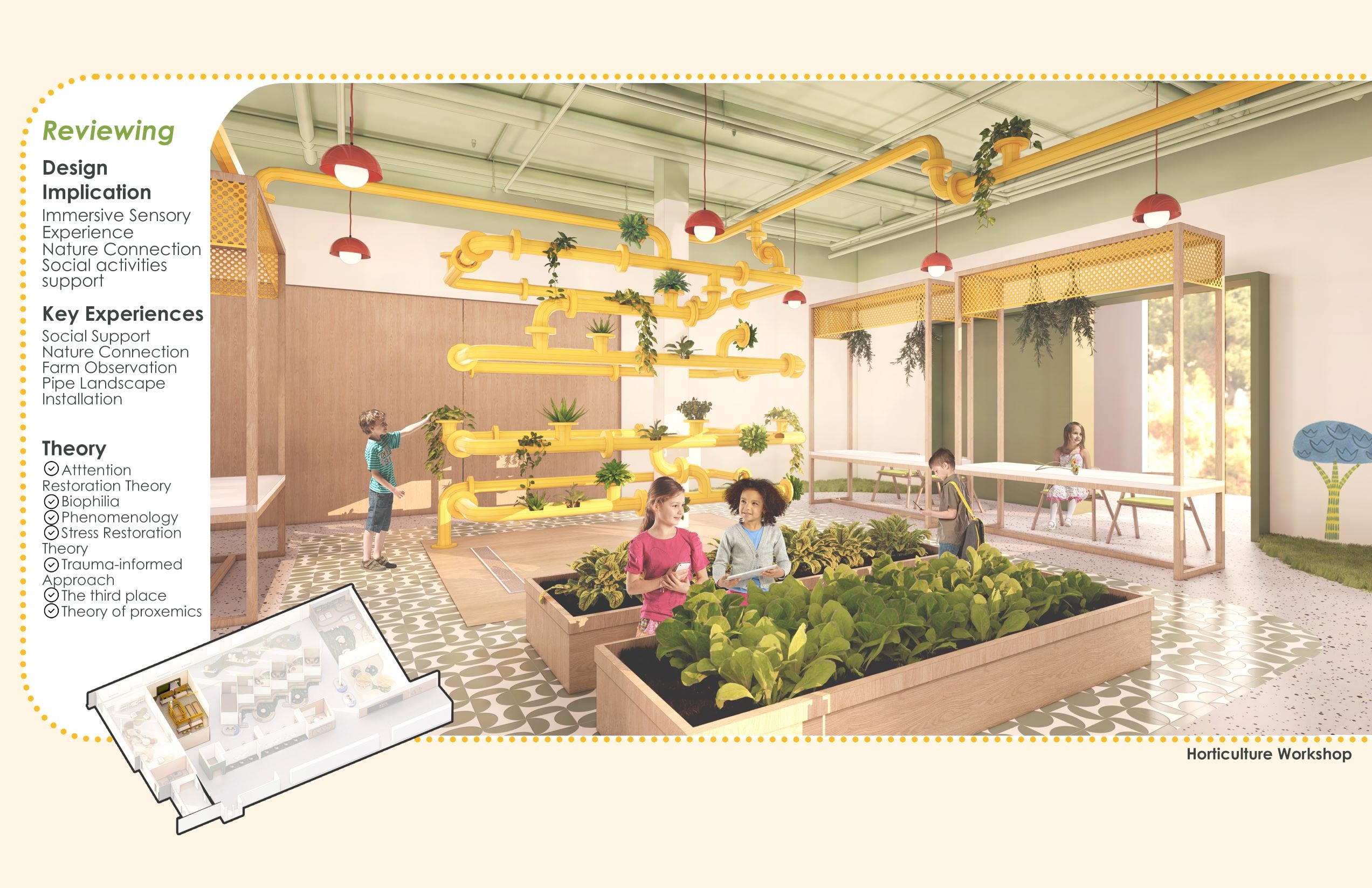 The design focuses on the increasing possibility of psychological trauma of children affected by the pandemic, due to restrictive policy on closure of school, which is students’ only source of trauma-informed care and support. The purpose of the design is to try to find how the interior design helps traumatized children recover, in order to address the lack of design with healing function integrated with school. The design implications are dedicated to motivating users to engage in social activity and immersive experience, therefore improving the recovery efficiency of psychological trauma.