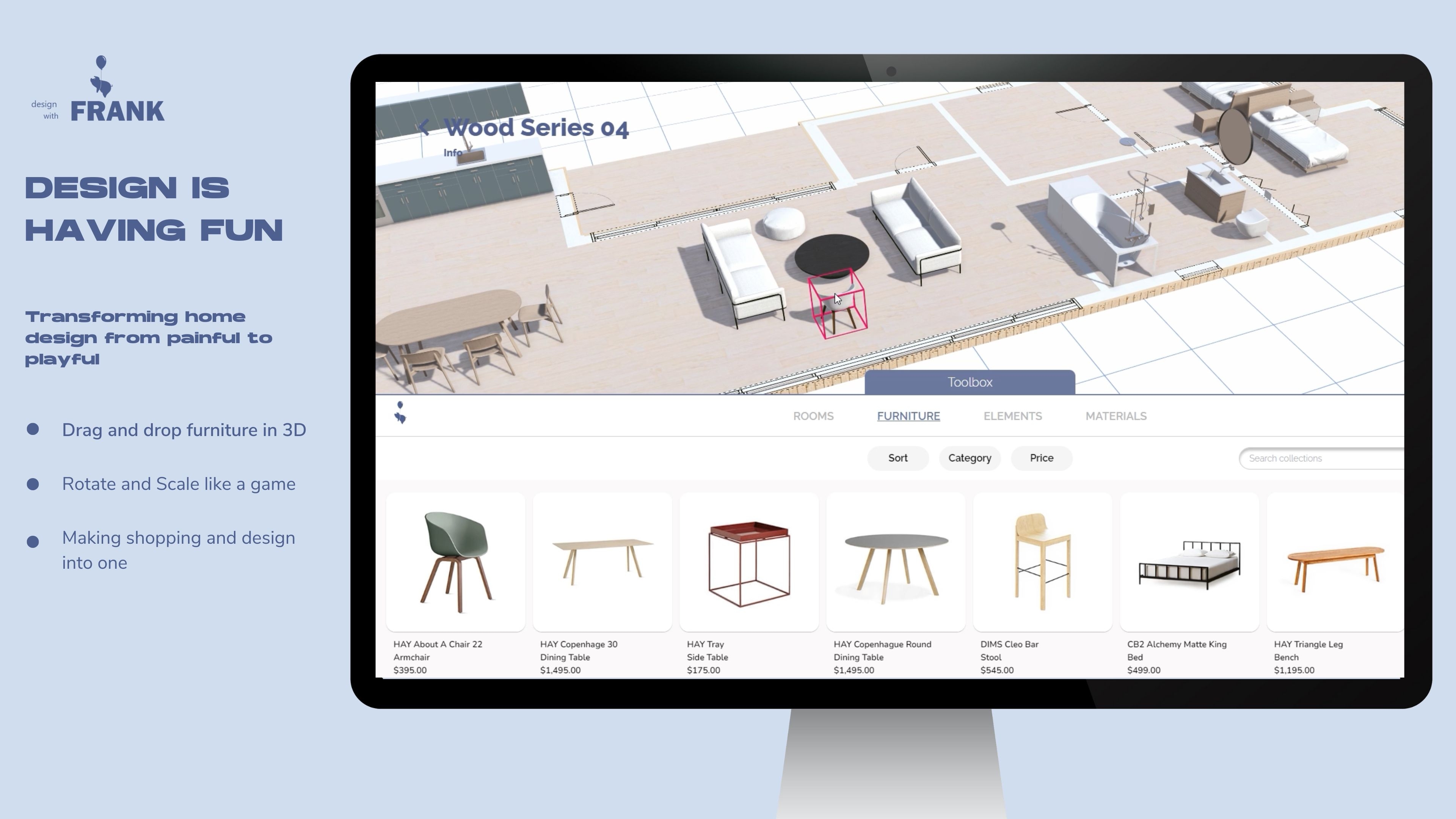 FRANK is a smart home design software with real building materials and furniture databases. FRANK empowers people to design dream homes and shop for all the products they need to realize their projects. We make designing in 3D as easy as dragging and dropping in Figma. Our app keeps track of quantities and costs in real time all in the web browser.