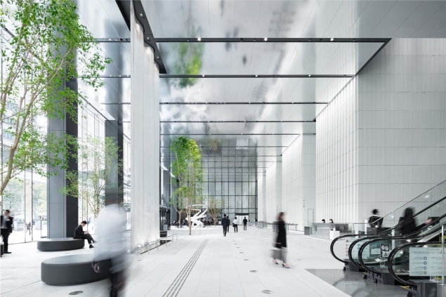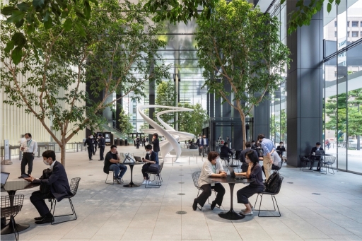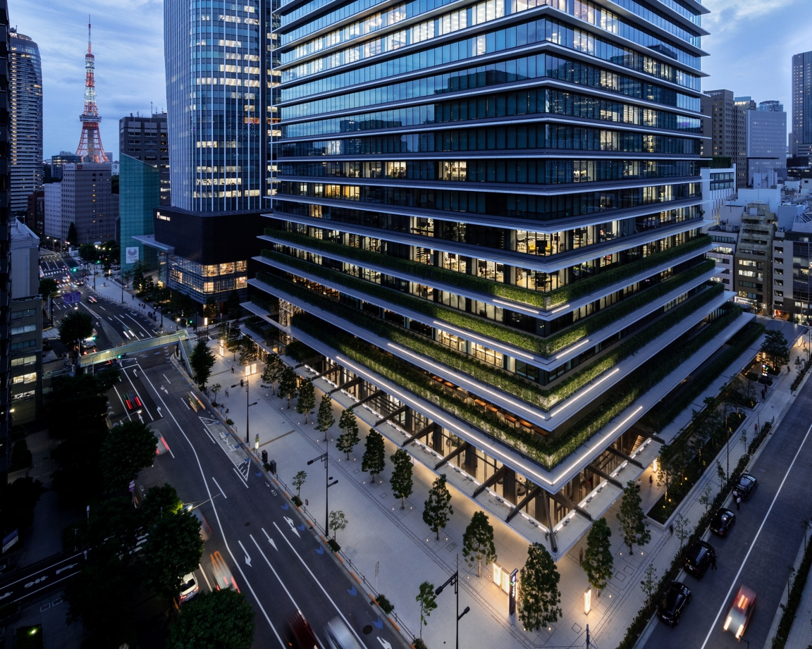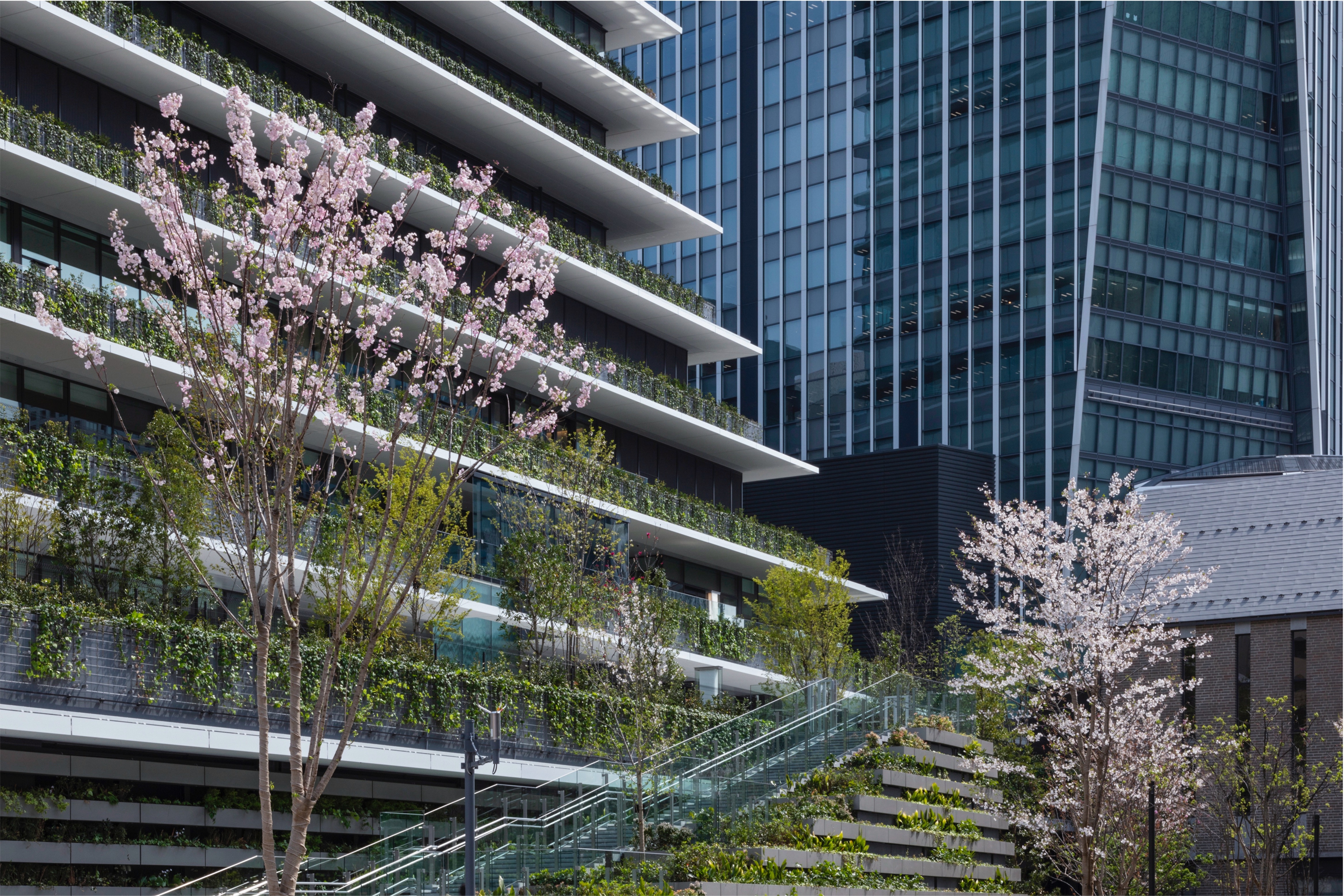 The two new towers integrate well with the surrounding neighbourhood, respecting the taller central tower while presenting their own contemporary urban response. They reflect the greenery of the adjacent parks and gardens of the historic Atago Shrine dating back to 1603. The towers fan out towards the ground-level zone in stepped terraces with a public green plateau above the plaza at street level. The towers are designed to accommodate earthquakes and typhoons, through appropriate building component dimensions. Like ancient temple buildings, the high-rises are structurally configured to passively dampen seismic vibrations. Both towers are characterized by decks finished in white, powder-coated aluminium.