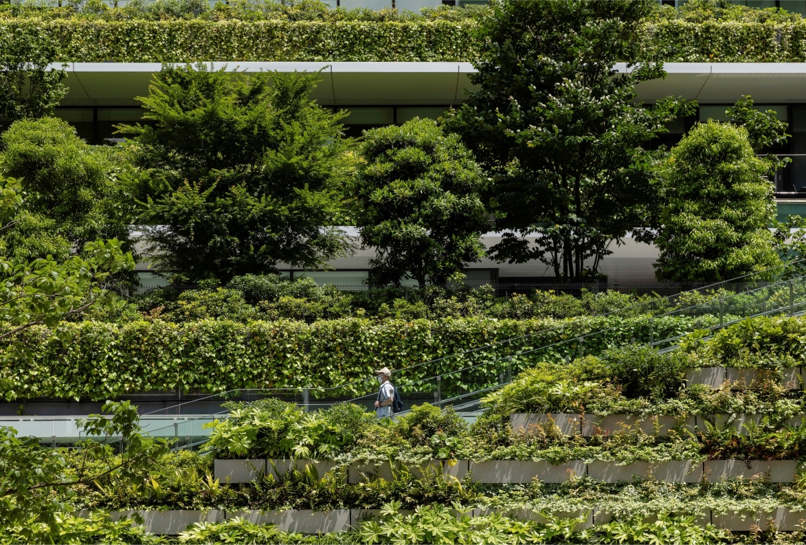 A green, publicly accessible plateau connects all three high-rise buildings at the first above-ground level. The central design element is the rich plant life that interweaves the skyscrapers with their environment.