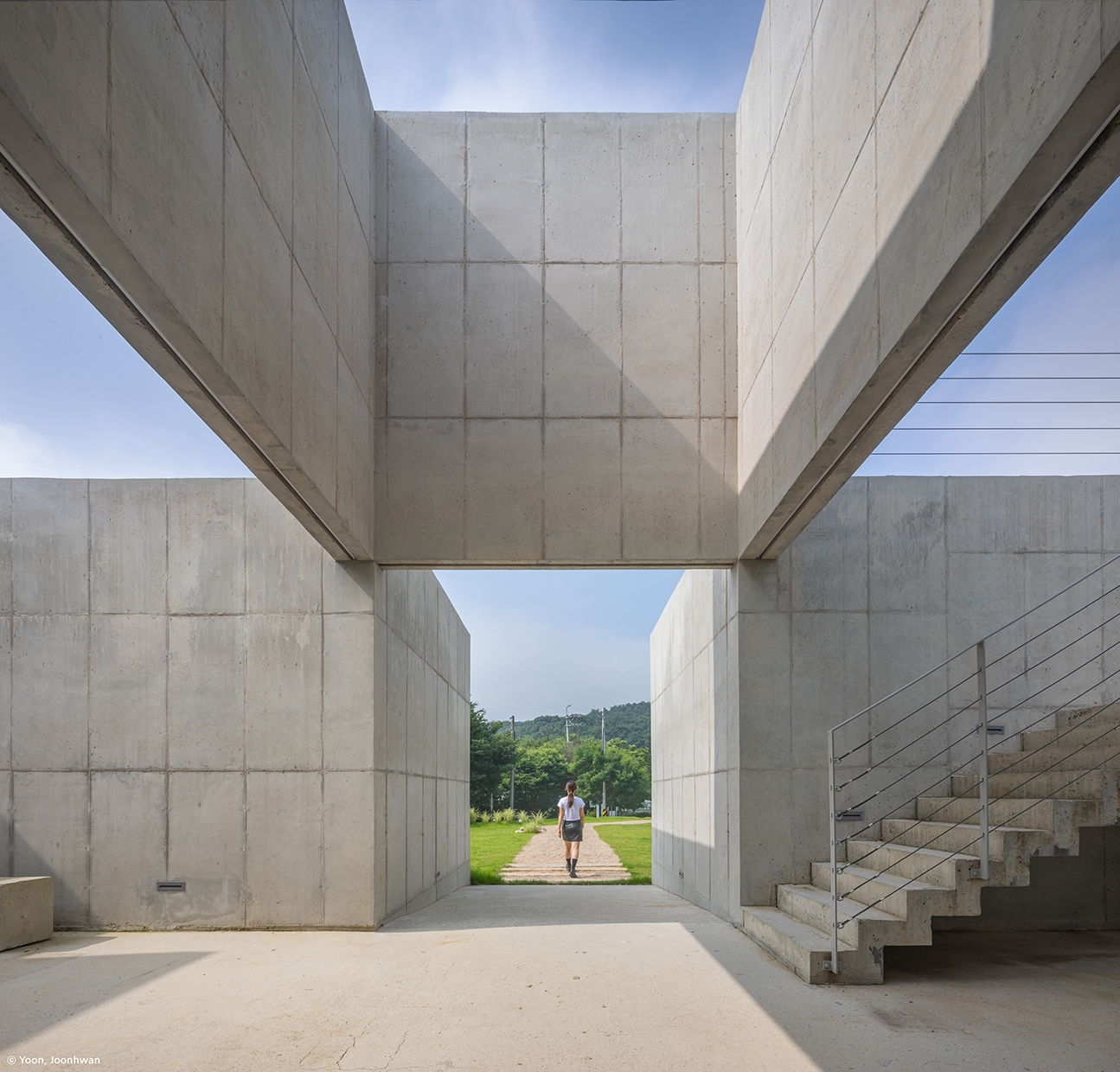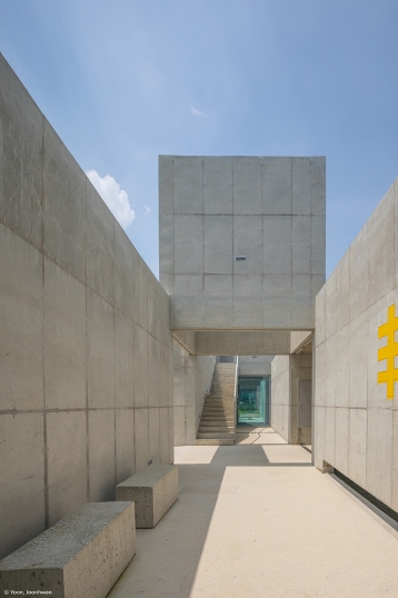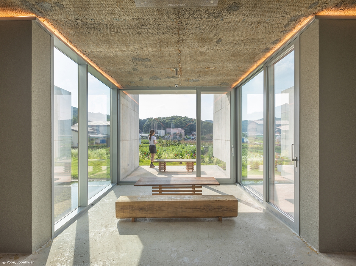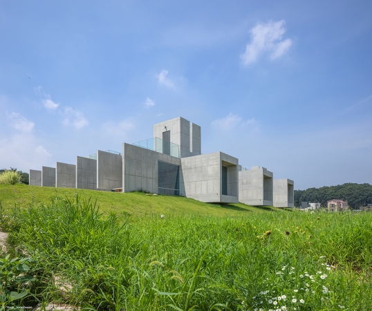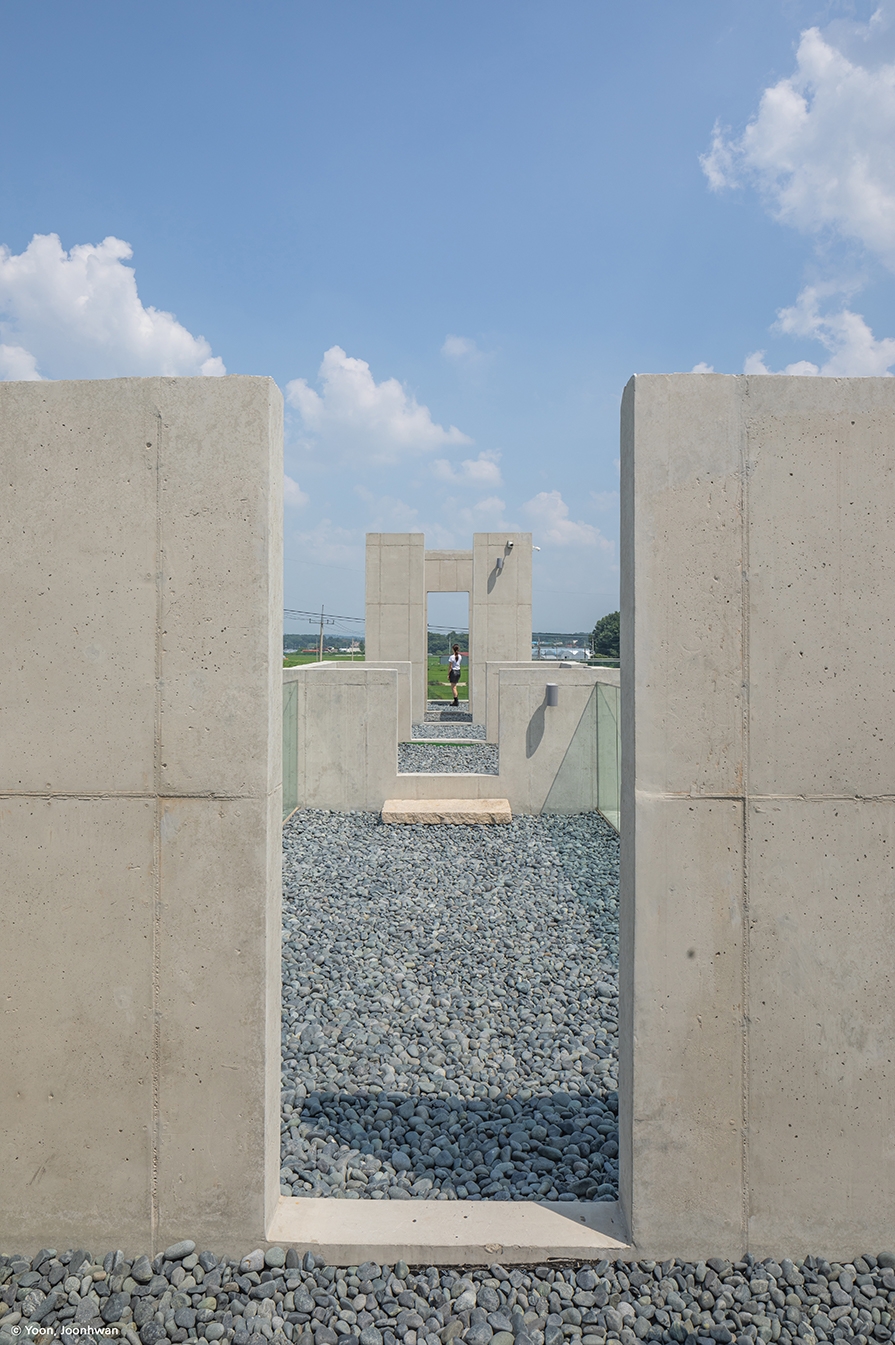 The architectural space restores local memories of rice paddies and presents a horizontal order to several overlapping areas organised with walls 3.2m apart. The interior space and exterior space have been overlapped in the woven space of the walls. The natural flow passes through the intersection of rice paddies, rivers, and streams on the other side and then continues into the rice paddies and mountains at several points. The architectural space that restores this repetitive natural flow in realised as a space of overlap by providing a filled vertical order with 3.2m modules of rice paddies.Crossing spaces are interwoven at the points where the horizontal and vertical orders meet. The internal intersection space, formed on the first floor and the rooftop, creates a horizontal and vertical overlap, creating various possibilities.