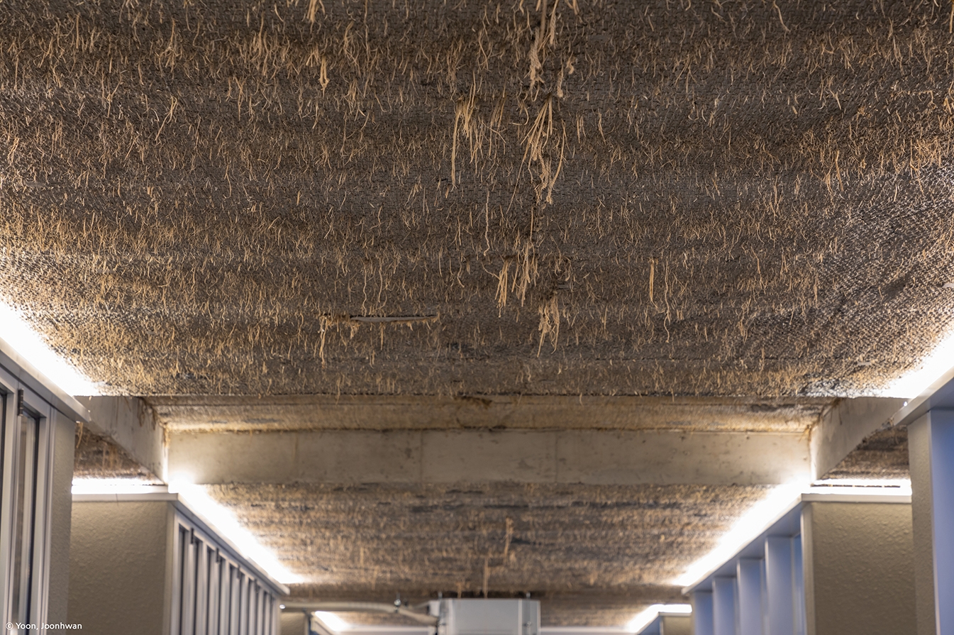 Inside, an exposed concrete technique using rice straw has been experimented with to create an atmosphere that enters the rice straw space.