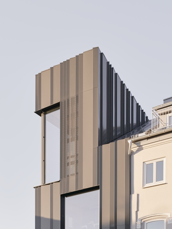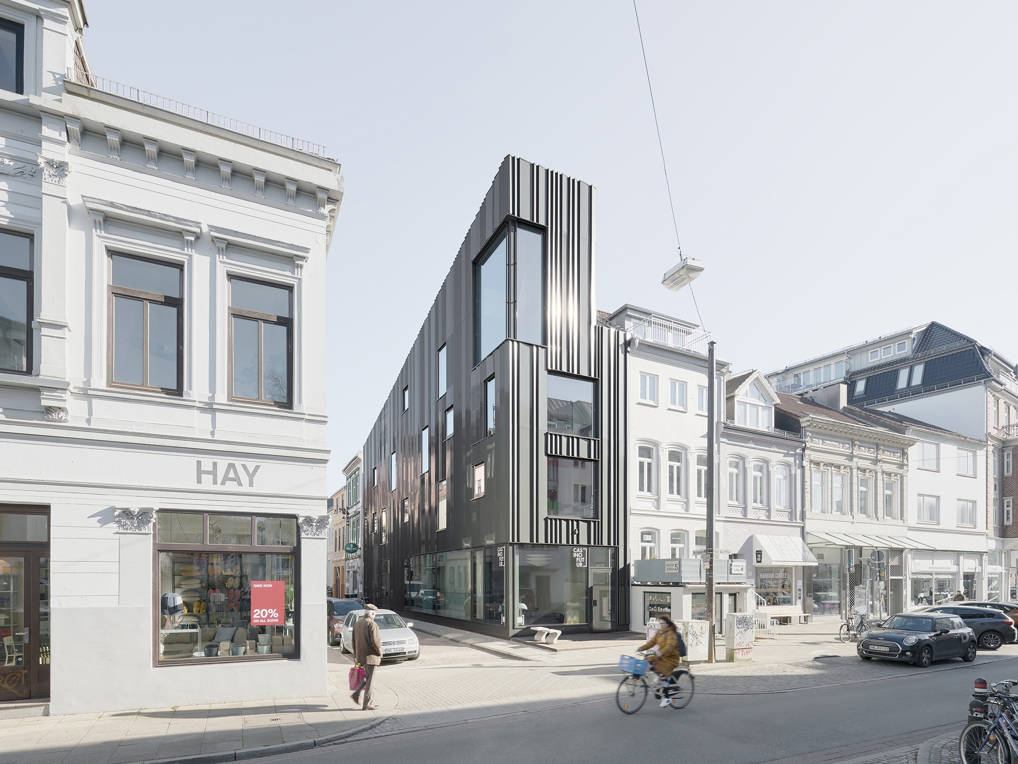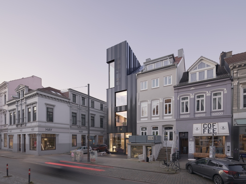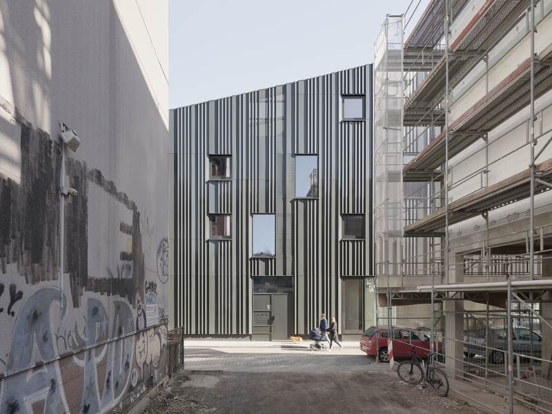 The initial structural situation was a narrow corner plot in a exposed location with a remodeled and no longer suitable for renovation existing building. A special, communicative and creative solution had to be found for the predominant young and design oriented neighbourhood. This prominent urban intersection is now accentuated by the elevation of the structure. The sculptural building and the special façade design implements the modern interpretation of the Wilhelminian town-building idea of emphasising a corner situation through special architecture and ornamentation in a narrow inner-city context.