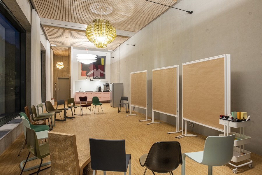 Although the house is rather small, it acts beyond its size measured in square meters as a clear statement of modern architecture. This is further underlined by its innovative usage concept. The first floors are used intensively as a think tank and community hub under the name Casino Futur. The “Salon” on the ground floor, with its optically public area, which is created by the large window strip, invites the residents of the district to a new communication and contributes with its events open for all to moreinteraction. The apartment fulfils the demand for contemporary urban living.