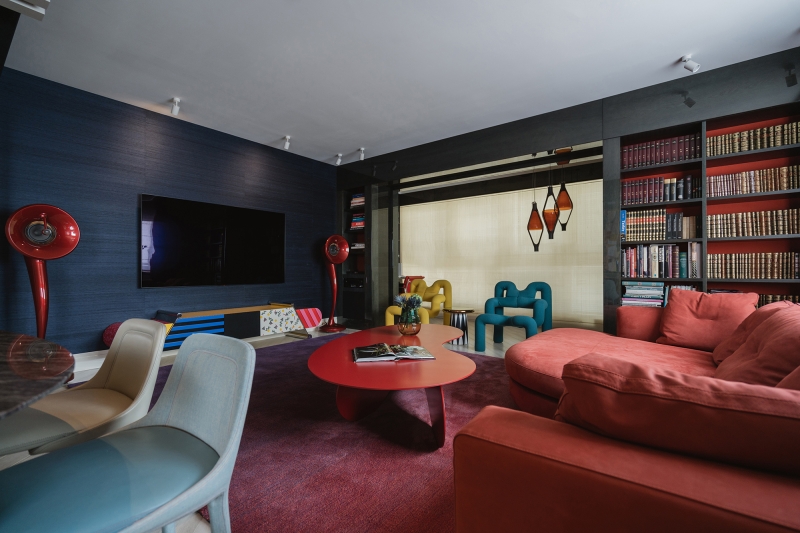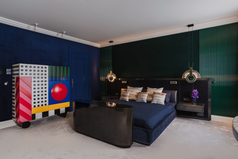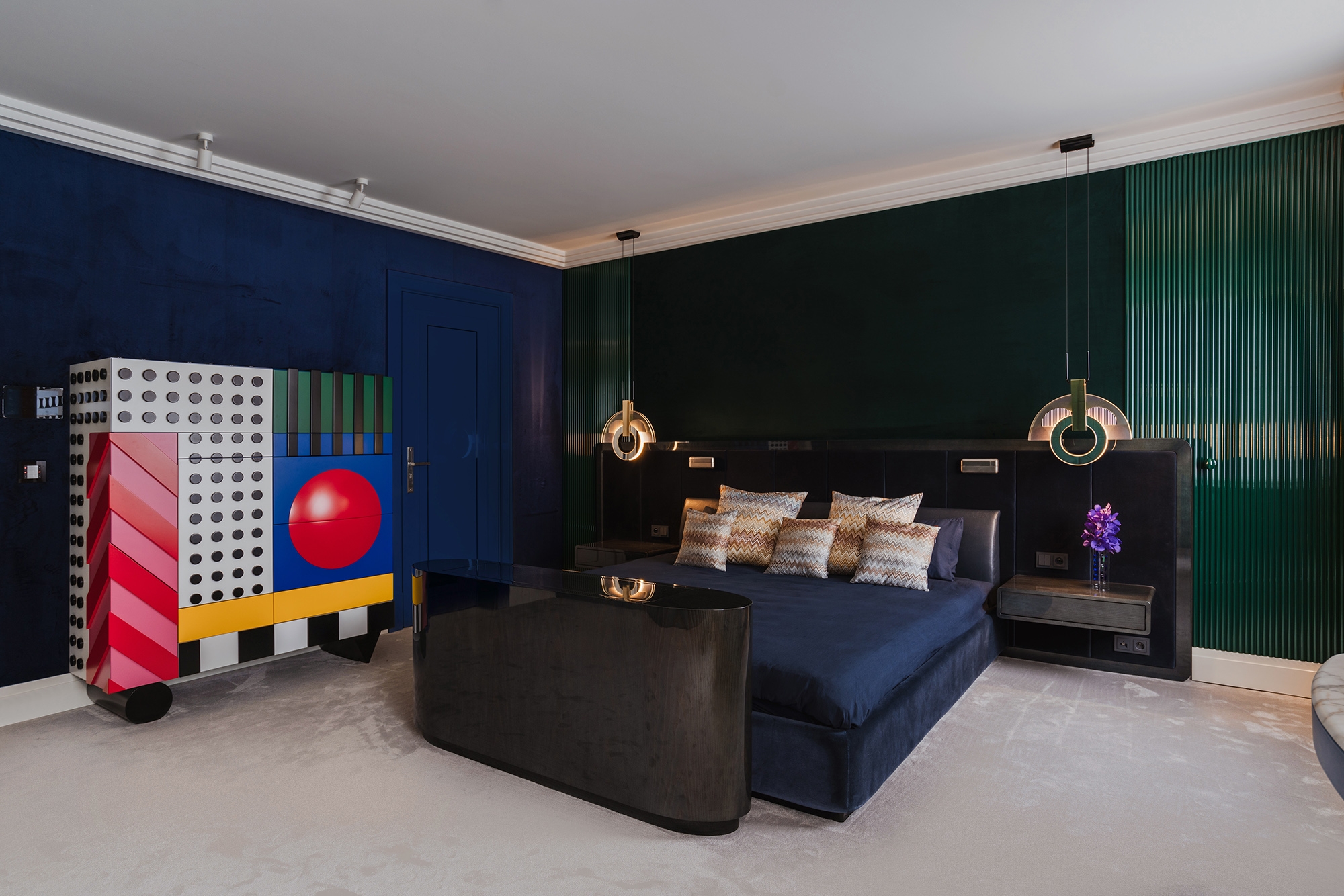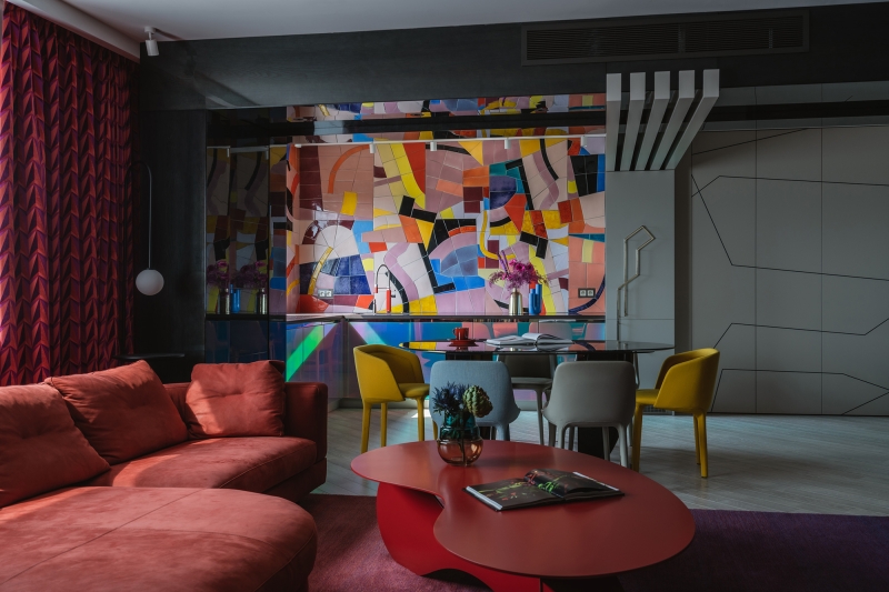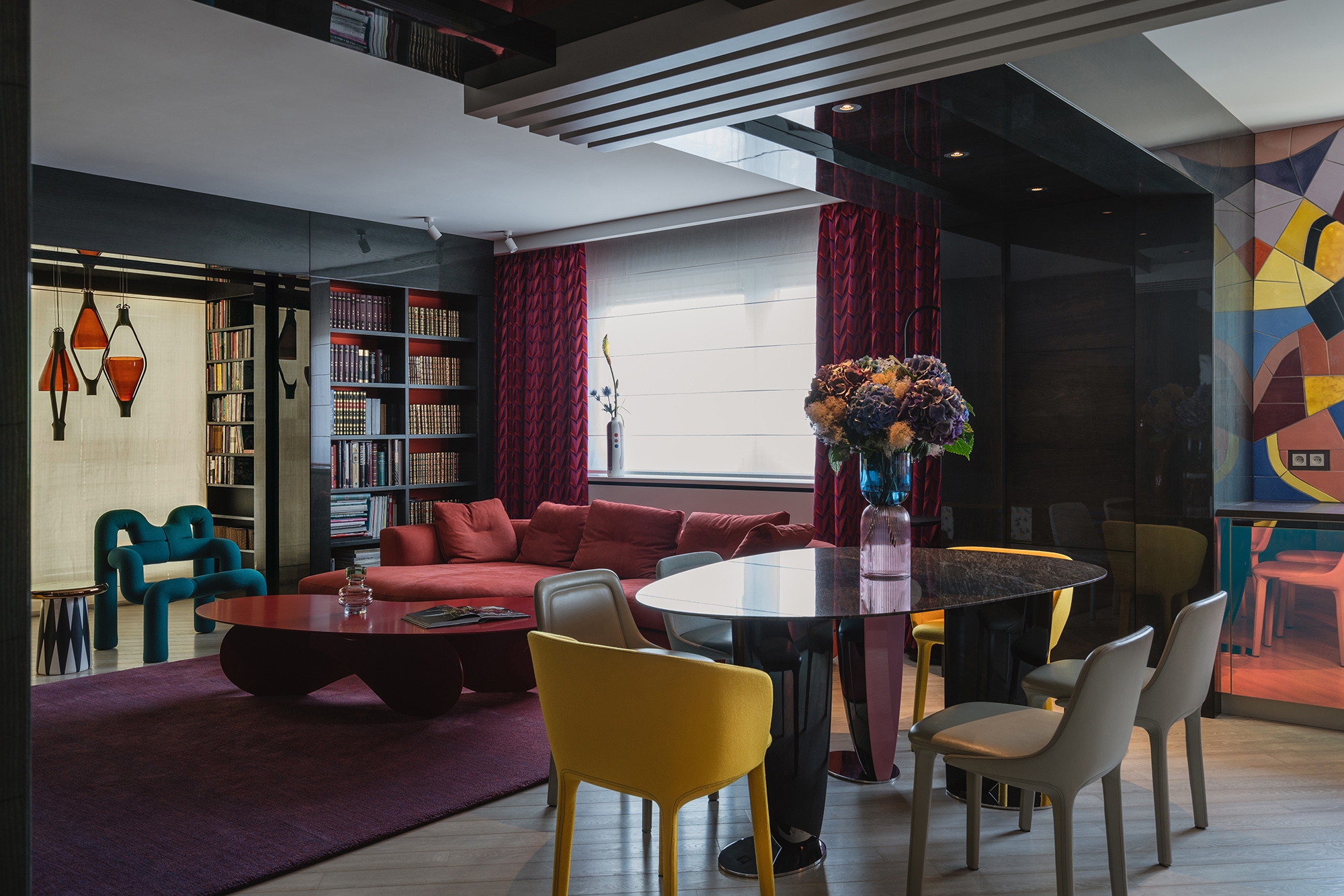 The architectural base of graphite and beige structures, which existed here before, was complemented by the client’s favourite combination of grant-green-purple-carmine, which introduced a visible boldness of colour, evoking associations and an atmosphere like in the world of Almodovar, whom she has appreciated while inspired this place.