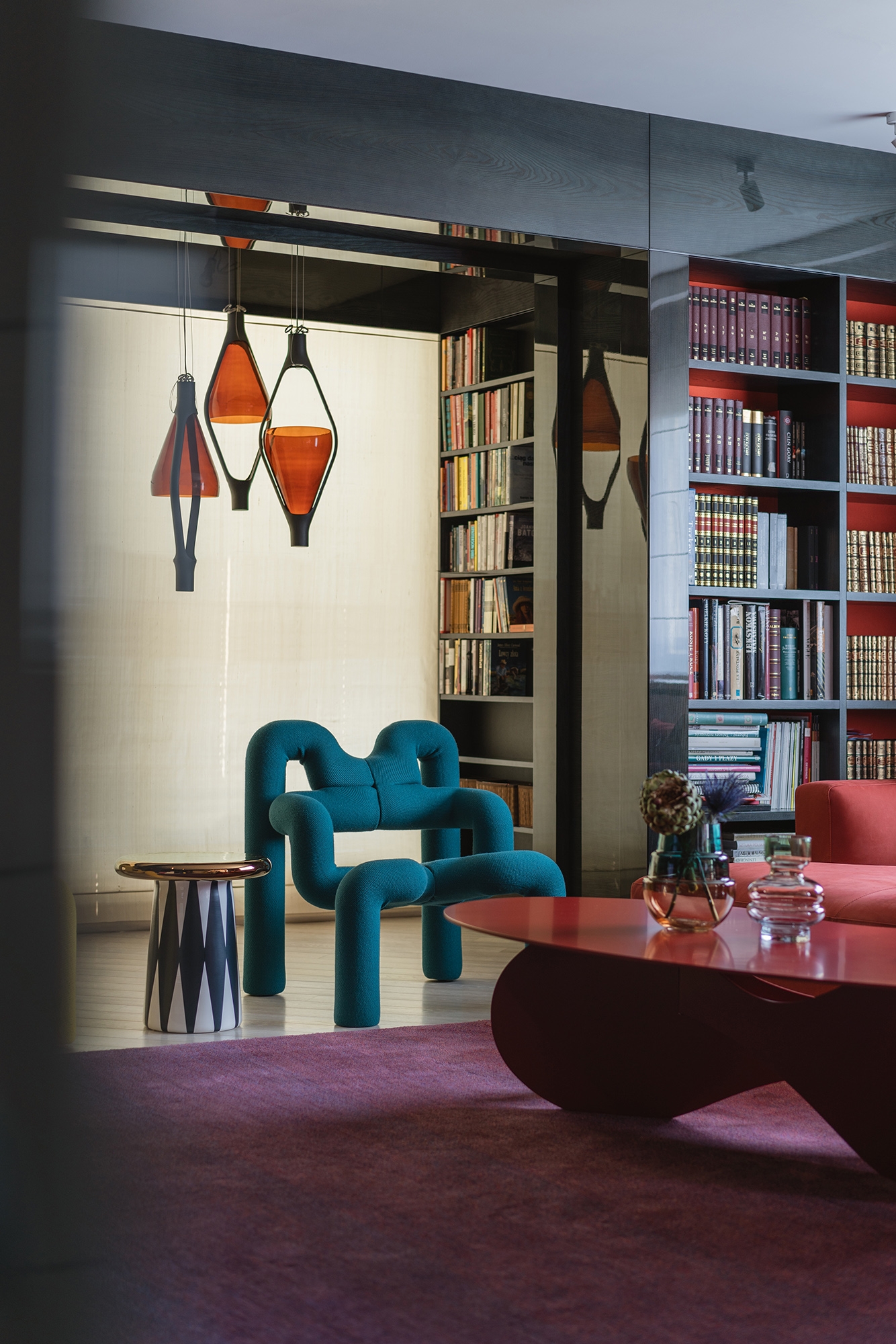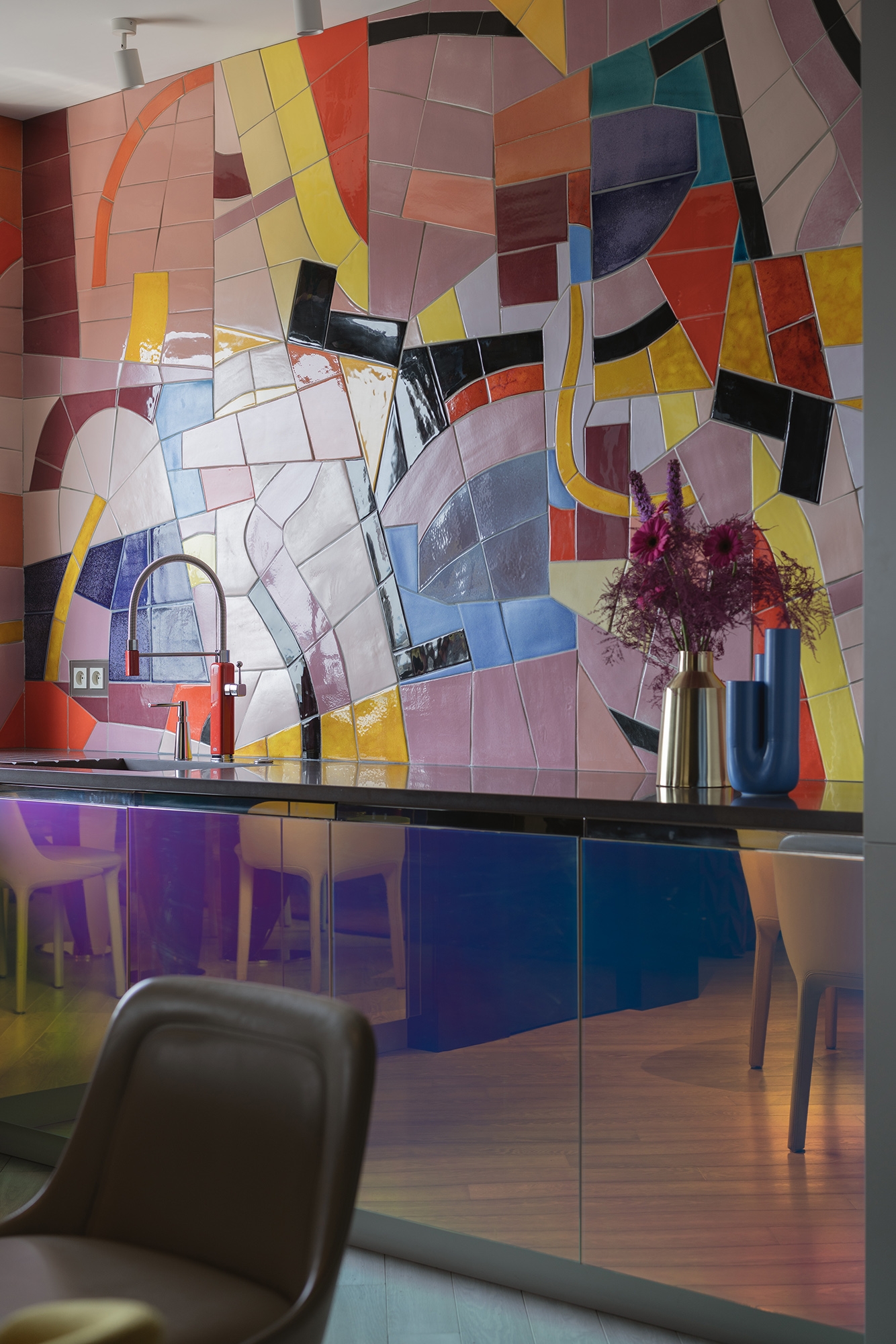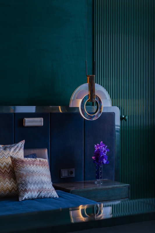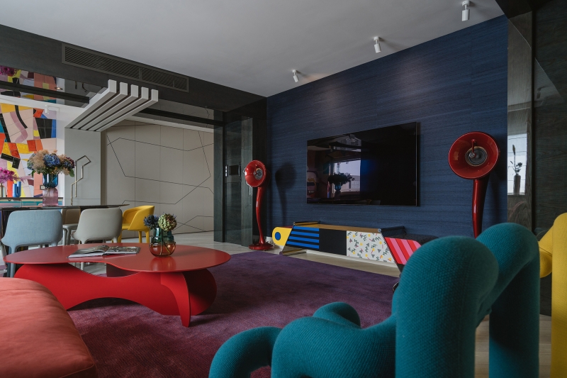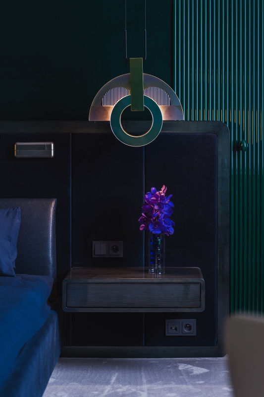 The architectural base of graphite and beige structures, which existed here before, was complemented by the client’s favourite combination of grant-green-purple-carmine, which introduced a visible boldness of colour, evoking associations and an atmosphere like in the world of Almodovar, whom she has appreciated while inspired this place.