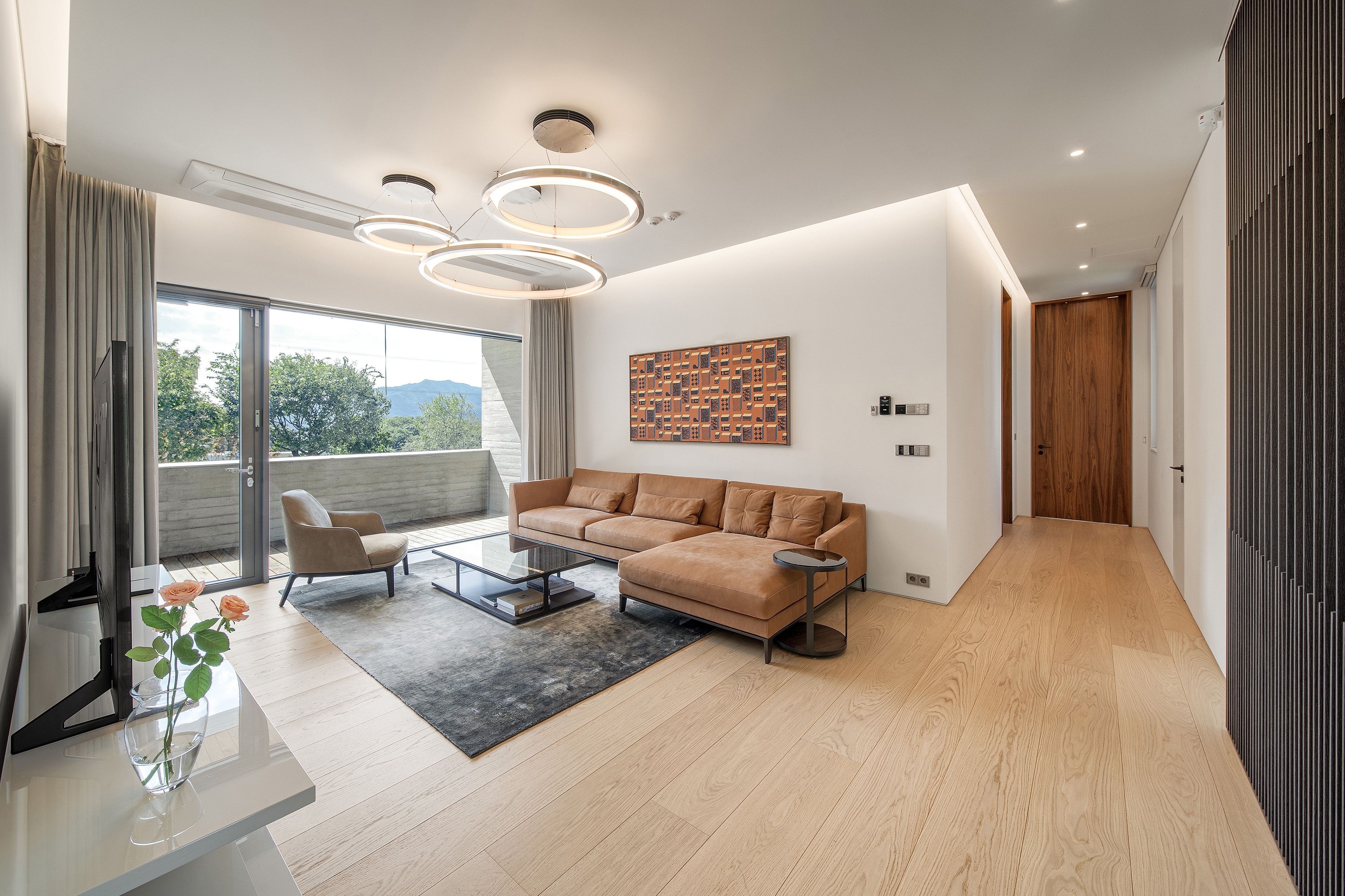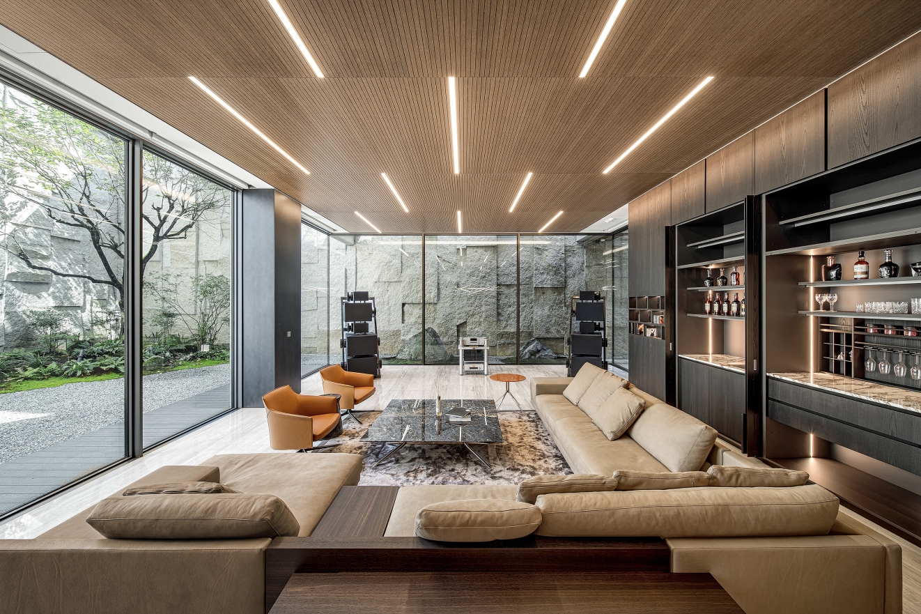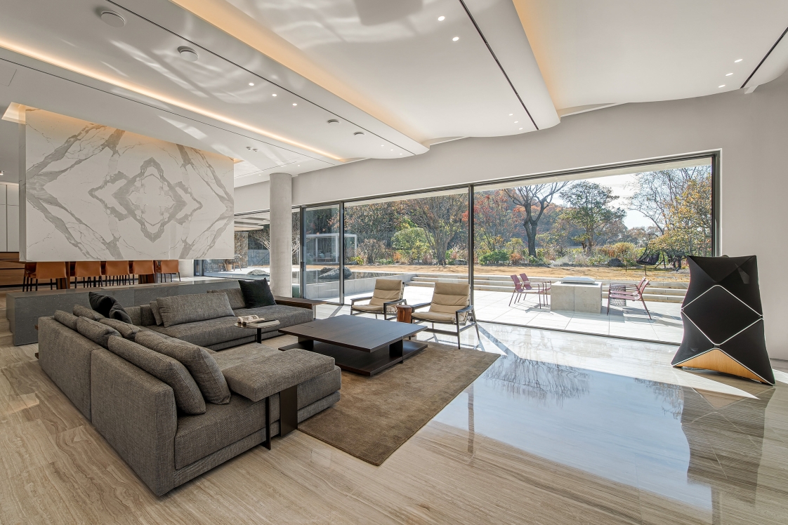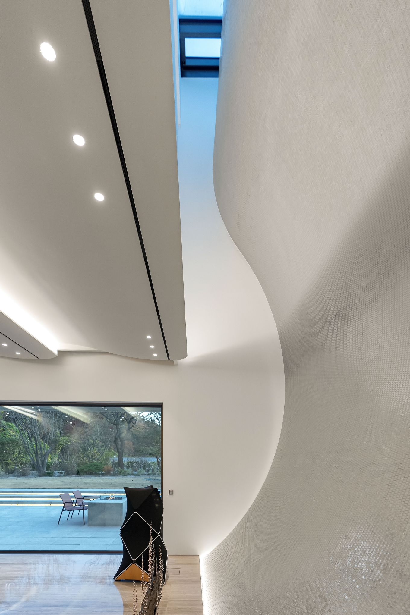 ‘Wave House’is a single-detached dwelling embracing the natural landscape drawn from the surrounding environment. The project focused on the elements that comprise the everyday experience of the users. In particular, the living area and bar were designed as fused spaces to facilitate a solitary and communal space for entertainment, and the bathroom in a guest room on the basement floor is enhanced by the presence of skylights placed along the sun’s trajectory to capture its natural light. The curved facade of the architecture was incorporated into the interior. The main objective of the project is to offer the living experience inherent to a single-detached dwelling. The house presents general yet unique, and visceral interaction with nature. The uninterrupted mutual fusion of the landscape inside the house is especially emphasized, and the outdoor layout involves unacquainted elements amidst urban complex housings such as the front yard and pond. The project concept focuses on the ‘space in the landscape’ and the type of element and its arrangement based on the viewpoint and behavior of the resident rather than the internal style, and the storage compartment is seamlessly designed