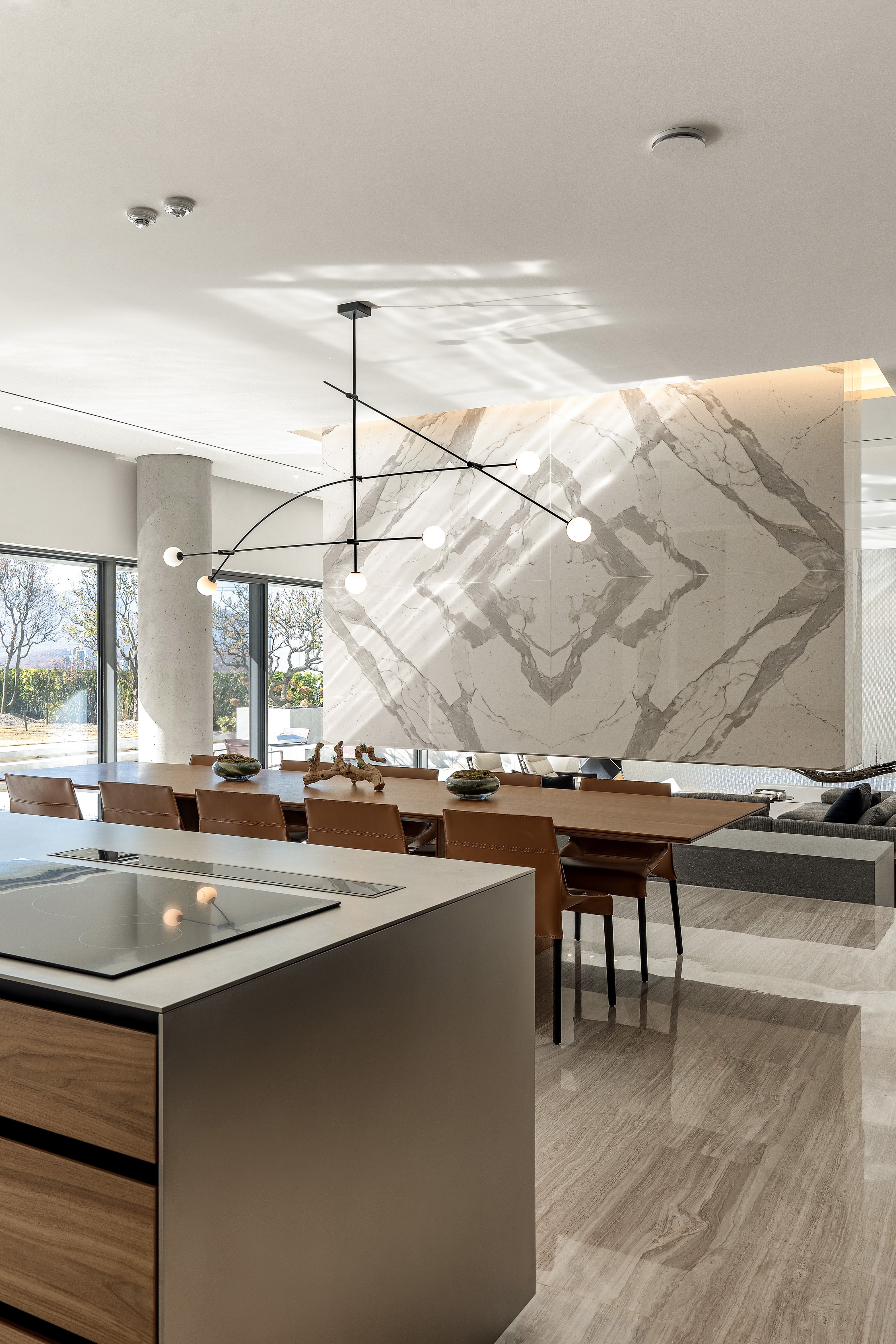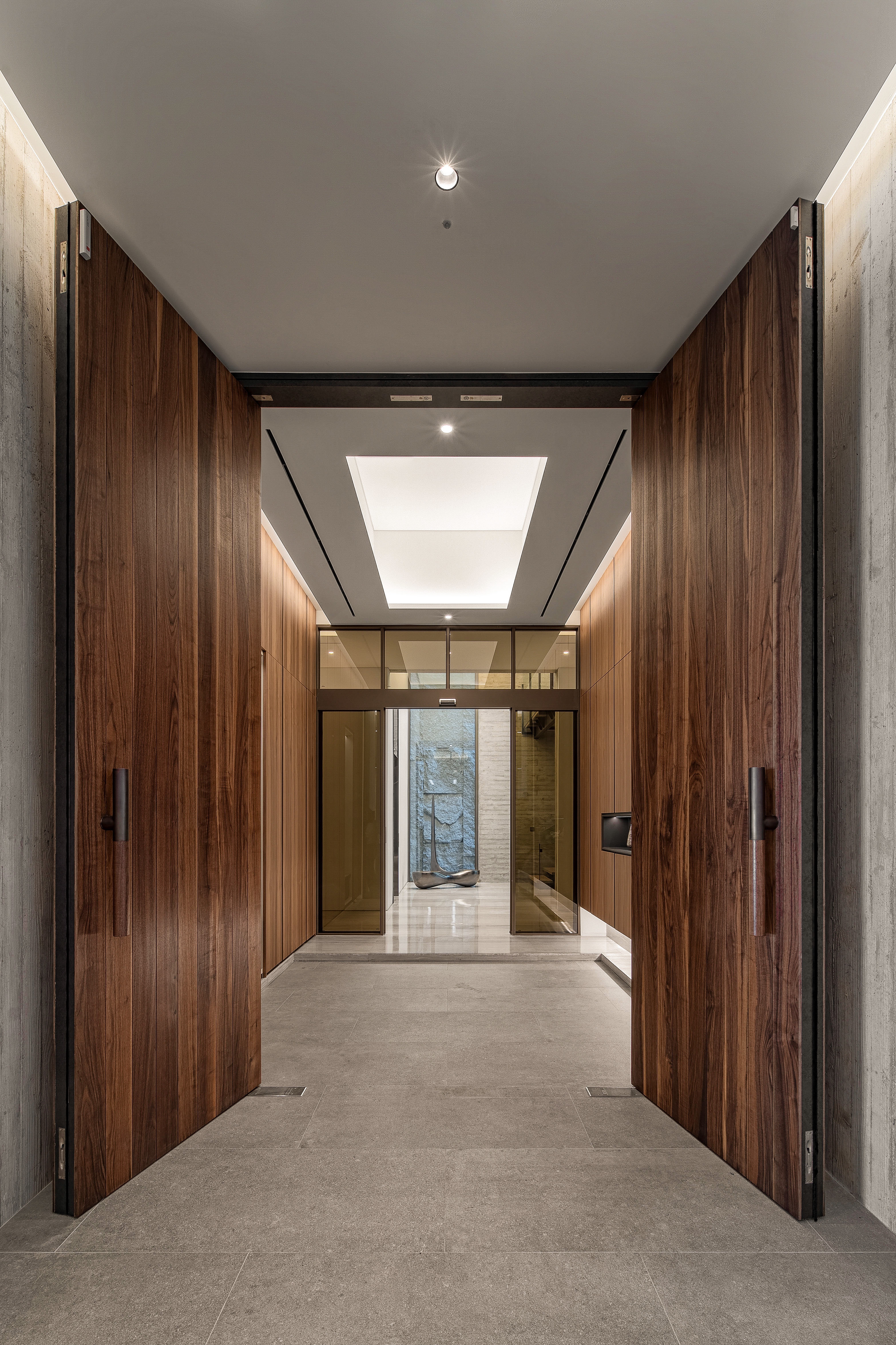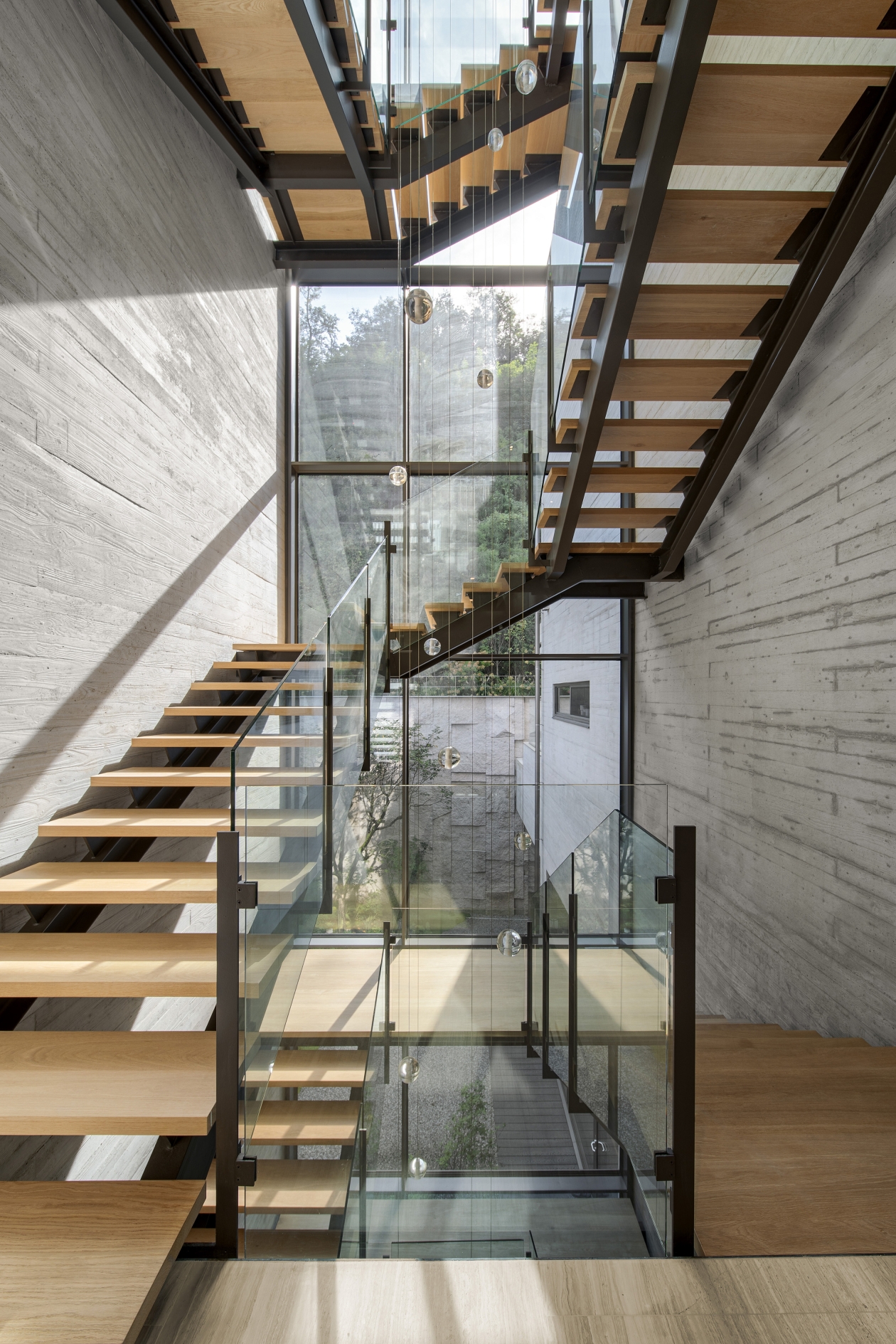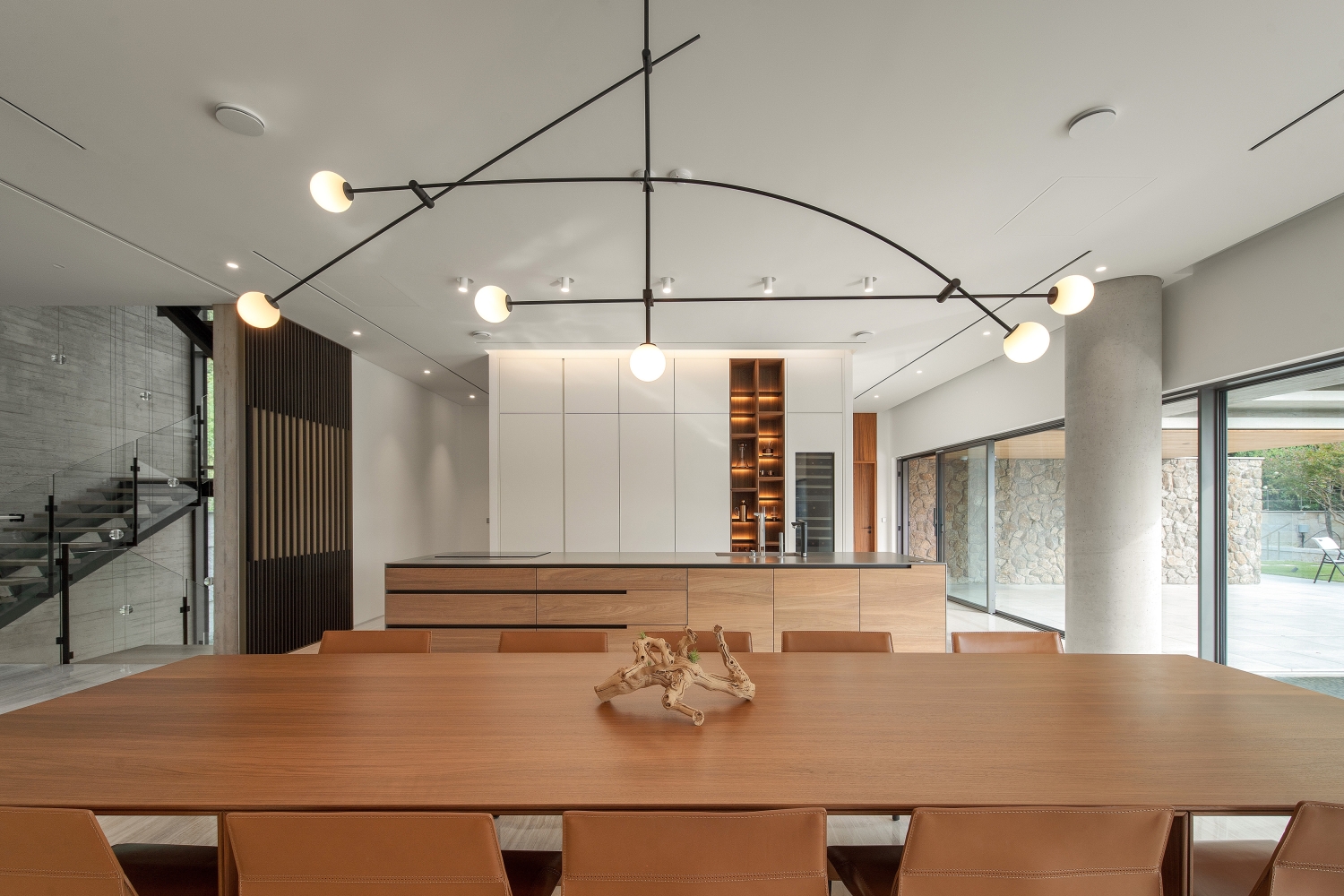 ‘Wave House’is a single-detached dwelling embracing the natural landscape drawn from the surrounding environment. The project focused on the elements that comprise the everyday experience of the users. In particular, the living area and bar were designed as fused spaces to facilitate a solitary and communal space for entertainment, and the bathroom in a guest room on the basement floor is enhanced by the presence of skylights placed along the sun’s trajectory to capture its natural light. The curved facade of the architecture was incorporated into the interior. The main objective of the project is to offer the living experience inherent to a single-detached dwelling. The house presents general yet unique, and visceral interaction with nature. The uninterrupted mutual fusion of the landscape inside the house is especially emphasized, and the outdoor layout involves unacquainted elements amidst urban complex housings such as the front yard and pond. The project concept focuses on the ‘space in the landscape’ and the type of element and its arrangement based on the viewpoint and behavior of the resident rather than the internal style, and the storage compartment is seamlessly designed