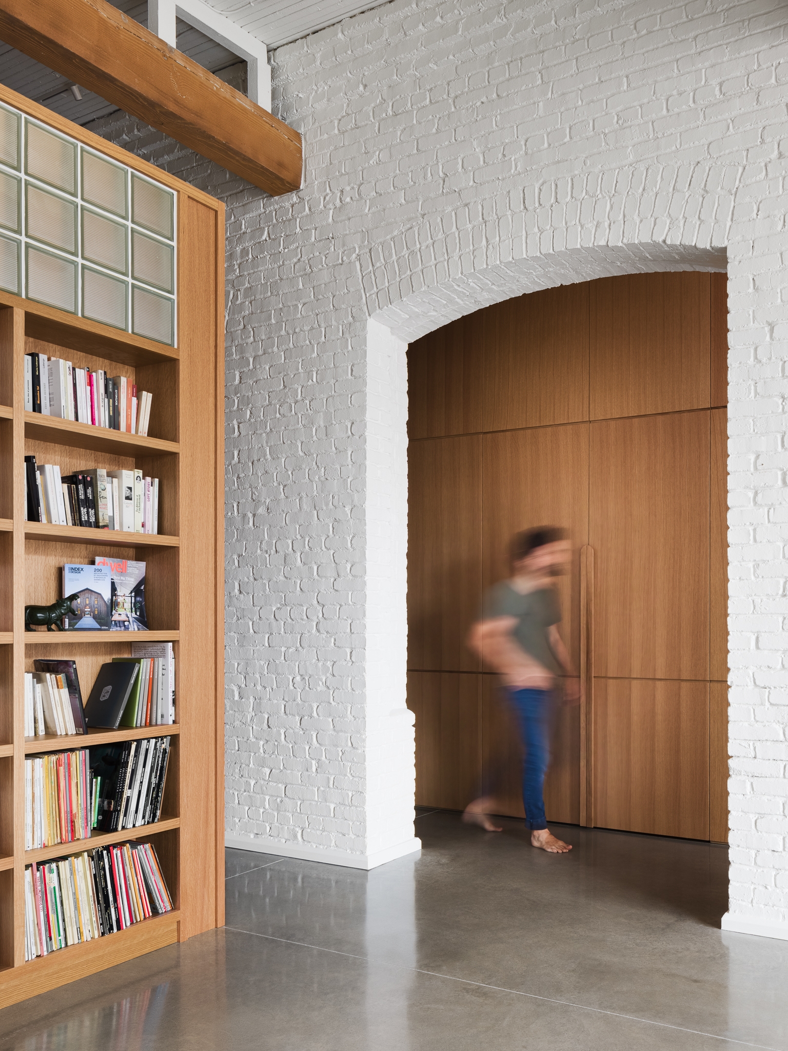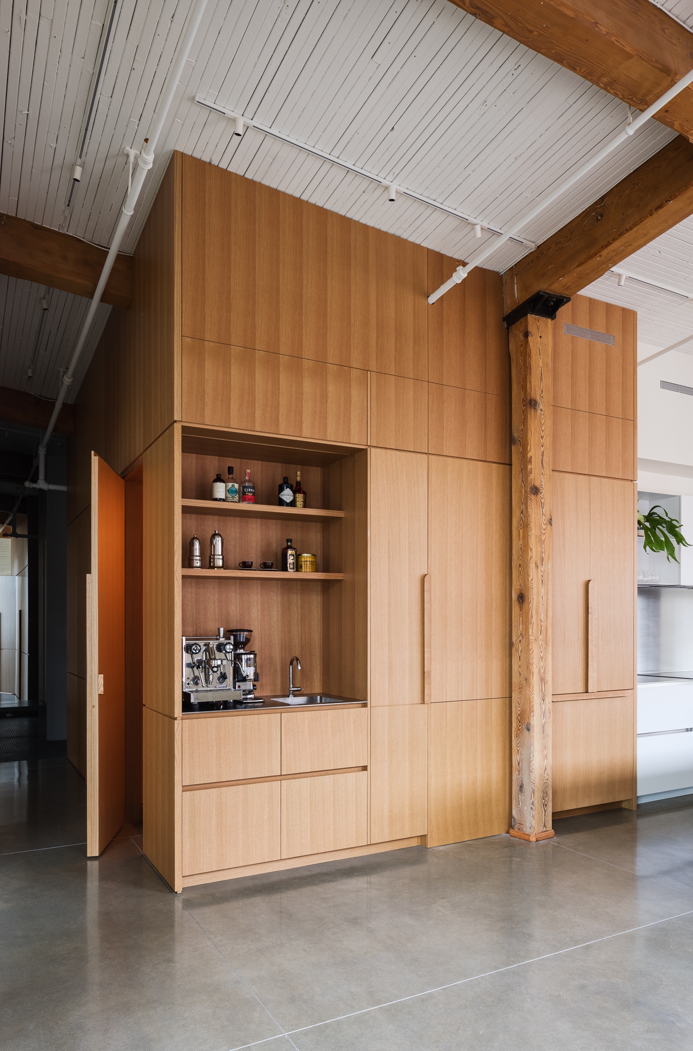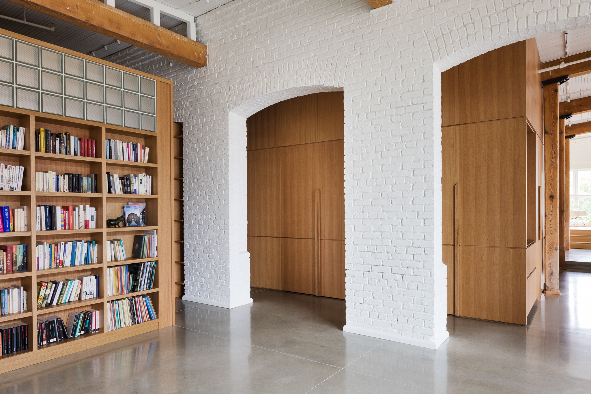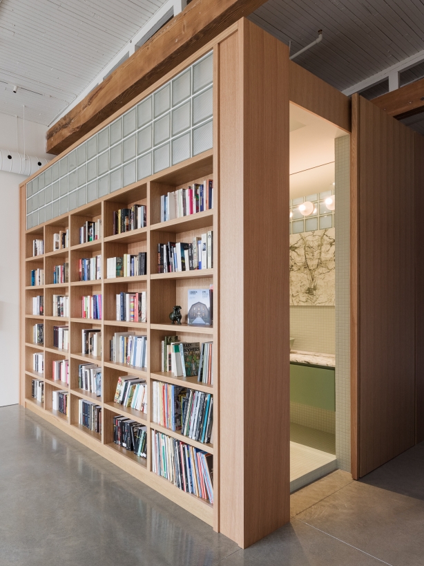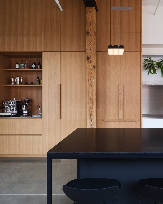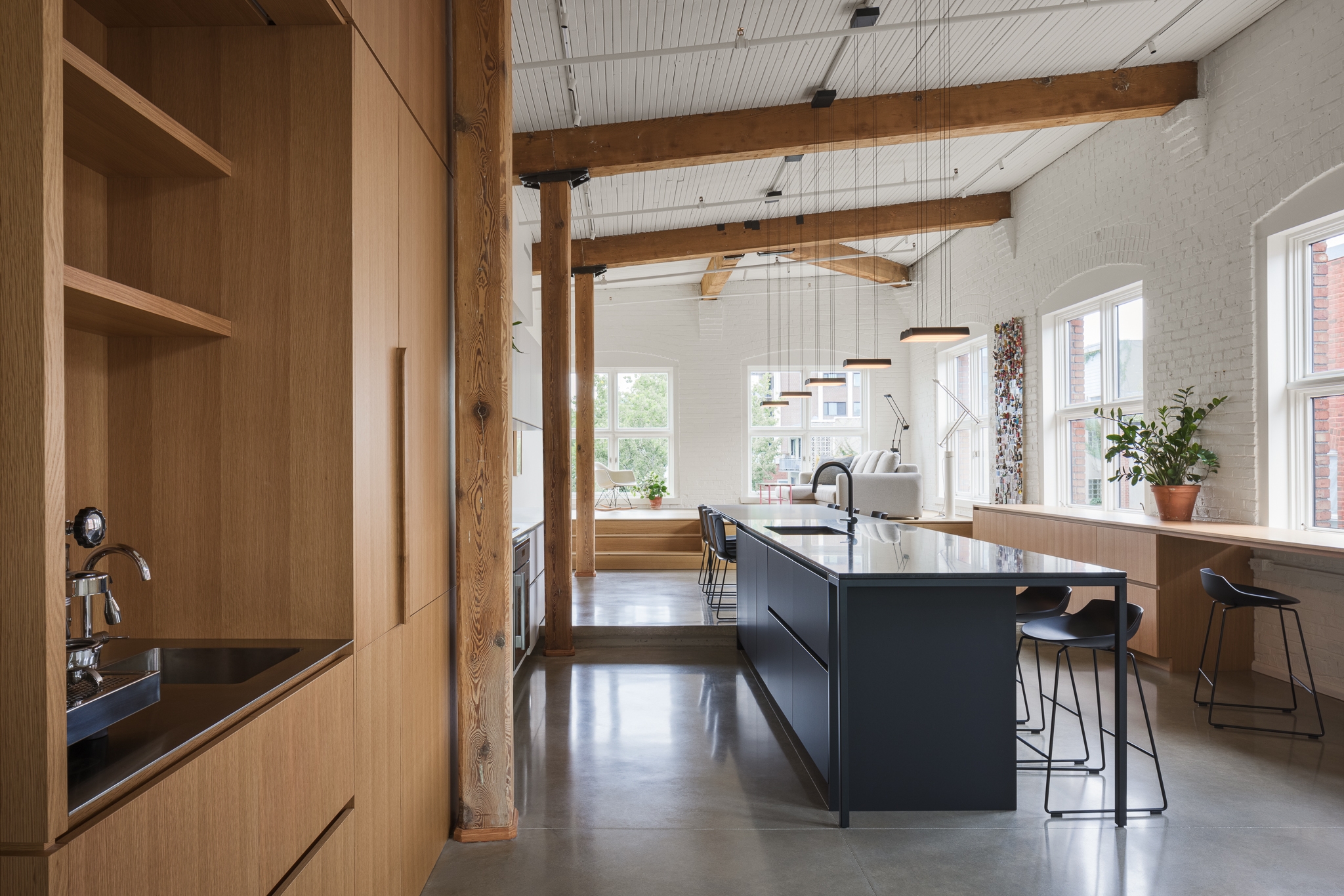 This project took a space in an early 20th century building that’s been a textile mill, a Campbell’s soup factory, and finally a condo complex, and transformed it to reflect the contemporary tastes and personalities of the clients. From an interest in geology displayed in material choices, to a love of cooking evident in a welcoming, functional kitchen, to a portion of the space dedicated to a gallery/conservatory, Elmire embodies the passions of the people who live there.
