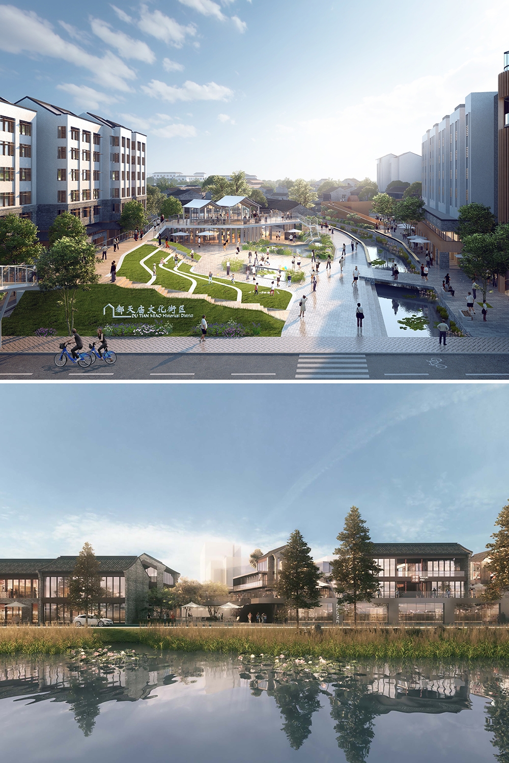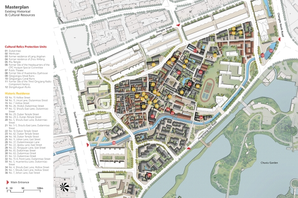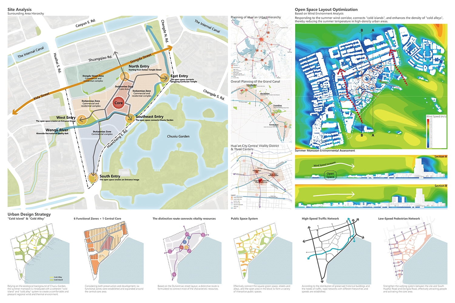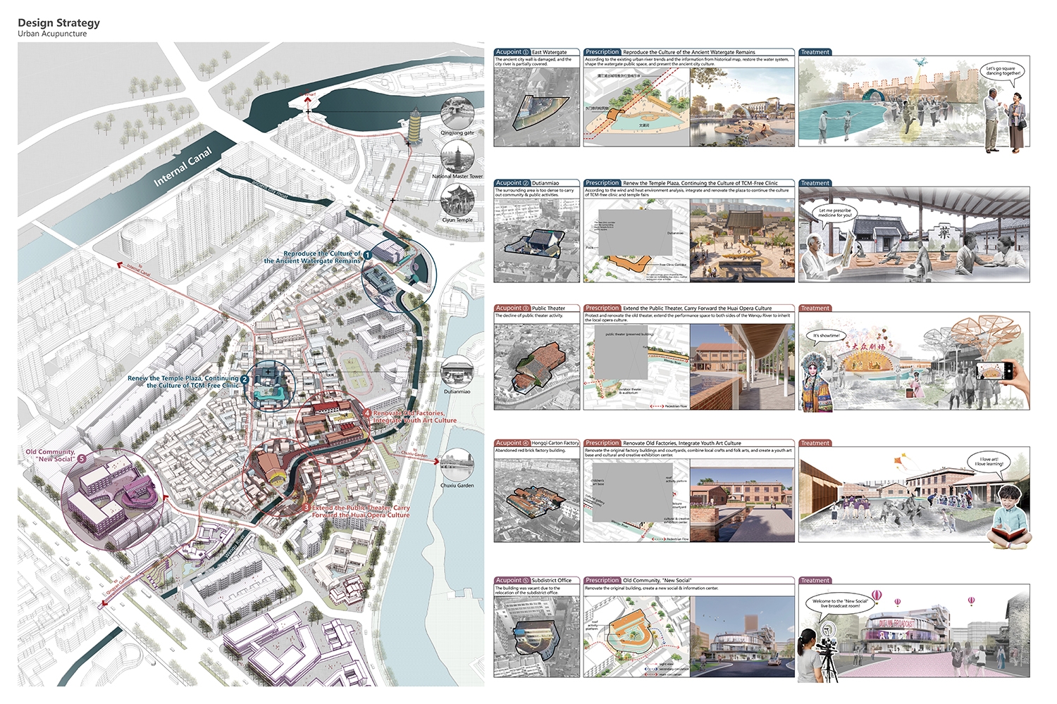 Dutian Temple District is located in the heart of Huai'an, the hub of the "Beijing-Hangzhou Grand Canal", representing precious authentic traditional settlements of Qingjiangpu Ancient City. The site holds rich spatial information, but currently suffers from high building density, inconvenient transportation, aging infrastructure, and a lack of vibrancy. The design spiritual centerpiece is the Dutian Temple, a historical hub for traditional Chinese medicine education. We draw parallels between the principles of acupuncture and our approach to revitalization design. Just as acupuncture targets key pressure points for targeted treatments, we identify critical areas within the declining district and implement tailored measures to restore its vibrancy. In terms of sustainability, the urban design incorporates the assessment of microclimate, responding to the summer wind corridor by widening streets and waterfront spaces. It connects the local "cool islands" and enhances the density of "cool alleys". By expanding open spaces according to heritage resources distribution, it creates a comfortable living environment.