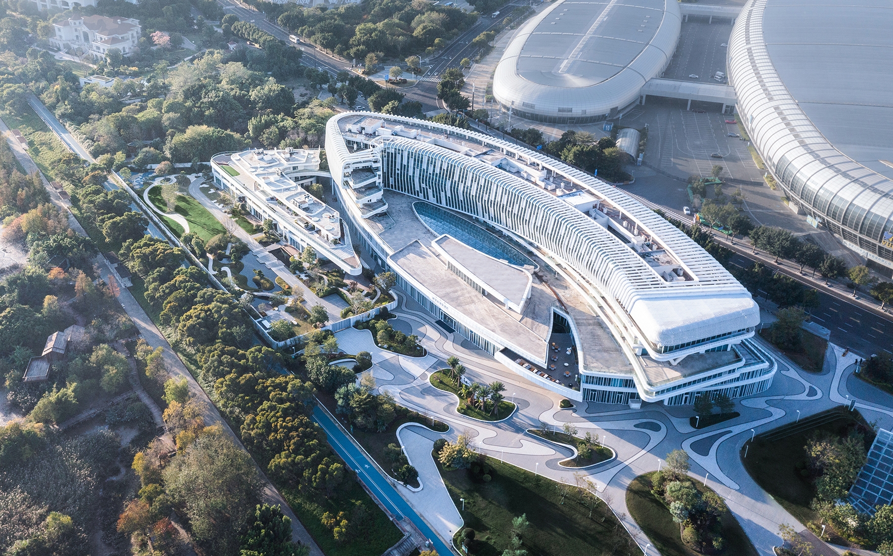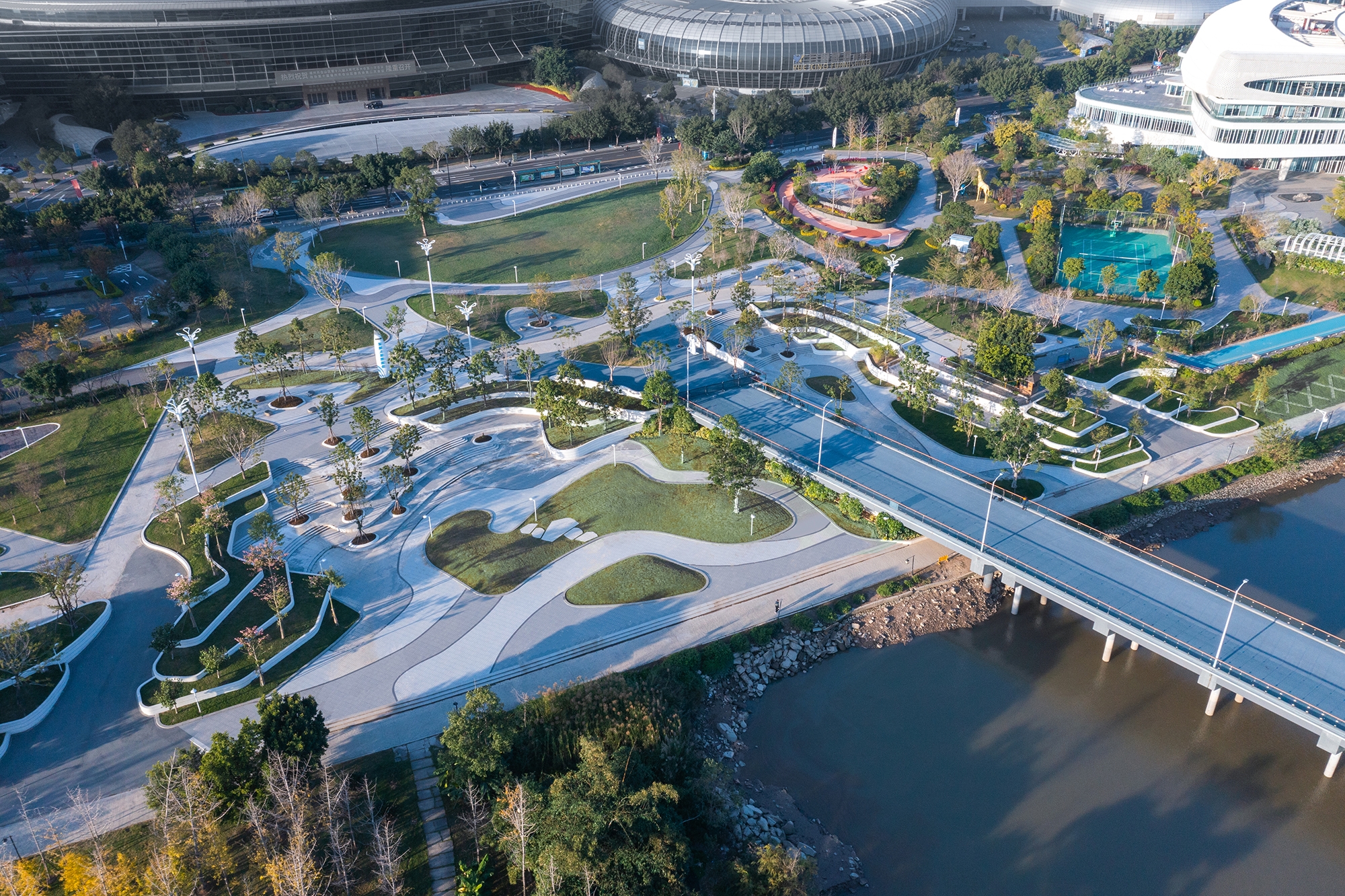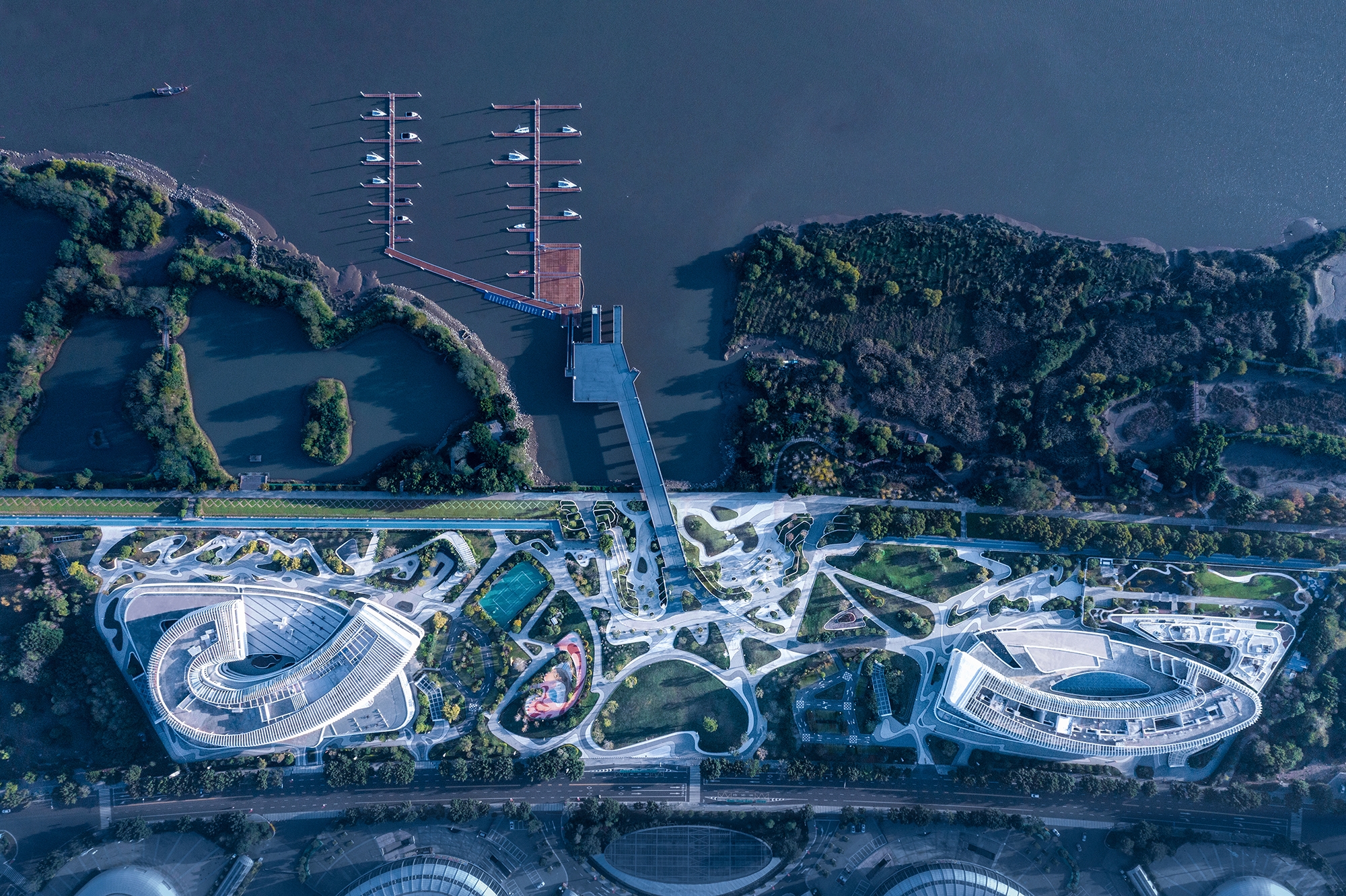The project boasts two primary edifices, each possessing distinct characteristics: one is lively and dynamic, while the other is stationary and unchanging. These structures are linked to the marina by way of a sleek, streamlined plaza situated at the heart of the project. The landscape design is based on a concept known as the "Liquid Landscape," which draws inspiration from the beauty of hydrodynamics.