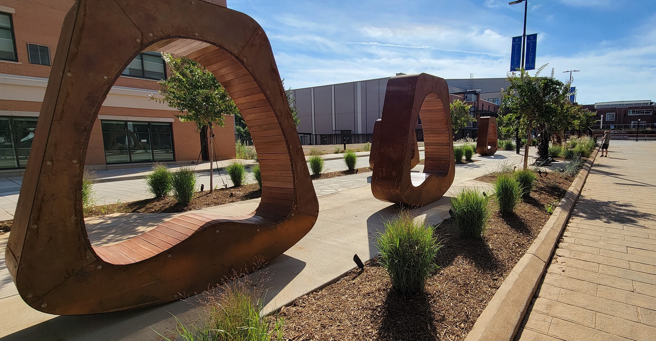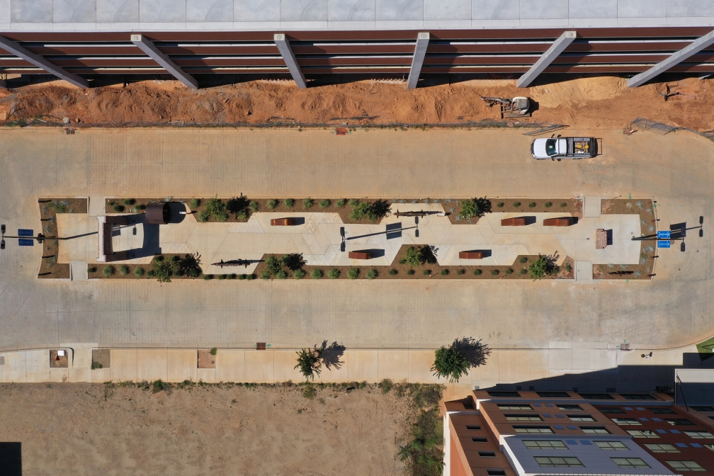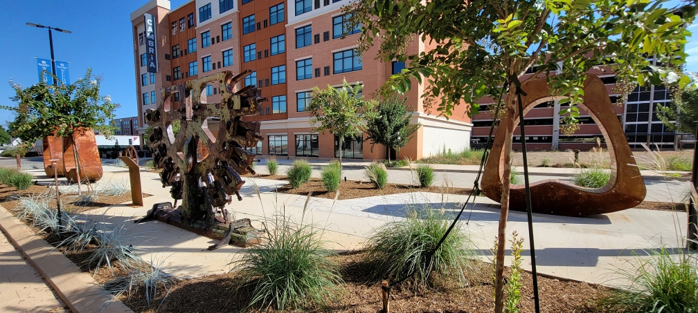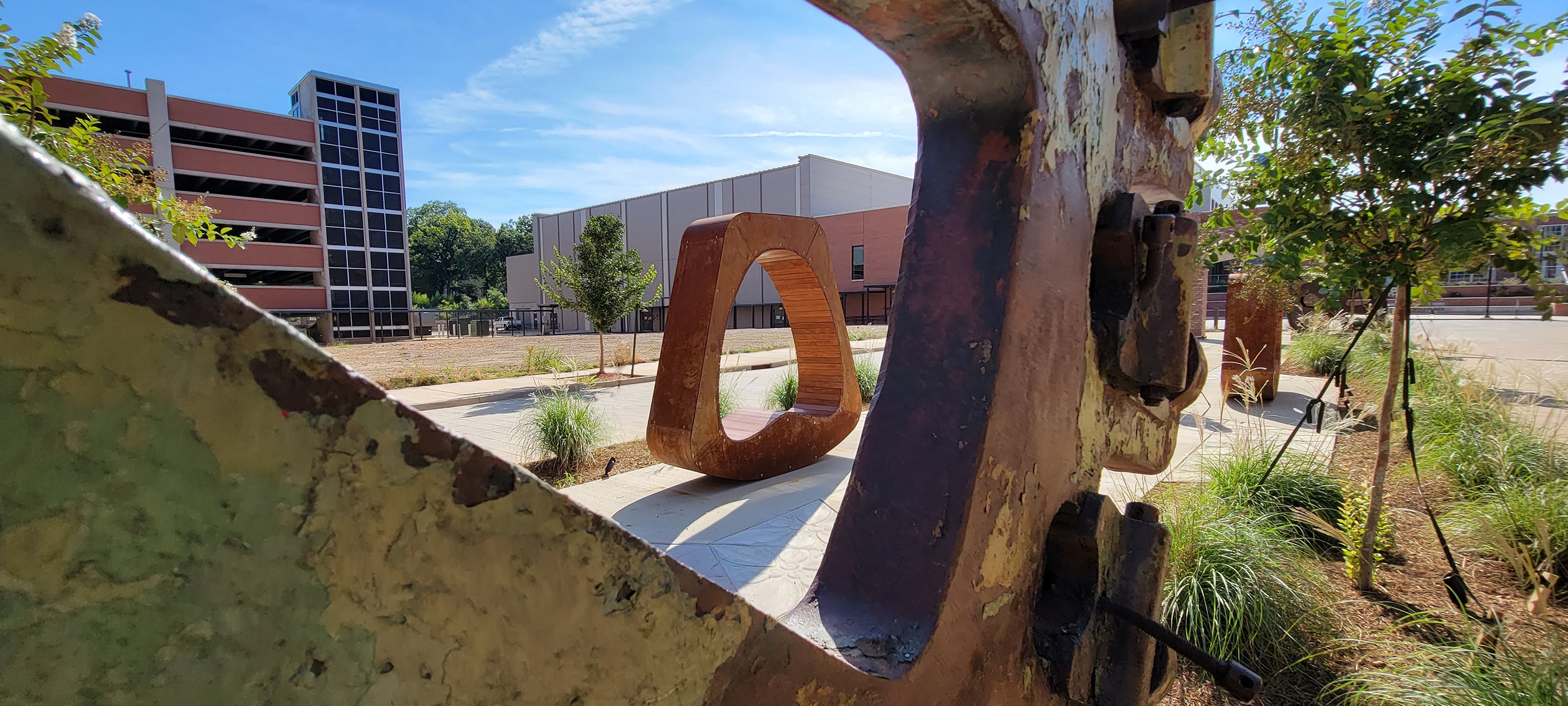 The Bleachery Heritage Project is a commemorate plaza located on the site of the former Rock Hill Printing and Finishing Company, known locally as “The Bleachery”, which was once the largest textile printing and finishing company in the world. The project provides a living memorial: to the bleachery, its employees, and the sense of community that surrounded it, while also forming a new urban room for the city, a plaza that becomes a monument to everyday life within a memory landscape. It transforms a former median into a linear park providing a planted buffer that separates pedestrians from vehicular traffic. Patterns once printed on fabric at the Bleachery are stamped along the concrete pathway lined with interpretive objects including historic roller printing machine parts, interactive rocking chairs resembling those machines, signage with QR codes linking to an audio record of stories, and a former bleachery building archway standing anew as a gateway entrance to shared public space. At its best, the plaza tries to serve its constituents, while telling stories of the past, inviting visitors to enter and experience them, to slow down and notice what once was.