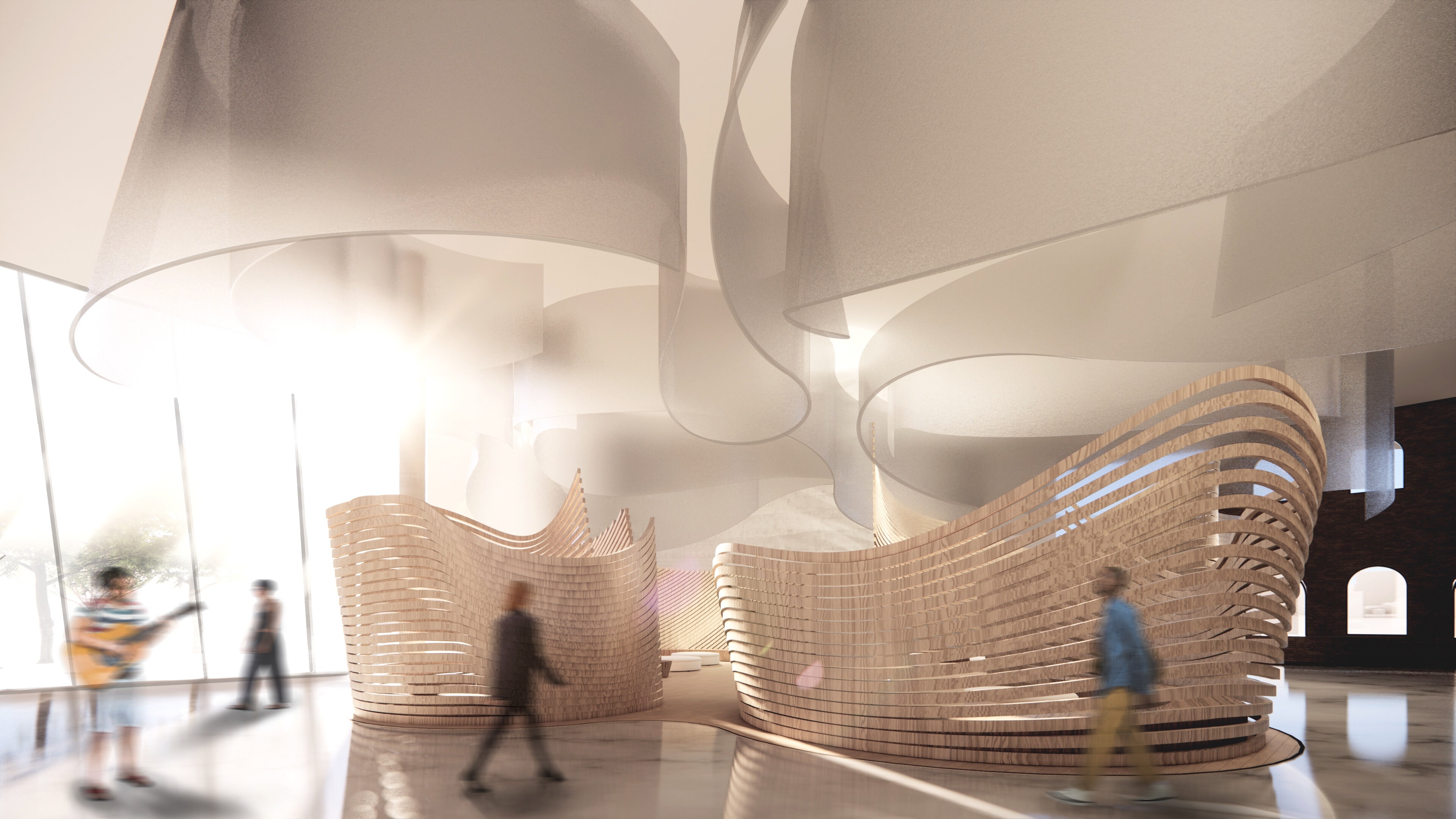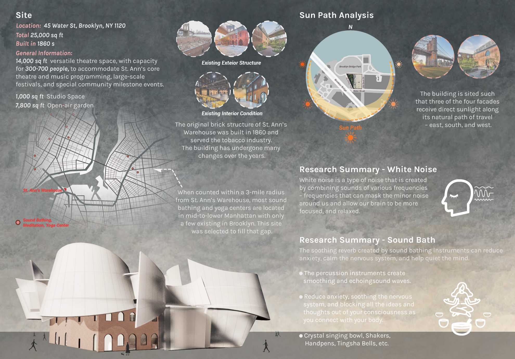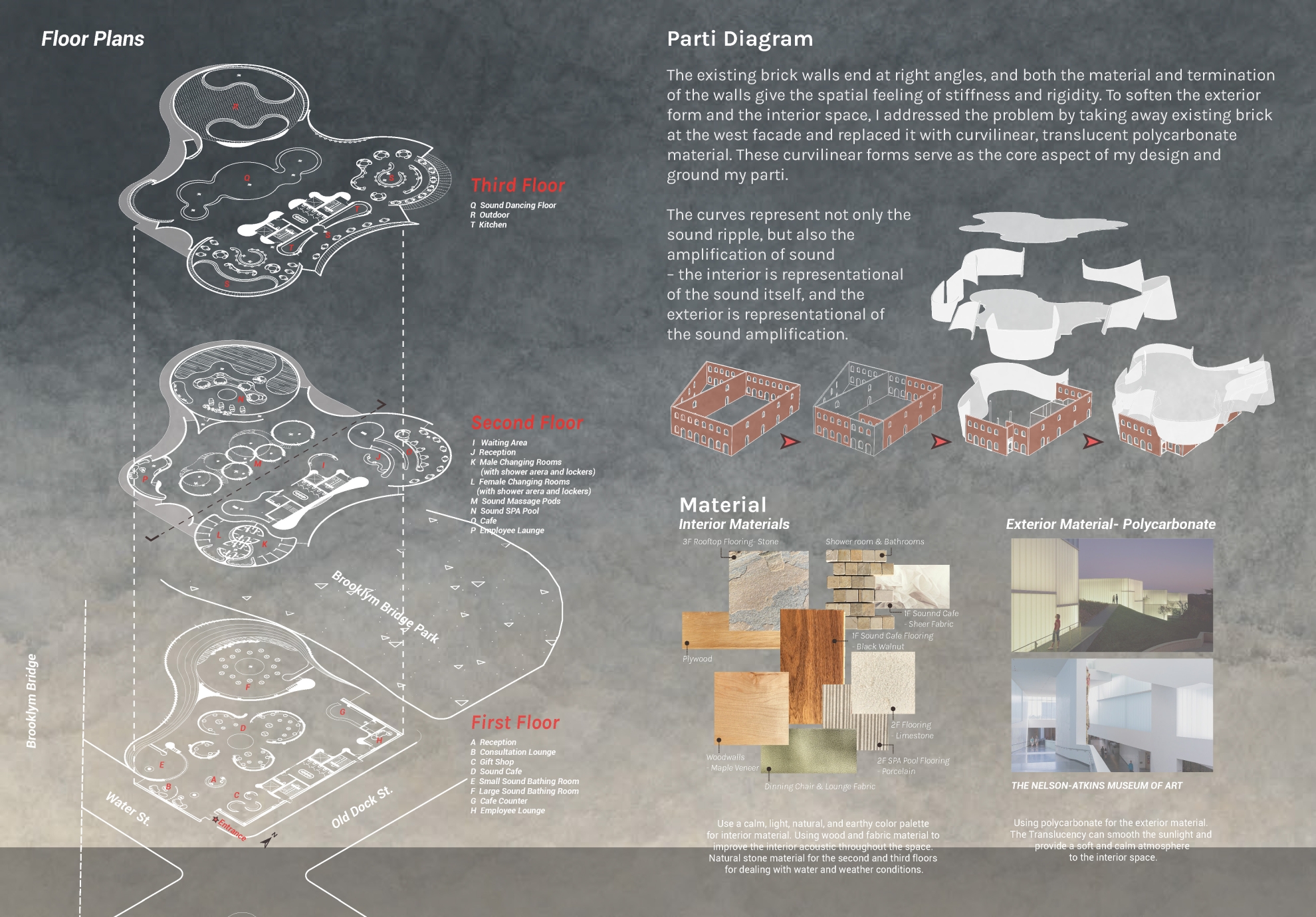To soften the exterior form and the interior space, I addressed the problem by taking away existing brick at the west facade and replaced it with curvilinear, translucent polycarbonate material. These curvilinear forms serve as the core aspect of my design and ground my parti.