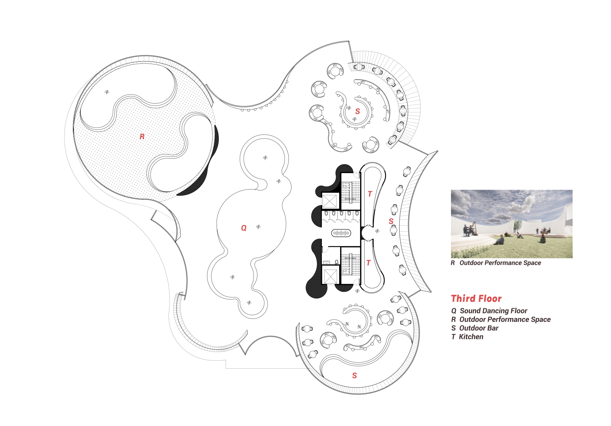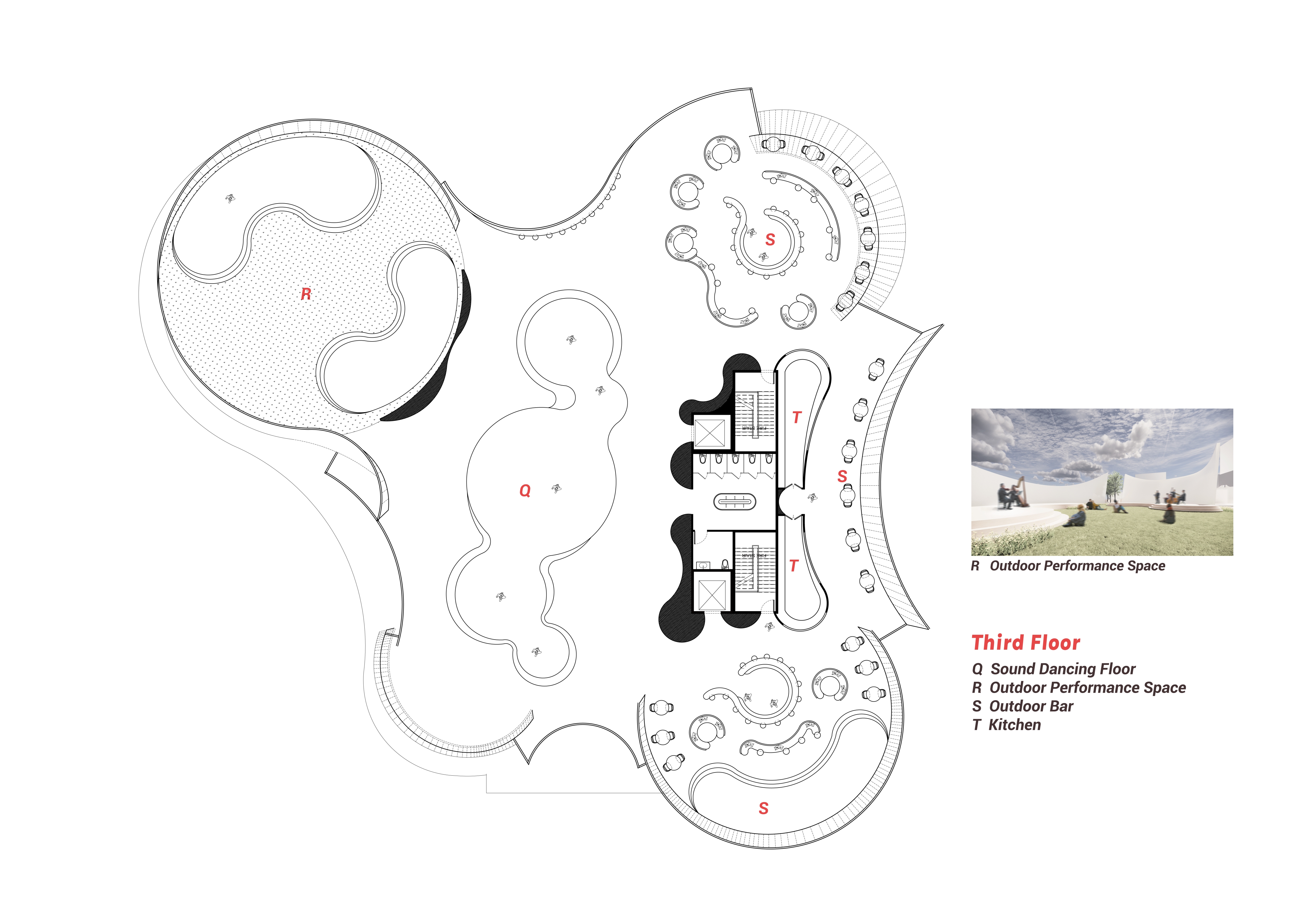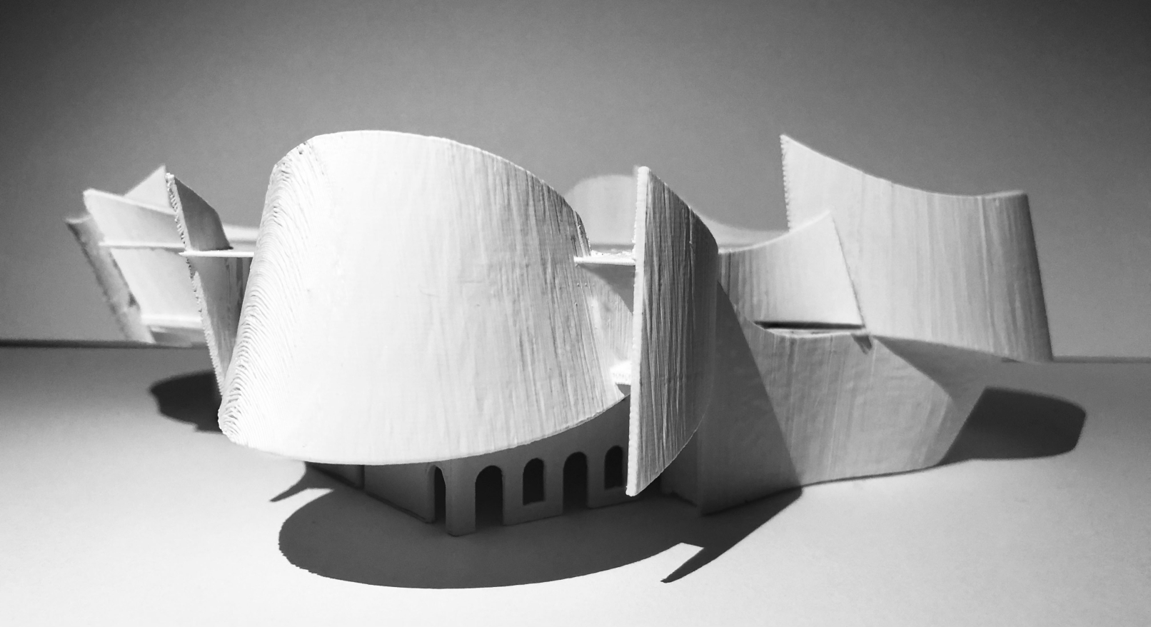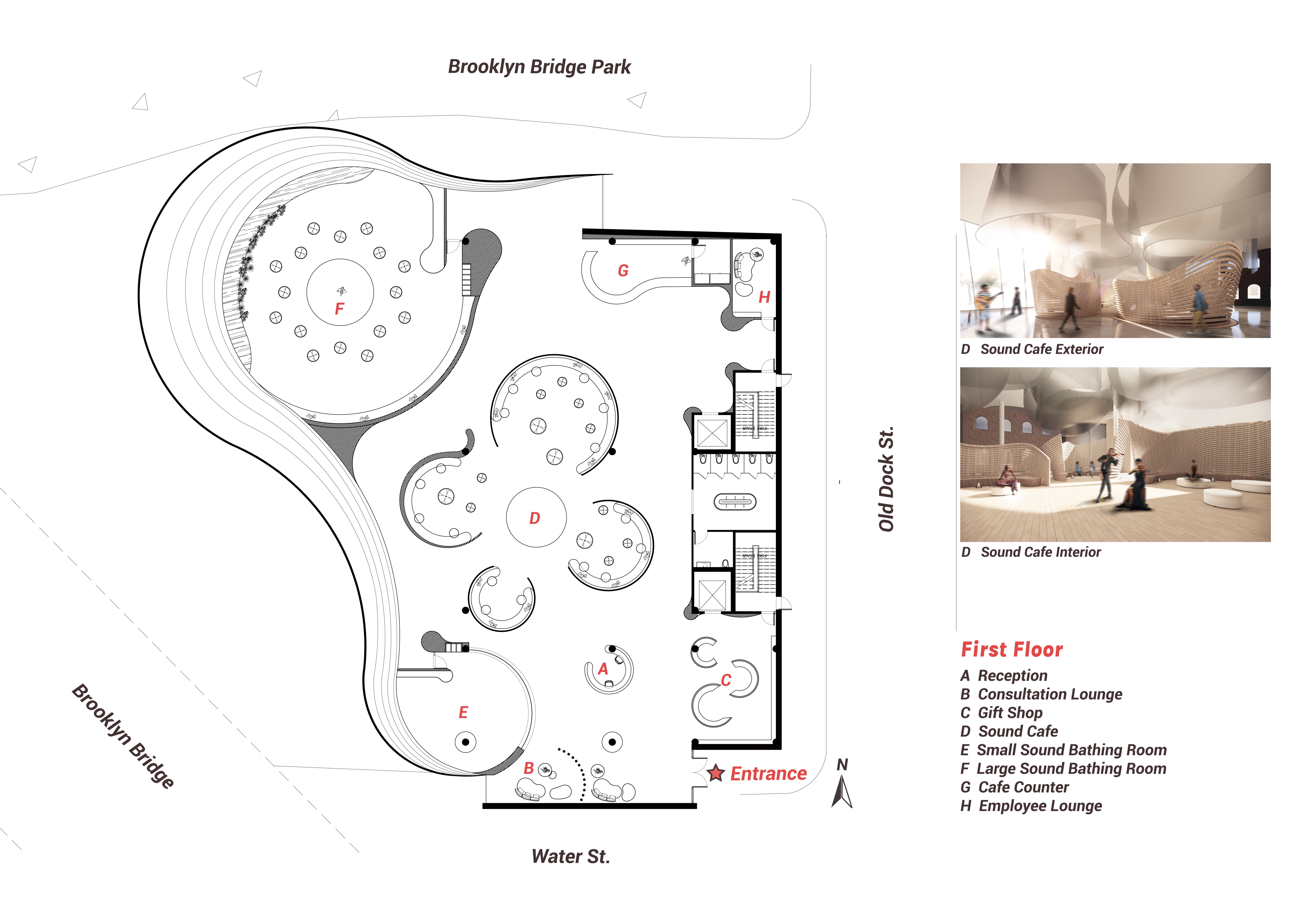 To soften the exterior form and the interior space, I addressed the problem by taking away existing brick at the west facade and replaced it with curvilinear, translucent polycarbonate material. These curvilinear forms serve as the core aspect of my design and ground my parti.