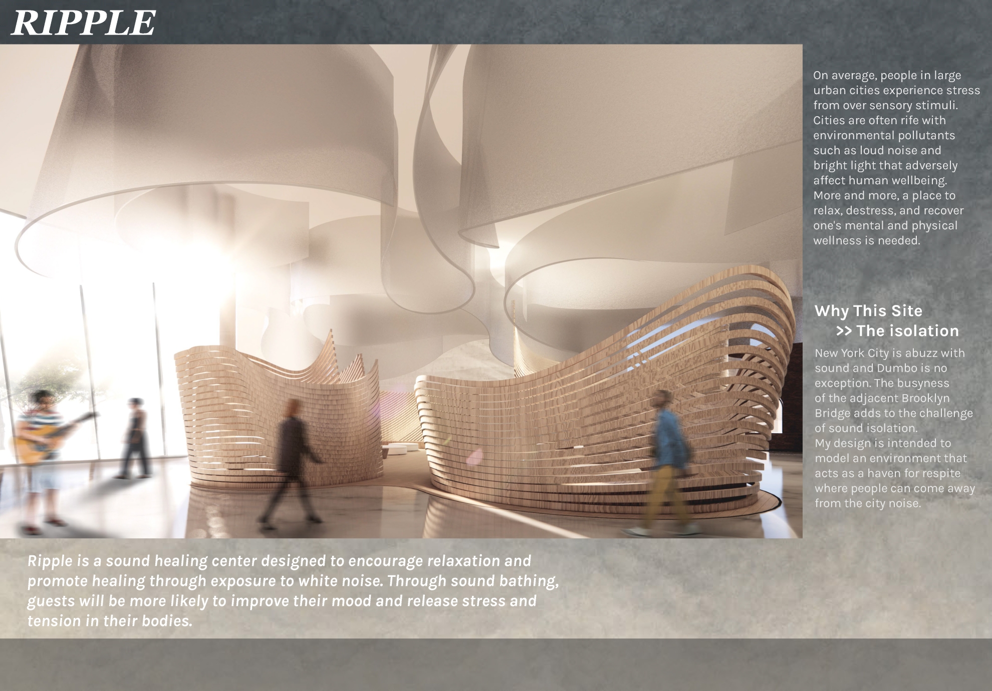 Ripple is a sound healing center designed to encourage relaxation and promote healing through exposure to white noise. Through sound bathing, guests will be more likely to improve their mood and release stress and tension in their bodies.