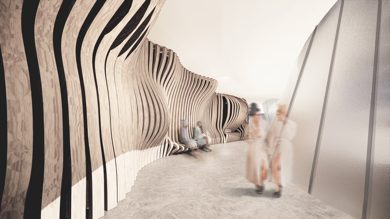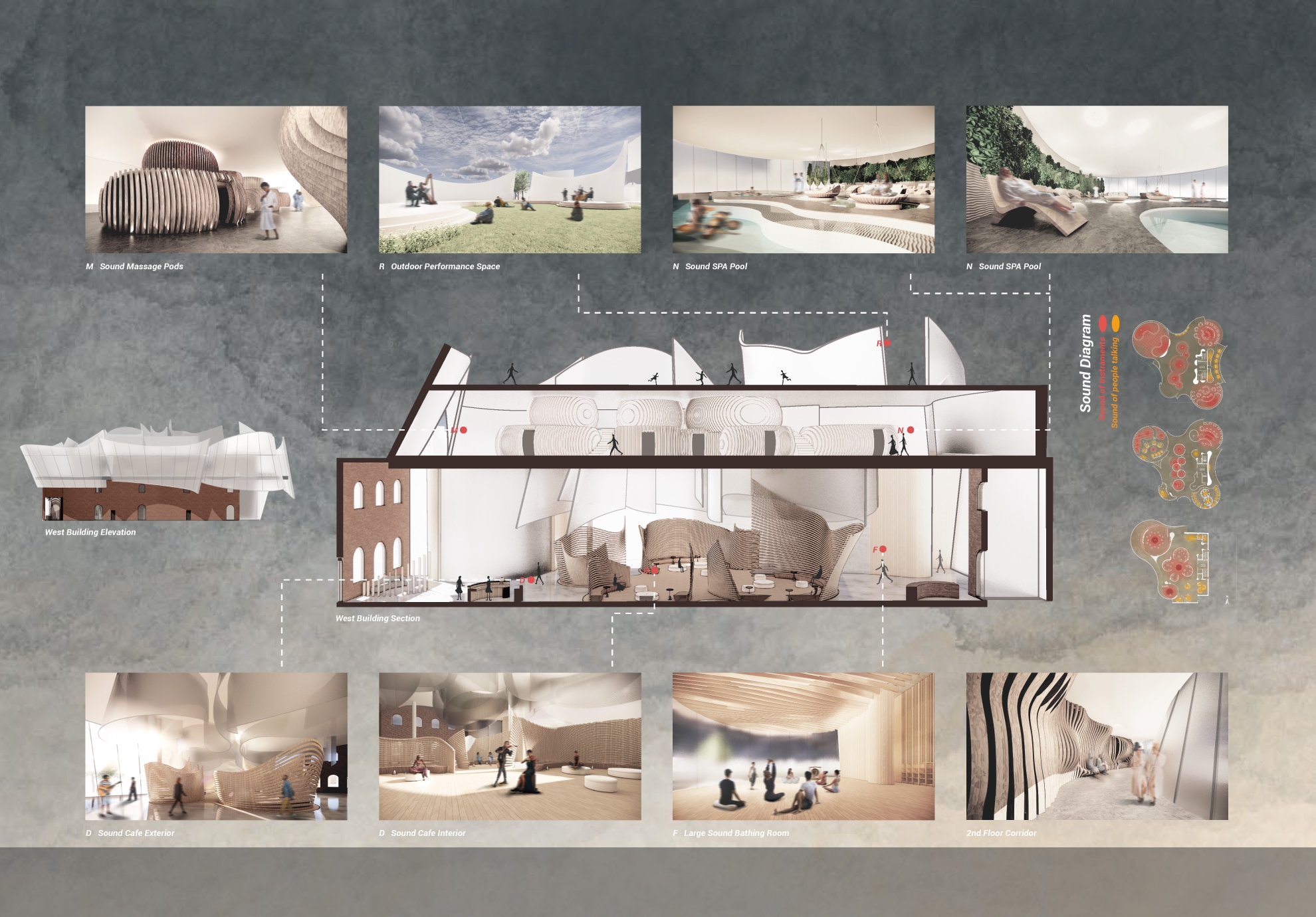 The curves represent not only the sound ripple, but also the amplification of sound– the interior is representational of the sound itself, and the exterior is representational of the sound amplification.