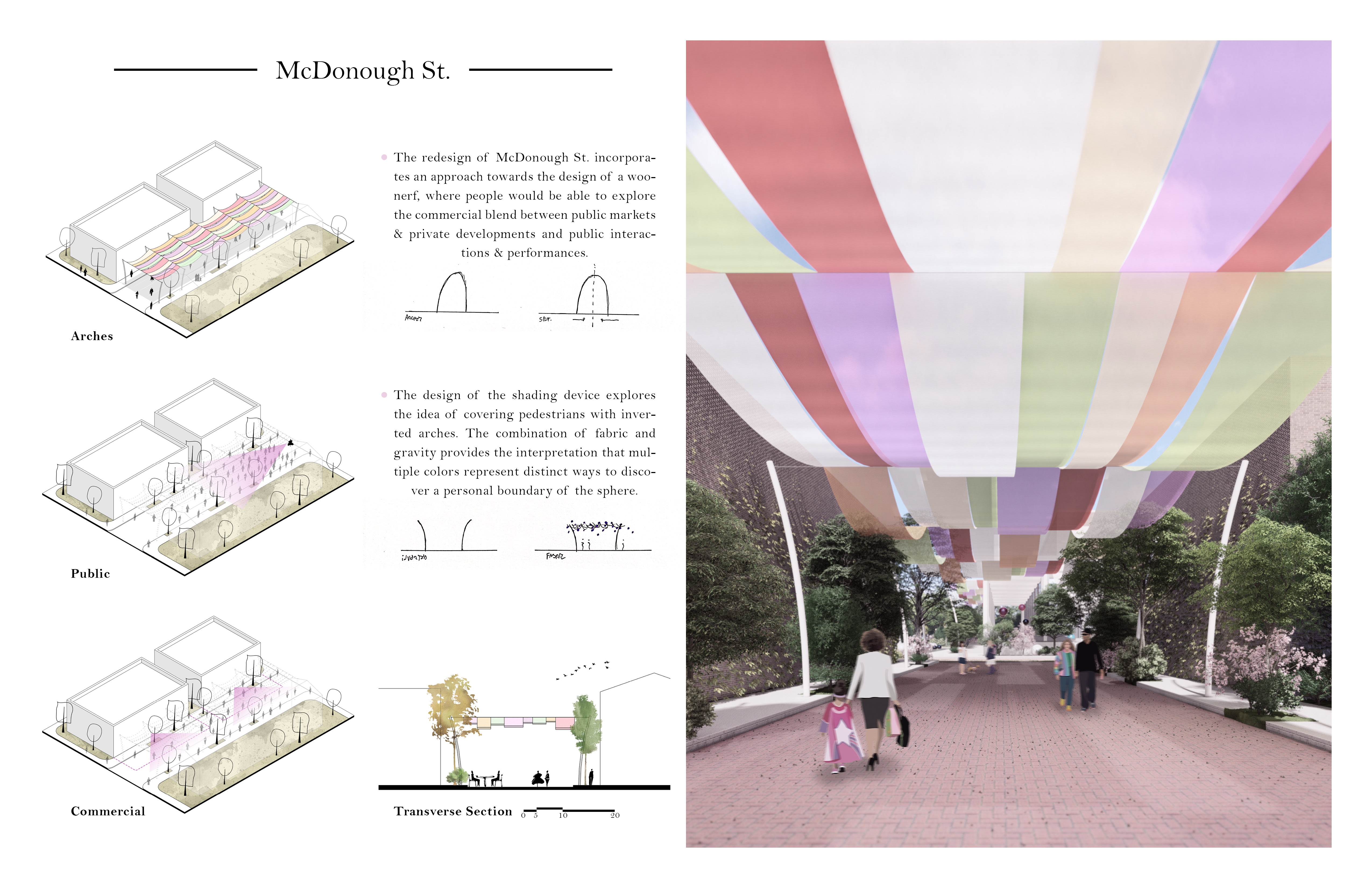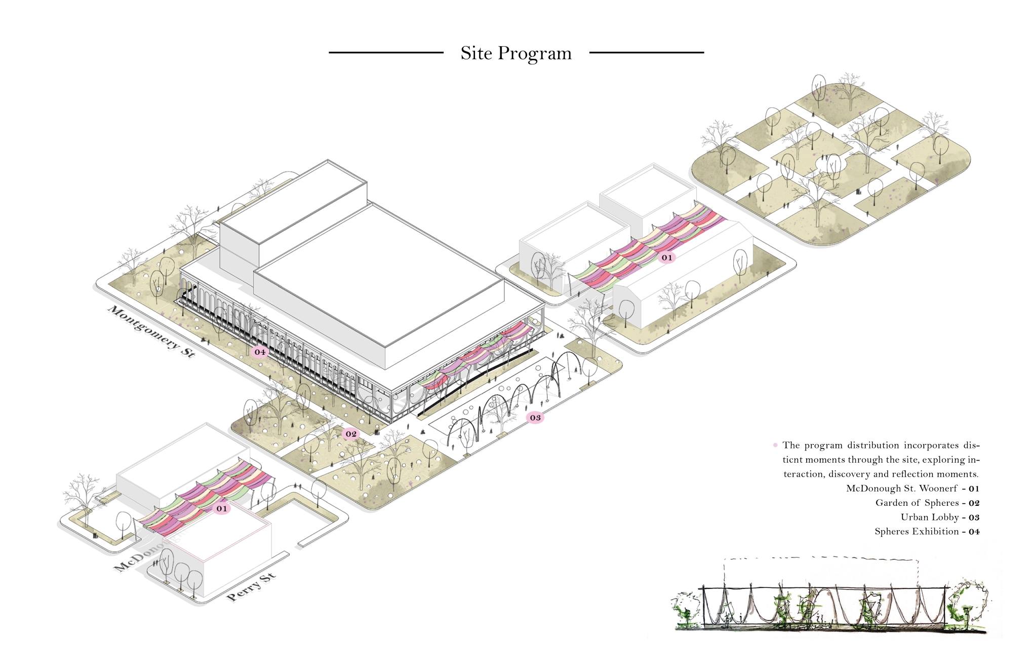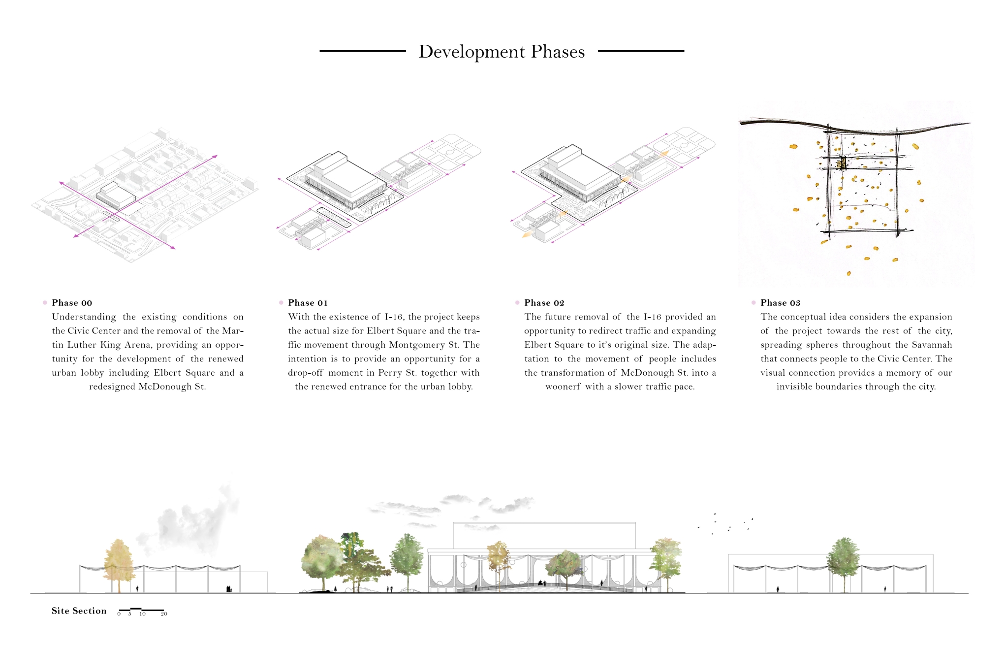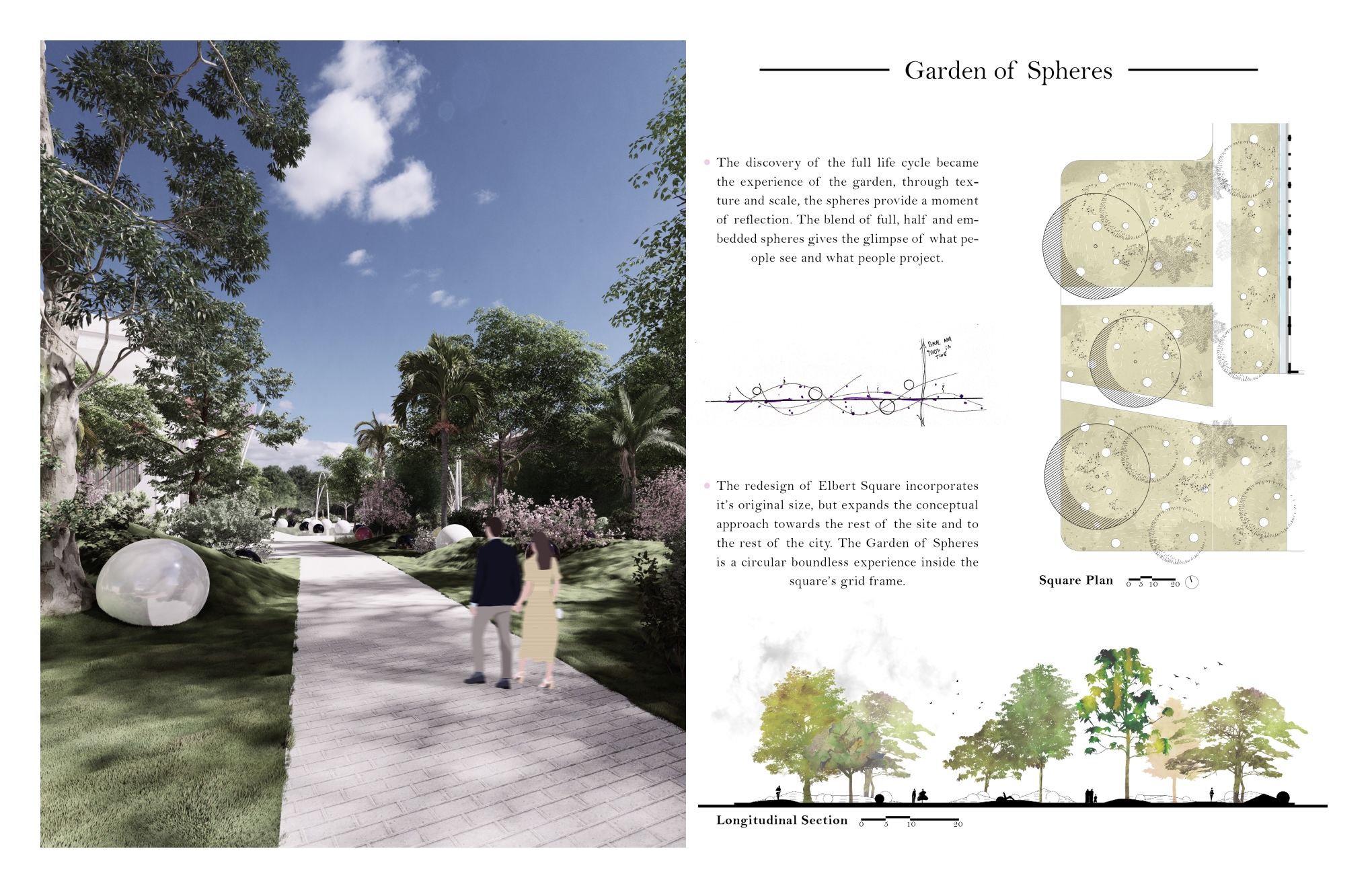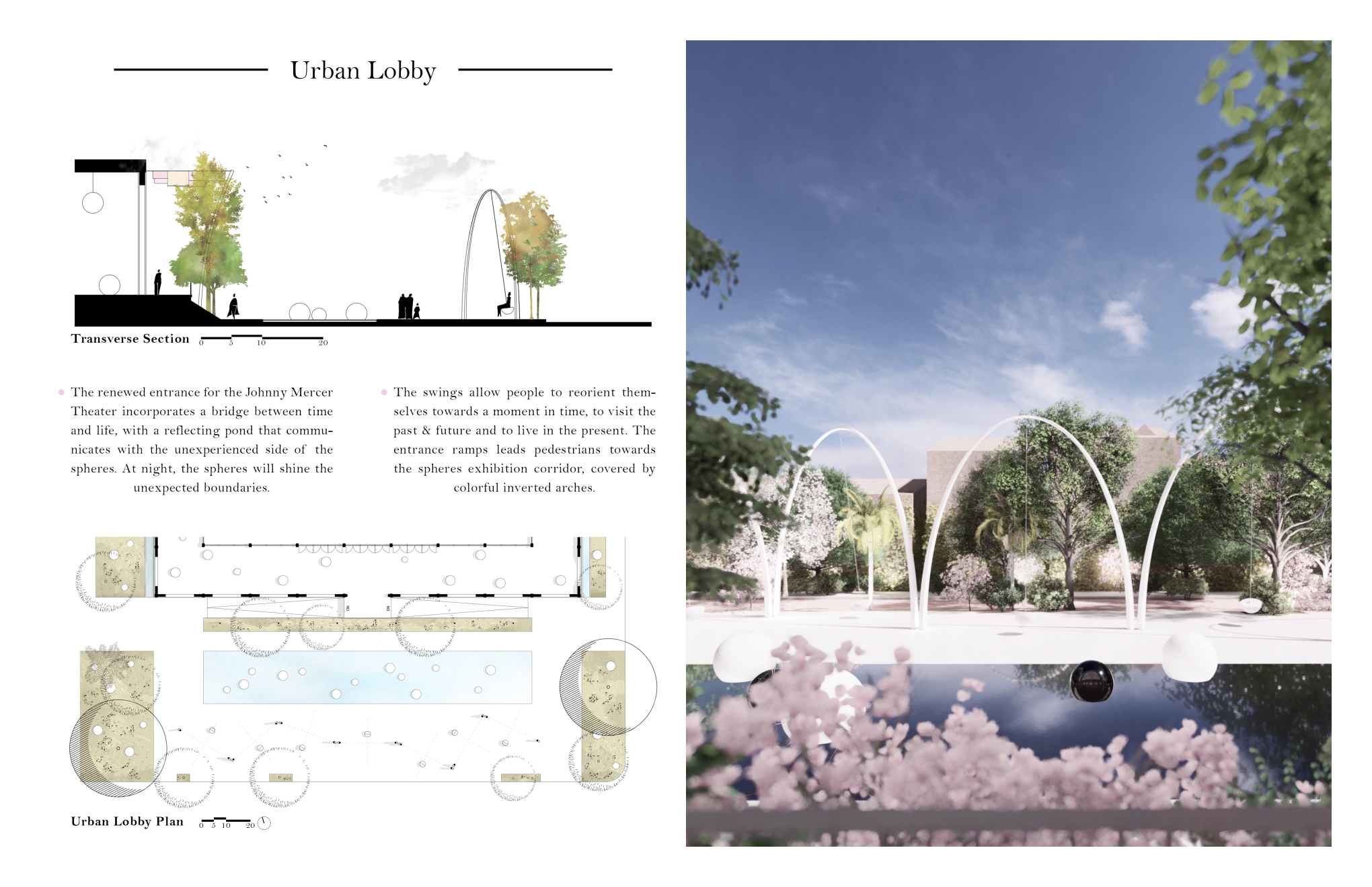 The project consists with the redesign of Elbert Square and the adaptation of the renewed entrance for the Jonny Mercer Theater as an urban lobby for the city of Savannah. The program incorporates the design of a woonerf on McDonough St, a garden of spheres on Elbert Square and interactive swings as the urban lobby for the theater. The project’s distribution has the purpose to be a connecting bridge between the existing conditions towards a moment of celebration, a moment that celebrates life and time.