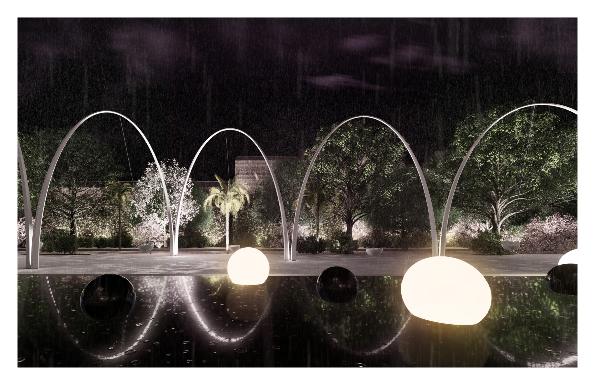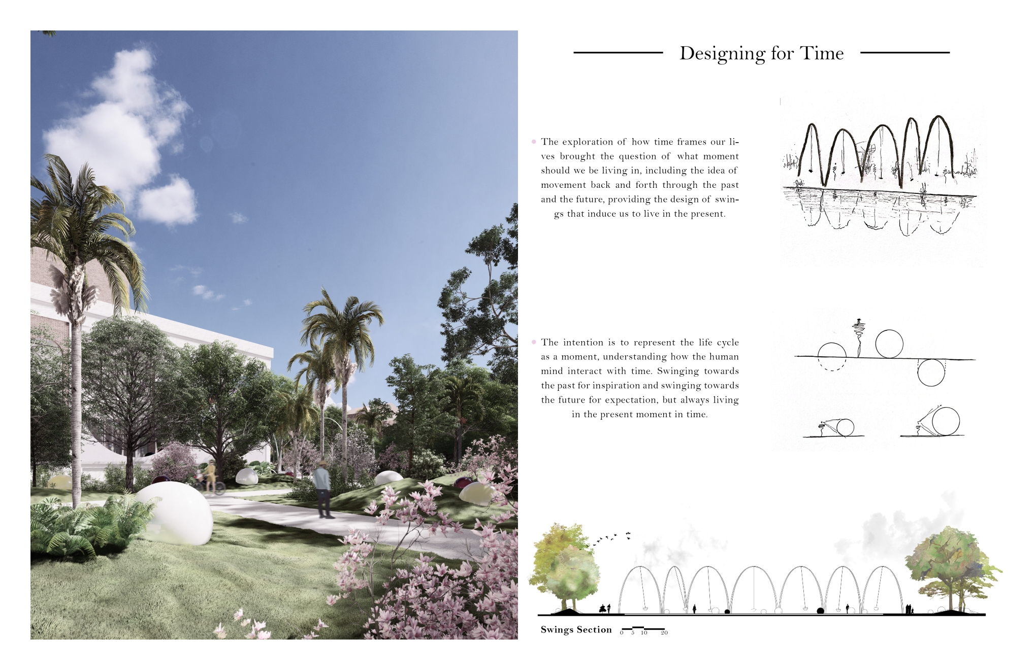 Octavarium is a project that celebrates life, providing a moment of reflection of how humans live around a sphere. The intention is to communicate the life cycle through spheres & time through swings, with the understanding that people should swing back and forth in time but live in the present moment.