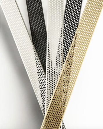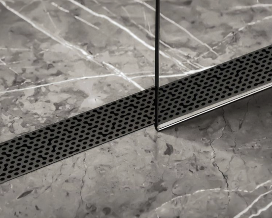 The Adhesion linear drain is inspired by the science of adhesion, where water droplets stick to a variety of surfaces to form unique patterns. To develop this abstract aquatic visual, the Gensler design team started by pouring water on a selection of luxurious surfaces to observe how the droplets moved and gathered. The modern pattern that evolved from this exploration has an even distribution of irregularity to create a look that’s at once random and precise. While the connected dots are present throughout the pattern, the repeat is masked to prevent a tiling effect.