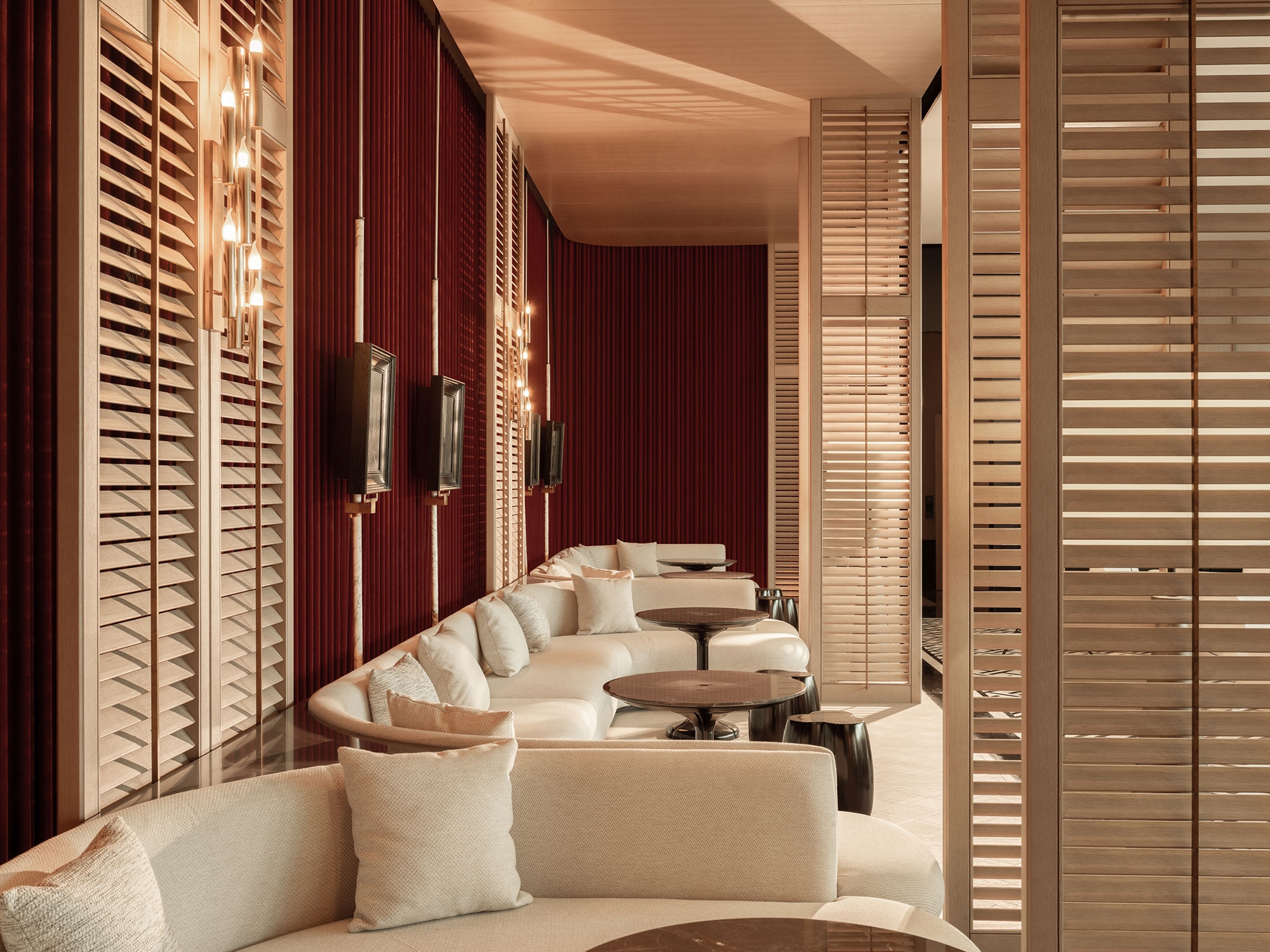 Lighting is a crucial medium for conveying spatial emotions. As visual focal points shift, the interplay of light creates a narrative-rich ambiance. Behind the vintage-style shutters, red velvet drapes decorate the walls, perfectly blending softness and rigidity with their sturdy backing.