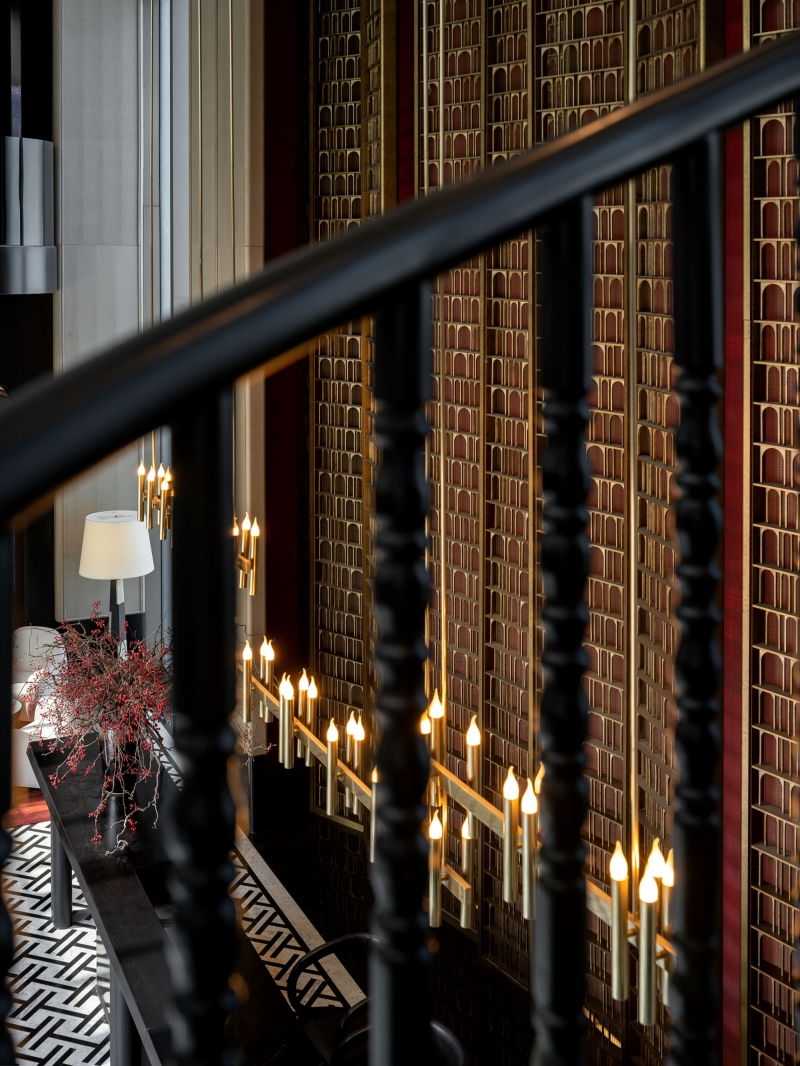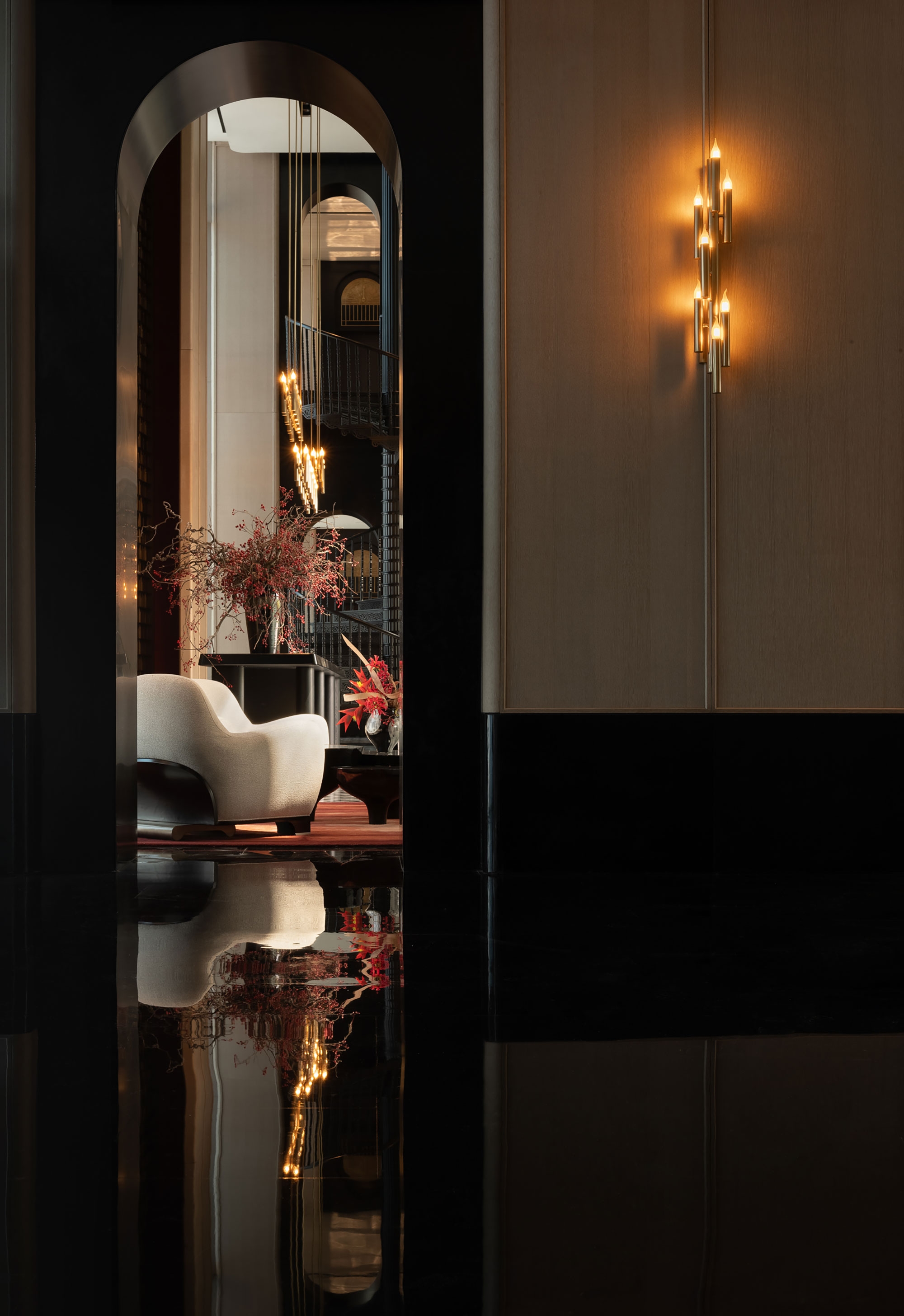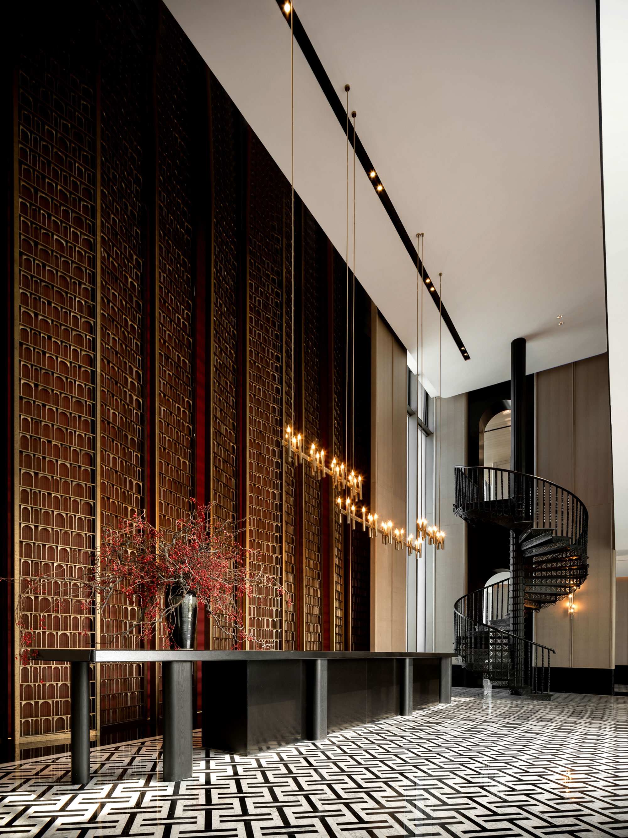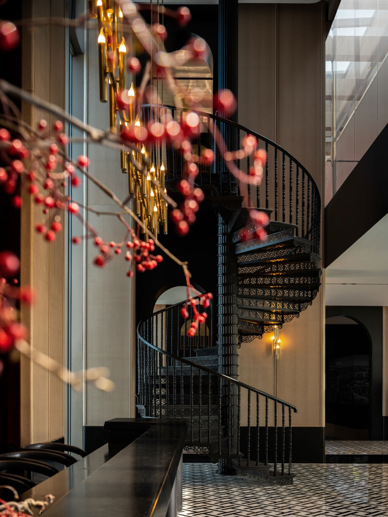The black wrought iron staircase, imbued with vintage memories, contrasts beautifully with the patterned stone flooring, showcasing the unique modernity and style of "Haipai" culture. As guests ascend the spiral staircase, they experience the space's charm from every angle through the turns, progressions, stops, and pauses. The staircase itself becomes a distinctive scenic element.