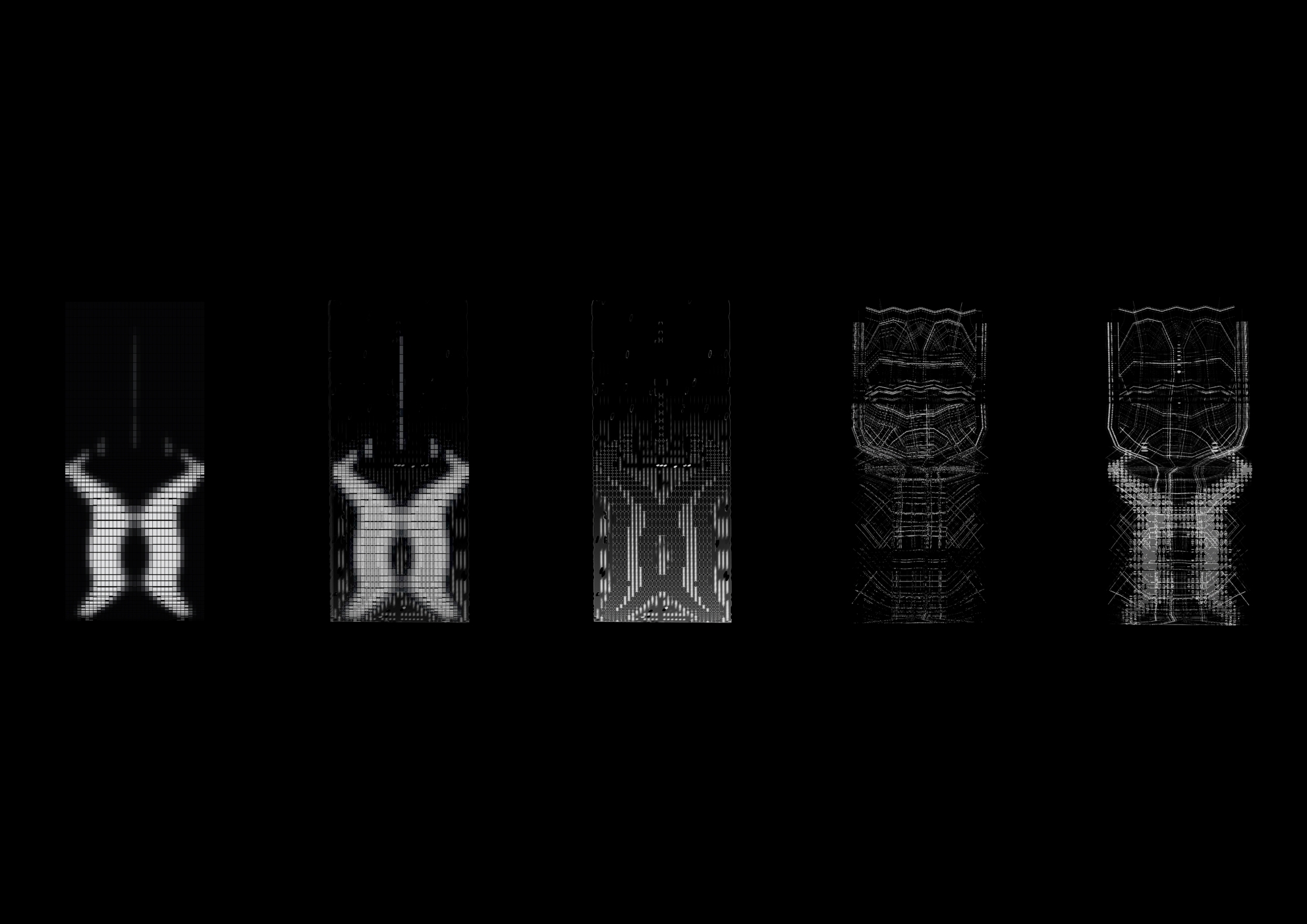The structural are arranged following principal stress lines and change their thickness and topology following a topology optimization map. A sequence of topology optimisation process iterations. This is based on loads and structure constraint inputs for the analysis. A distributed load of was applied over the anticlastic shell, and fixed supports were assumed on the two edges lying on the ground.