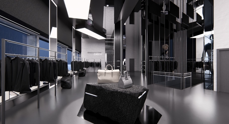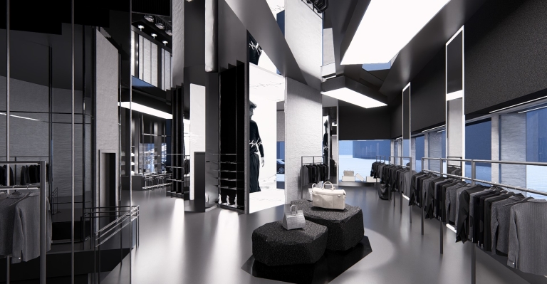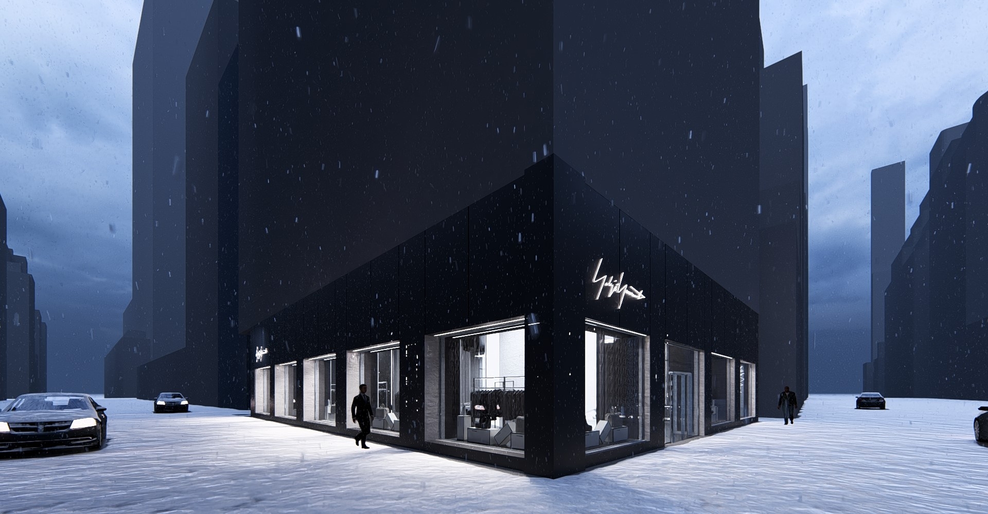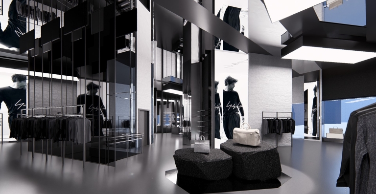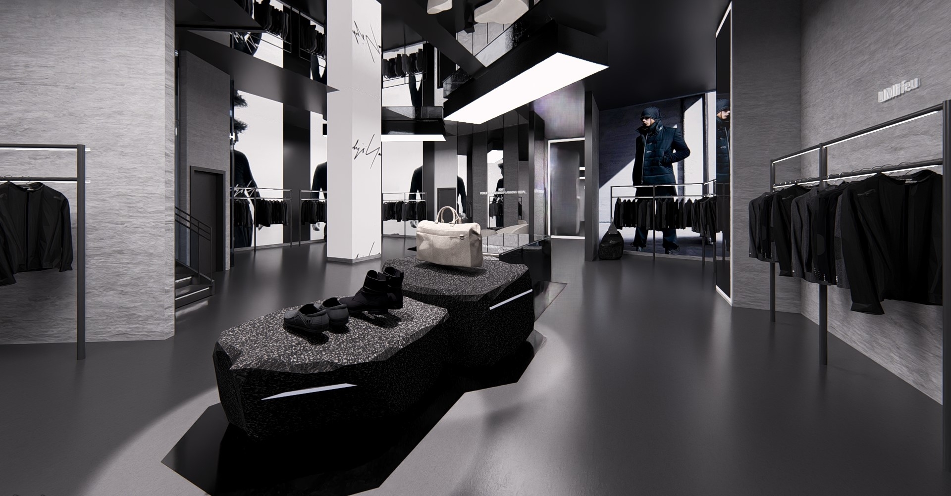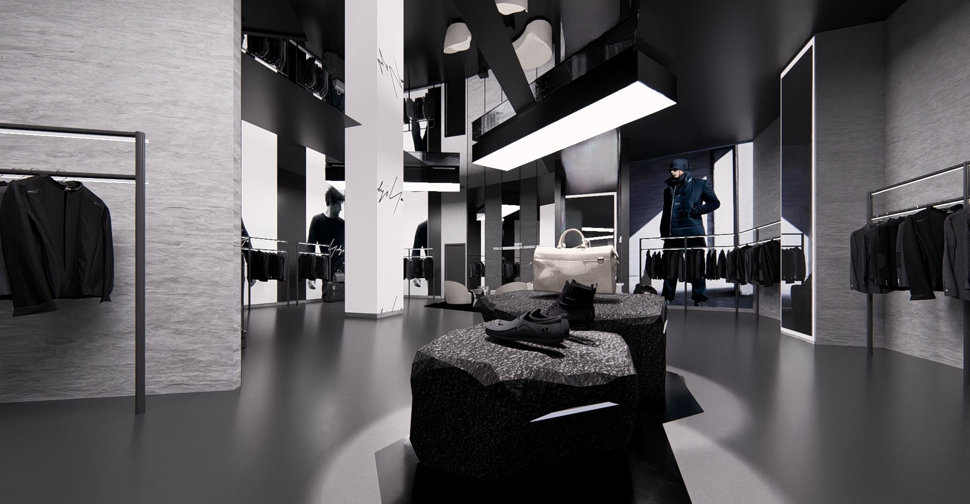 The design encapsulates his avant-garde fashion ethos, featuring deconstructivism, asymmetry, and a gender-neutral allure. Tailoring for art-conscious individuals as the target audience, the store reflects Yohji's intellectual, dark, and rebel style through monochromatic palettes and film noir aesthetics. Seamlessly integrating Japanese tradition, Western elements, and architectural inspirations from Lebbeus Woods and the California Light and Space movement, particularly Robert Irwin's spatial concepts, the retail space embodies Yohji's confidence, strength and artistic rebellion.